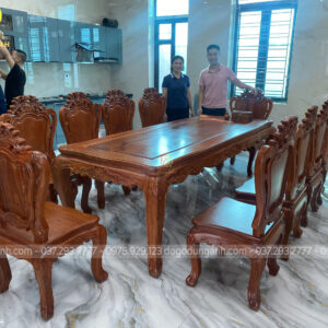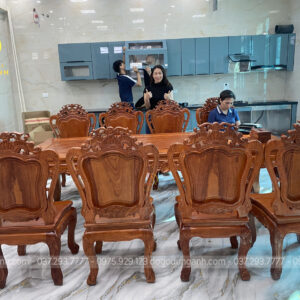 Với mong muốn tìm một bộ bàn ghế ăn chất lượng và xứng tầm đẳng cấp cho không gian bếp của gia đình, vợ chồng anh phương phước tại TP. Bắc Ninh đã dành thời gian tìm hiểu và trực tiếp đến Xưởng Đồ Gỗ Dũng Anh. Tại đây, sau khi được đội ngũ tư vấn tận tình, anh chị đã lựa chọn bộ sản phẩm bàn ăn gồm 10 ghế Hoàng Gia kết hợp bàn củ lạc sang trọng – tất cả đều được chế tác từ gỗ Hương Đá cao cấp. Sự lựa chọn này không chỉ phù hợp với không gian nội thất mà còn thể hiện gu thẩm mỹ tinh tế của gia chủ.