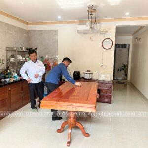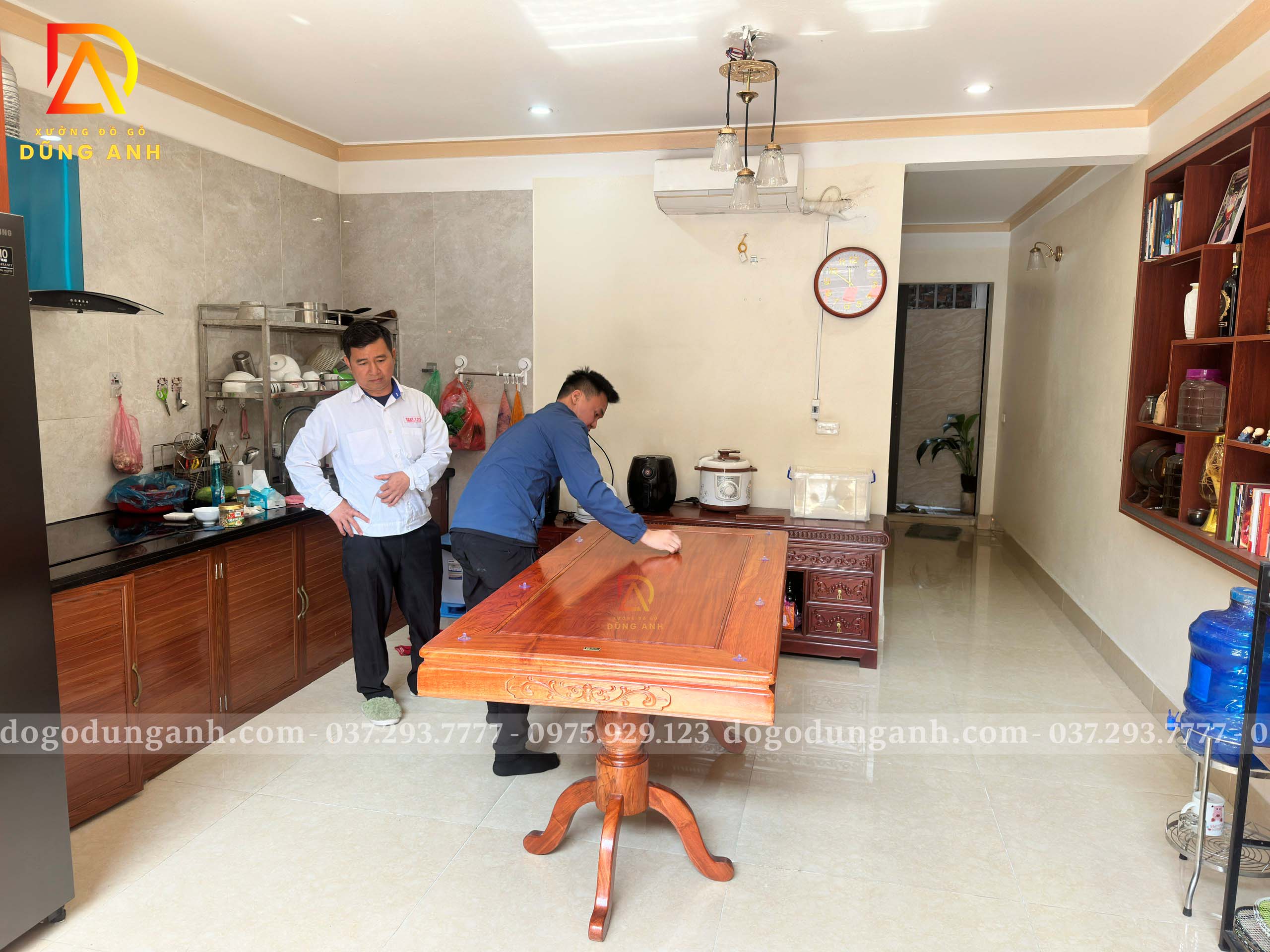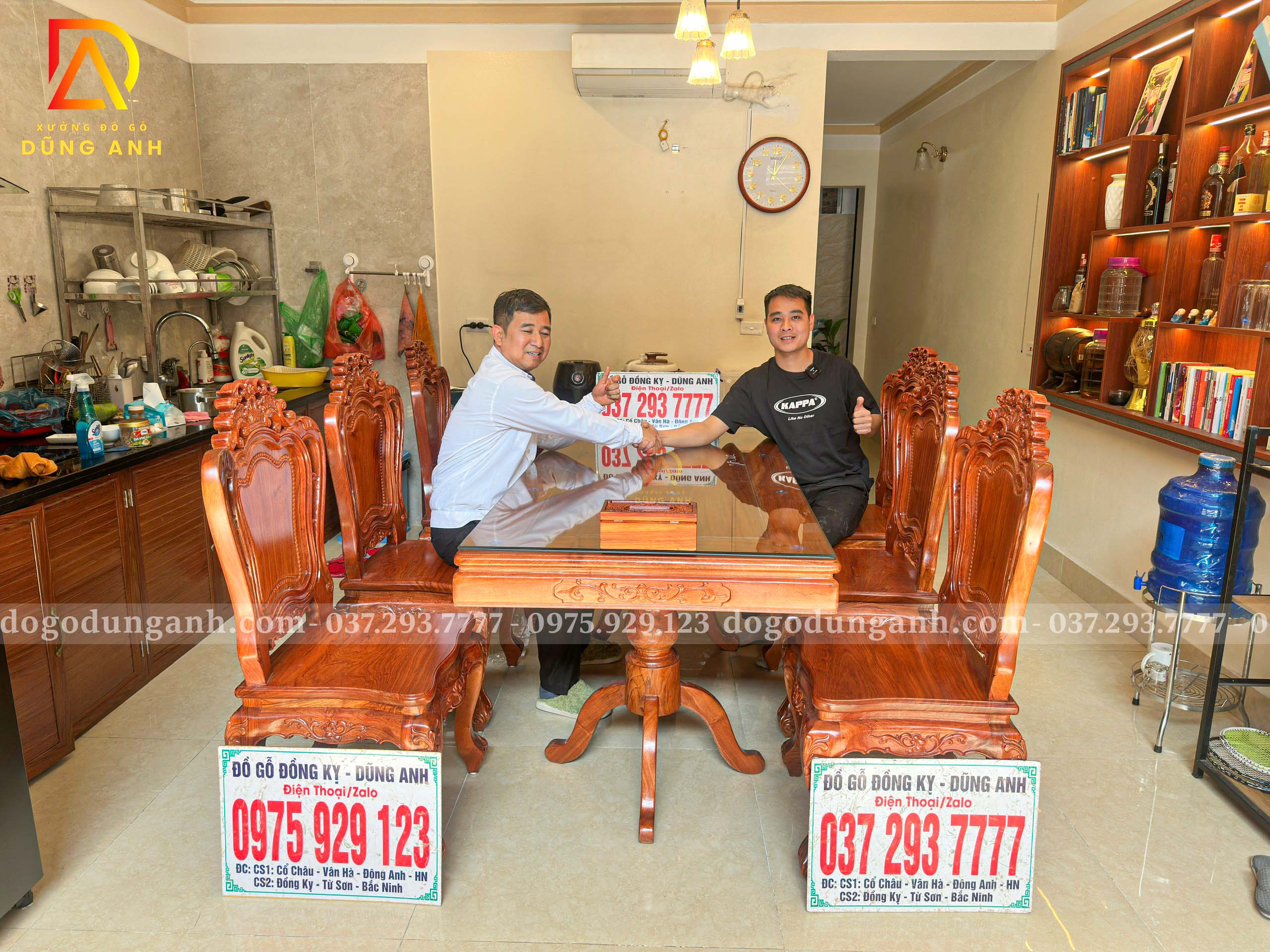 Quá trình bàn giao bộ bàn ghế ăn Hoàng Gia – bàn chữ nhật, ghế Louis cho anh Trợn tại Sóc Sơn đã diễn ra suôn sẻ và trọn vẹn. Từng công đoạn từ vận chuyển, lắp đặt đến hoàn thiện đều được thực hiện cẩn thận, tỉ mỉ nhằm đảm bảo bộ sản phẩm giữ trọn vẻ đẹp nguyên bản. Được chế tác từ gỗ Hương Đá tự nhiên cao cấp, bộ bàn ghế nổi bật với những đường nét chạm khắc tinh xảo, mang đậm phong cách hoàng gia sang trọng. Khi hoàn thiện và kê vào không gian phòng ăn, sắc gỗ cánh gián ấm áp kết hợp cùng thiết kế bàn chữ nhật cân đối đã mang đến cảm giác bề thế, ấm cúng và đẳng cấp, nhận được sự hài lòng và đánh giá cao từ gia đình anh Trợn..