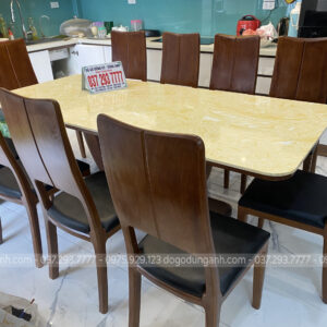 - Mặt bàn ăn là mặt đá bền đẹp, bề ngoài được phủ lớp nhựa hoa văn bóng sang trọng.