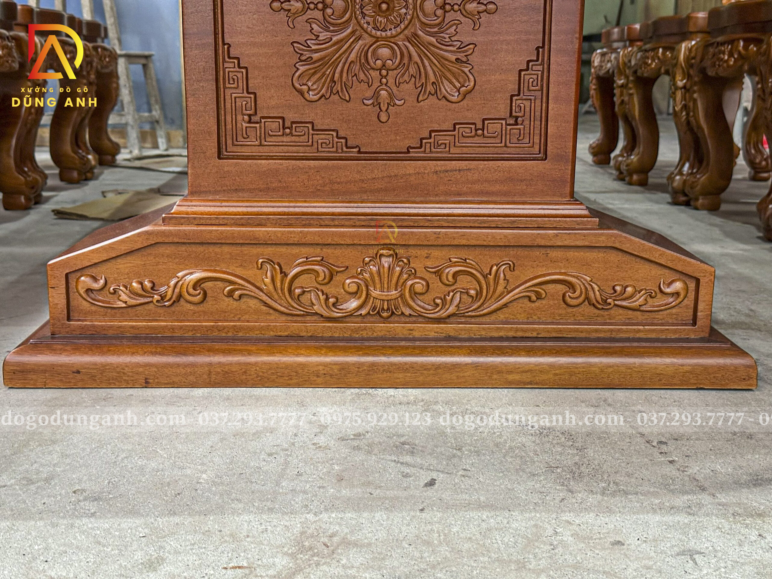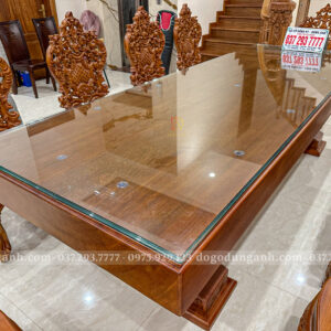 Chân bàn được chạm khắc cực kỳ tỉ mỉ và sắc nét, thể hiện trình độ tay nghề cao của những người thợ lành nghề đã gắn bó hàng chục năm với nghề mộc truyền thống. Mỗi đường đục, mỗi hoa văn đều có hồn và mang chiều sâu nghệ thuật