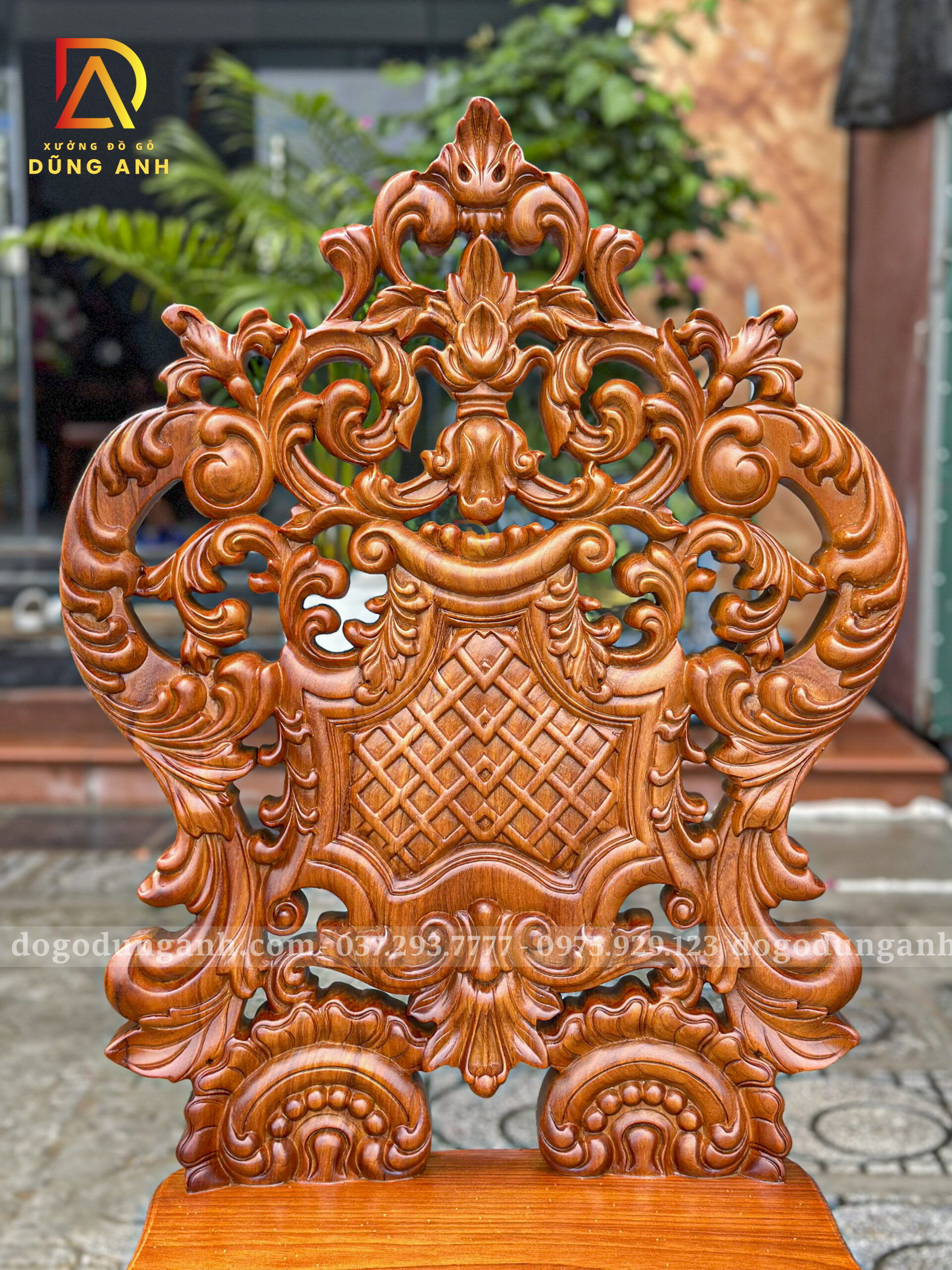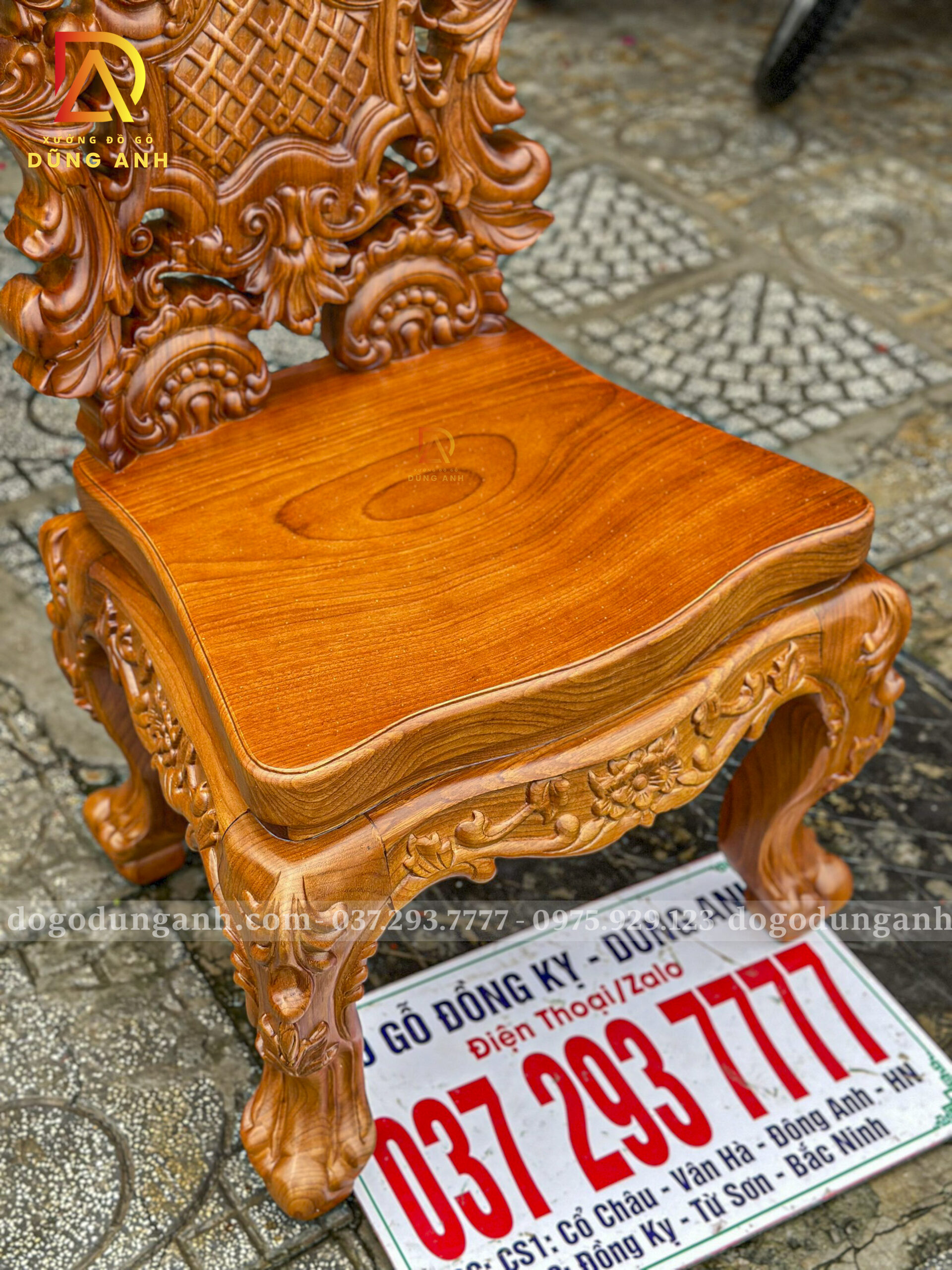 Từng chi tiết chạm trổ trên lưng ghế đều được điêu khắc tỉ mỉ theo phong cách hoàng gia châu Âu, thể hiện tay nghề điêu luyện của thợ mộc Đồng Kỵ. Mặt bàn dày dặn, phủ kính cường lực tăng độ sáng và giữ trọn vẹn vẻ đẹp nguyên bản của vân gỗ. Tông màu nâu đỏ ấm áp của gỗ Gõ Đỏ kết hợp hài hòa với nền đá trắng, tạo nên sự đối lập đầy tinh tế giữa hiện đại và cổ điển