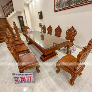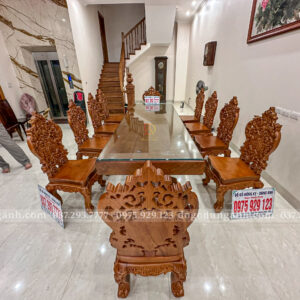 Bước vào không gian này, người ta lập tức ấn tượng bởi vẻ đẹp quyền quý và tinh tế mà bộ bàn ghế Louis Hoàng Gia Luxury mang lại. Được chế tác hoàn toàn từ gỗ Gõ Đỏ nguyên khối, bộ sản phẩm gồm 10 ghế và bàn chữ nhật toát lên vẻ bề thế, sang trọng nhưng vẫn giữ được sự ấm cúng, gần gũi đặc trưng của nội thất gỗ tự nhiên