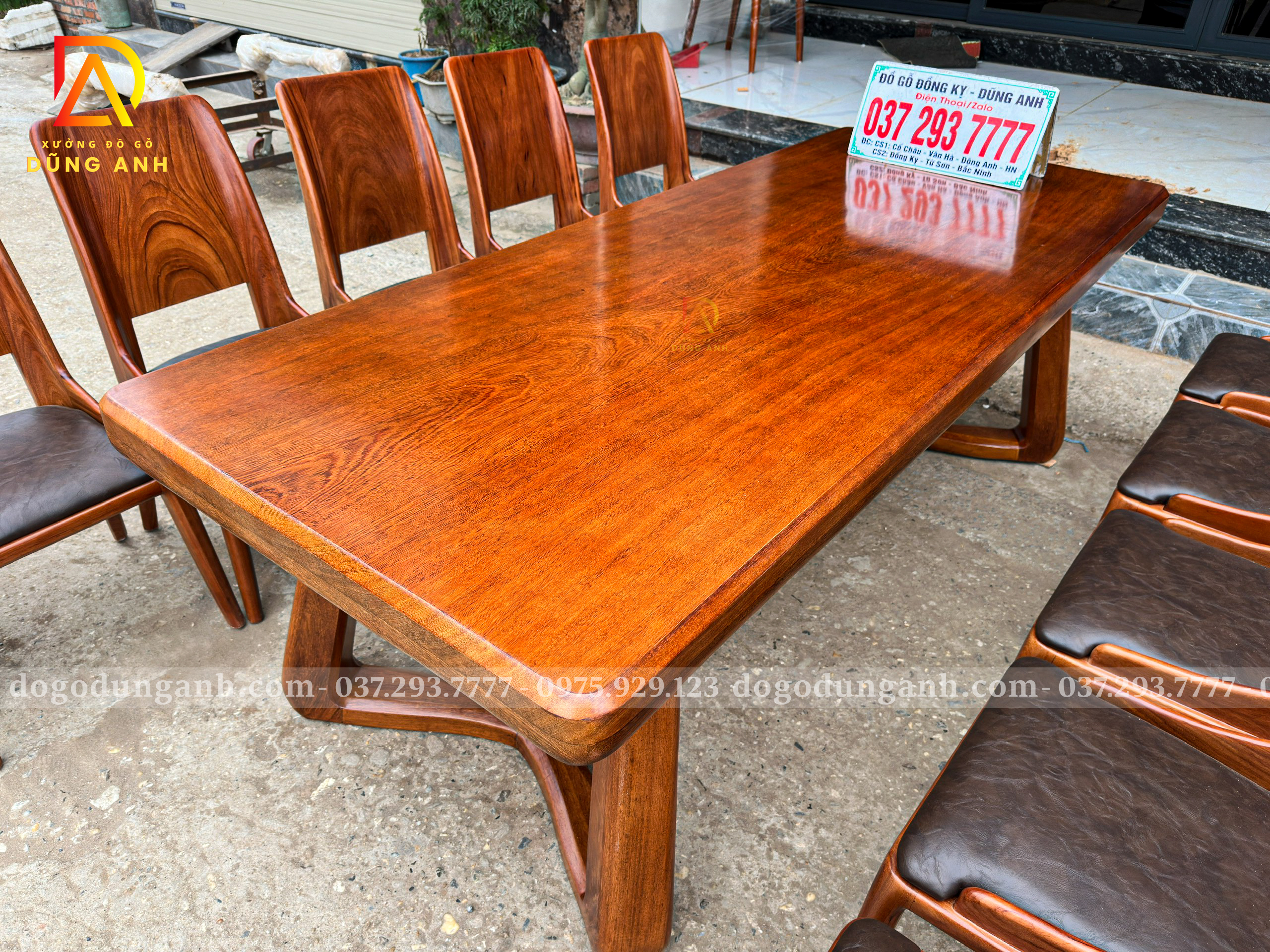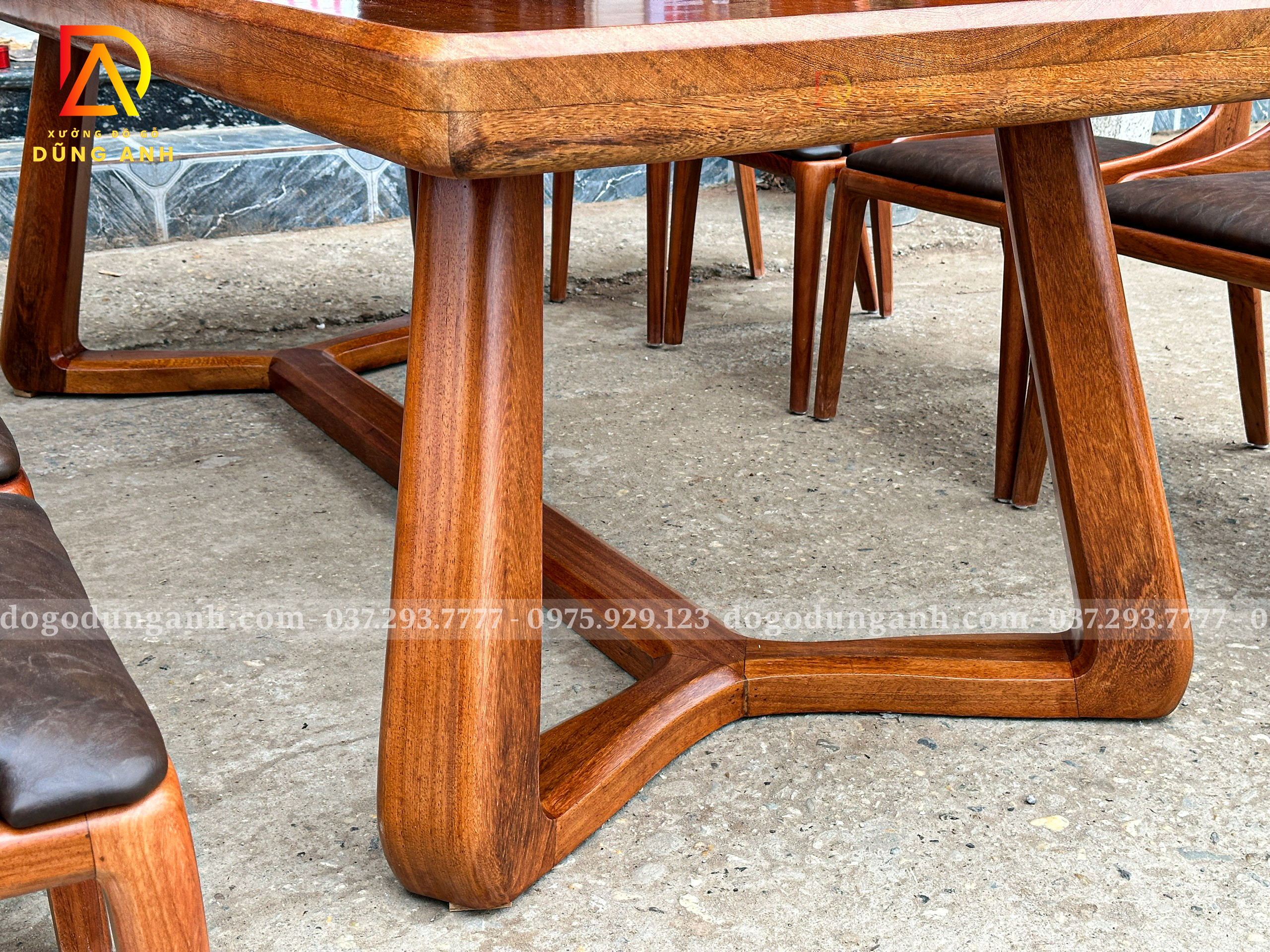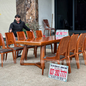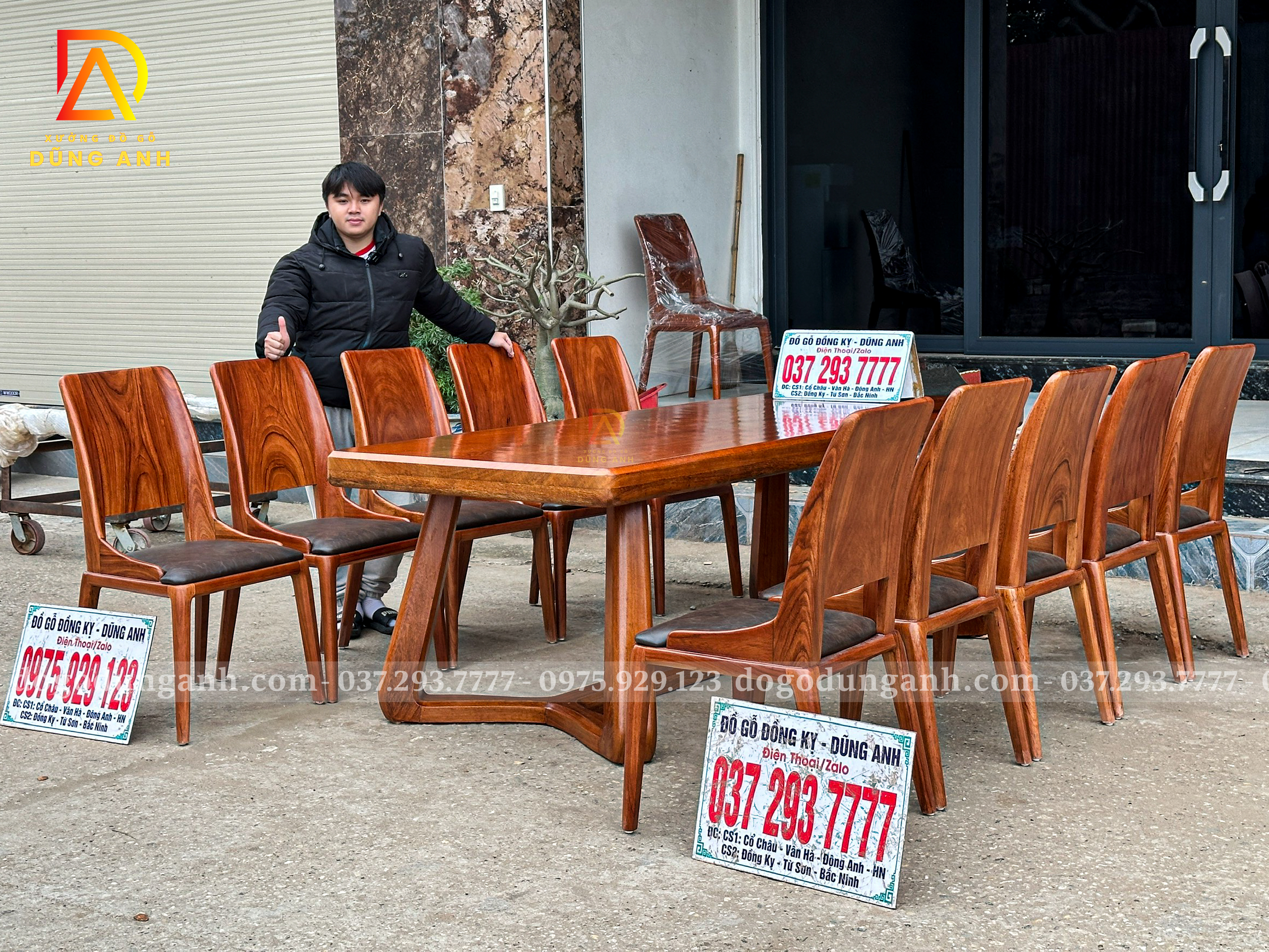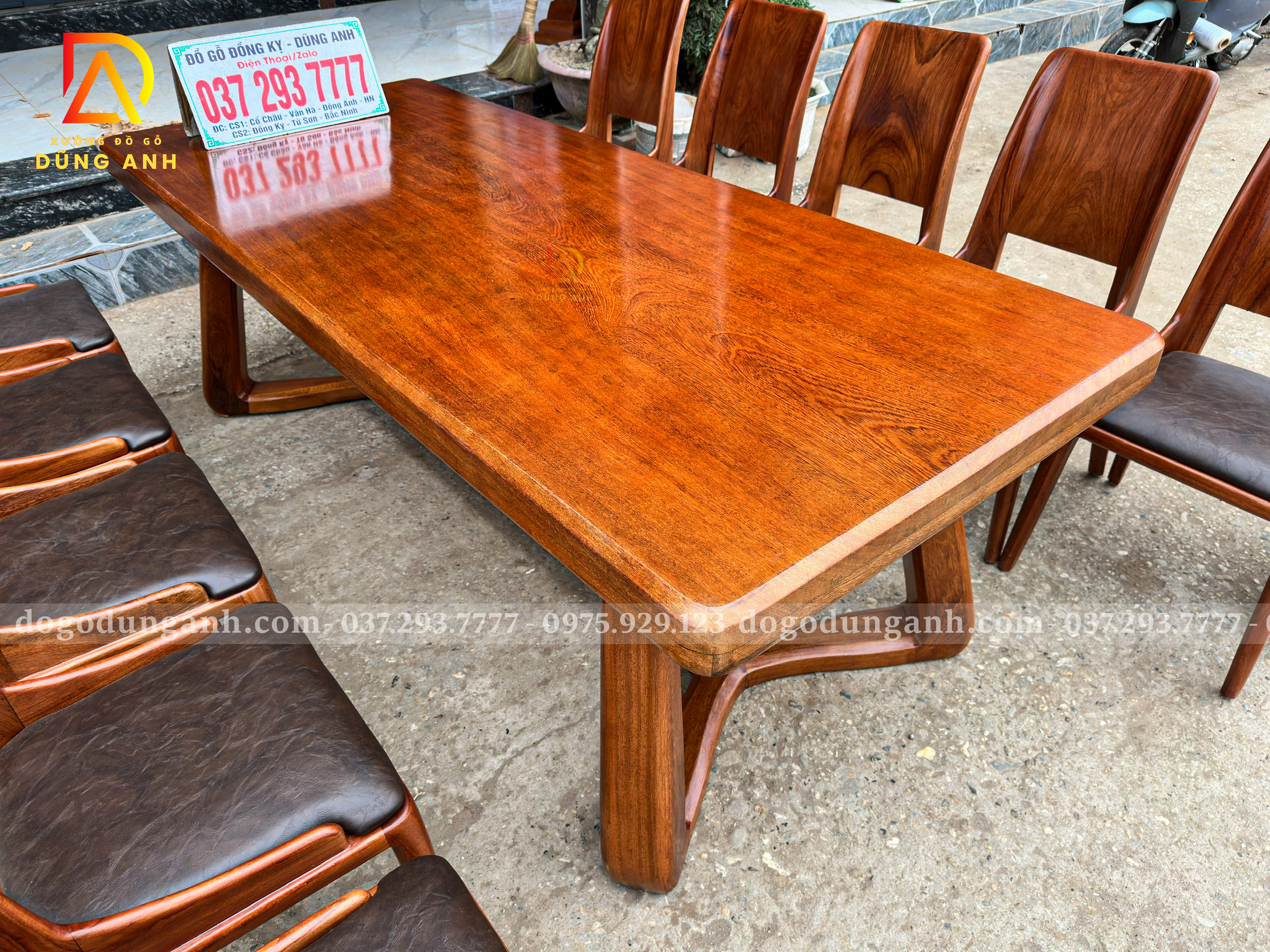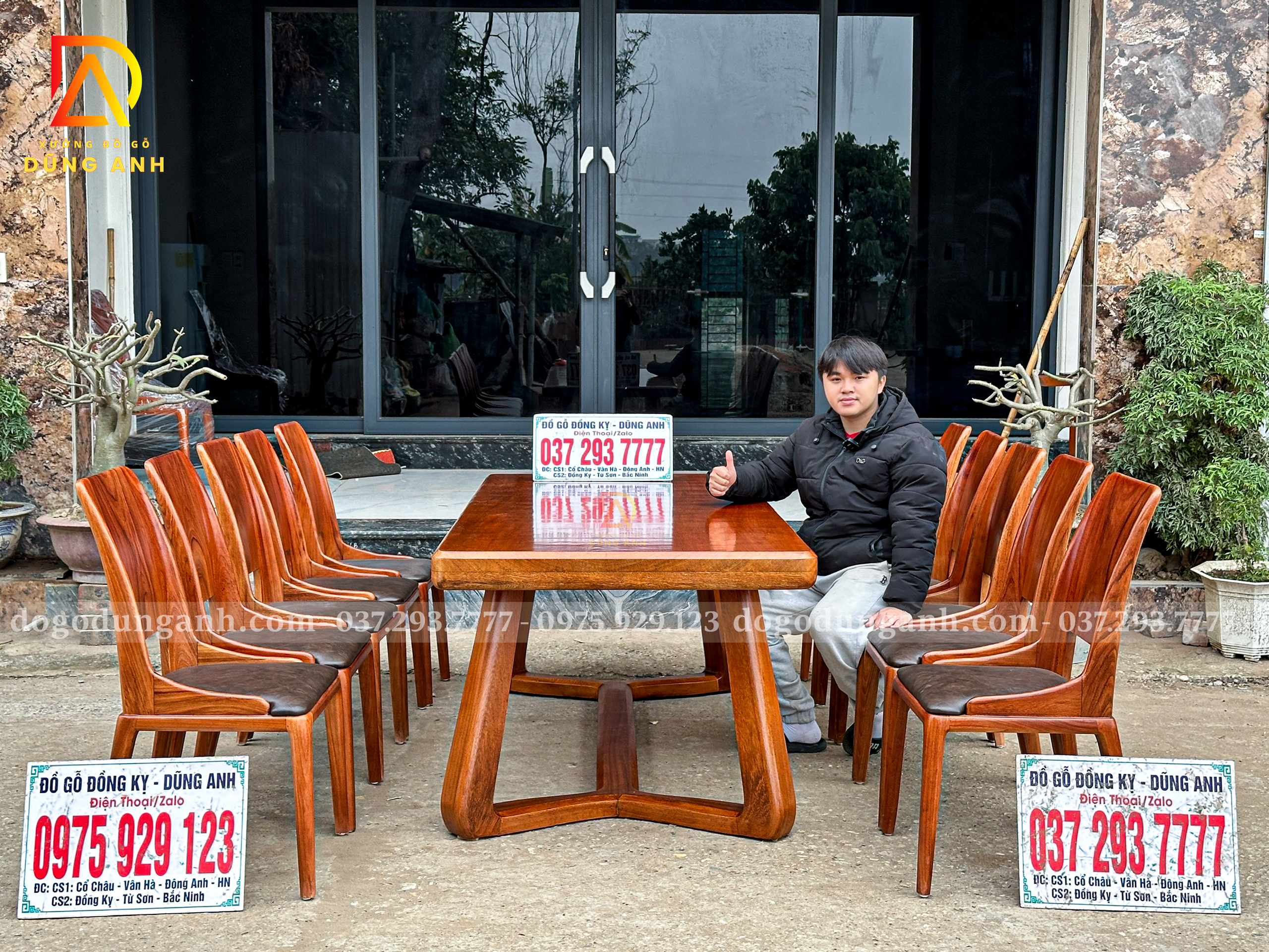 Bộ bàn ăn 10 ghế được chế tác từ gỗ Gõ Đỏ tự nhiên, thiết kế theo phong cách hiện đại nhưng vẫn giữ trọn nét sang và “chất” của dòng gỗ quý. Mẫu bàn chữ nhật mặt nguyên khối kết hợp chân U 2 Đầu tạo dáng chắc khỏe, bề thế, đặt vào phòng ăn là nổi bật ngay.