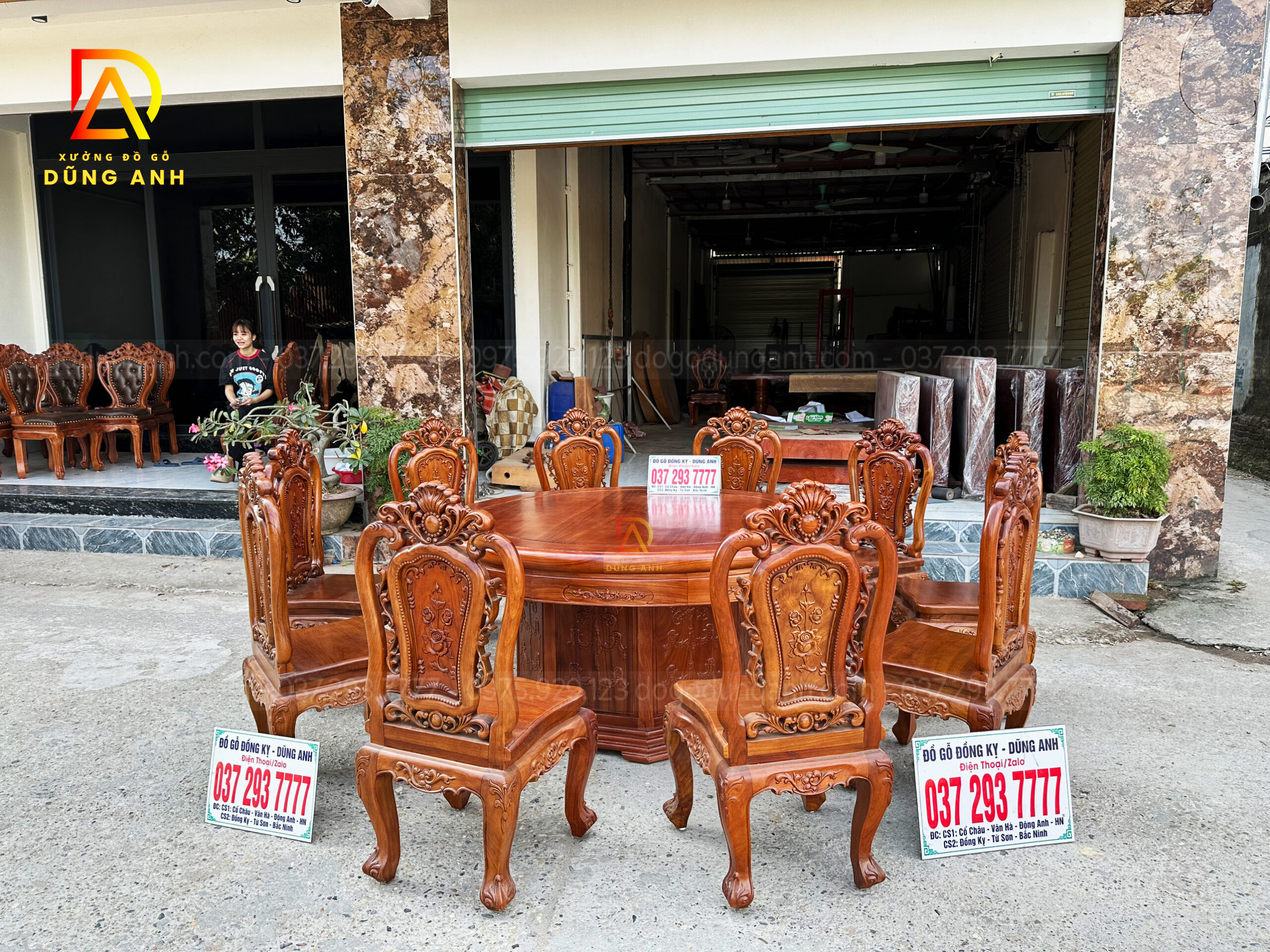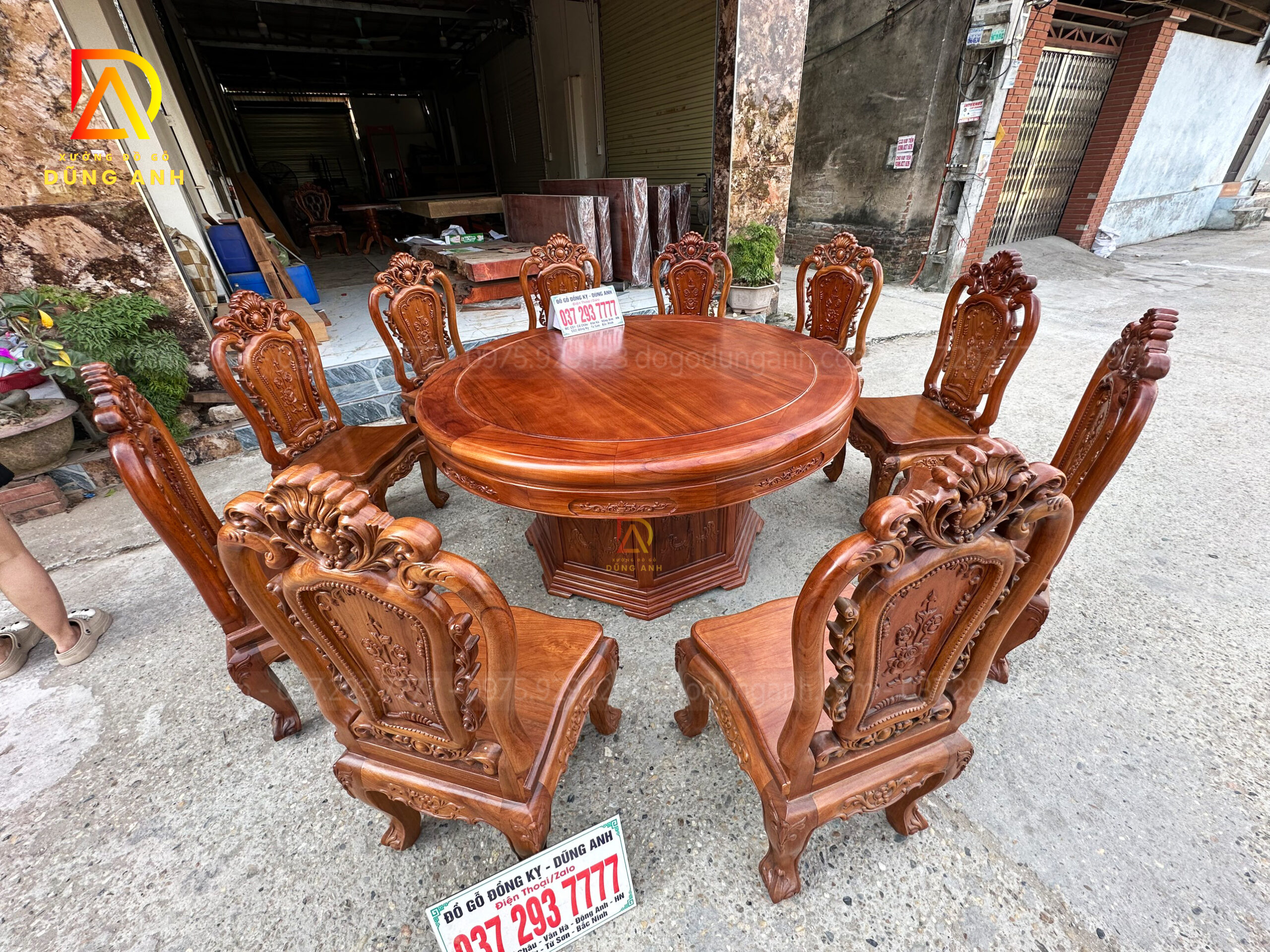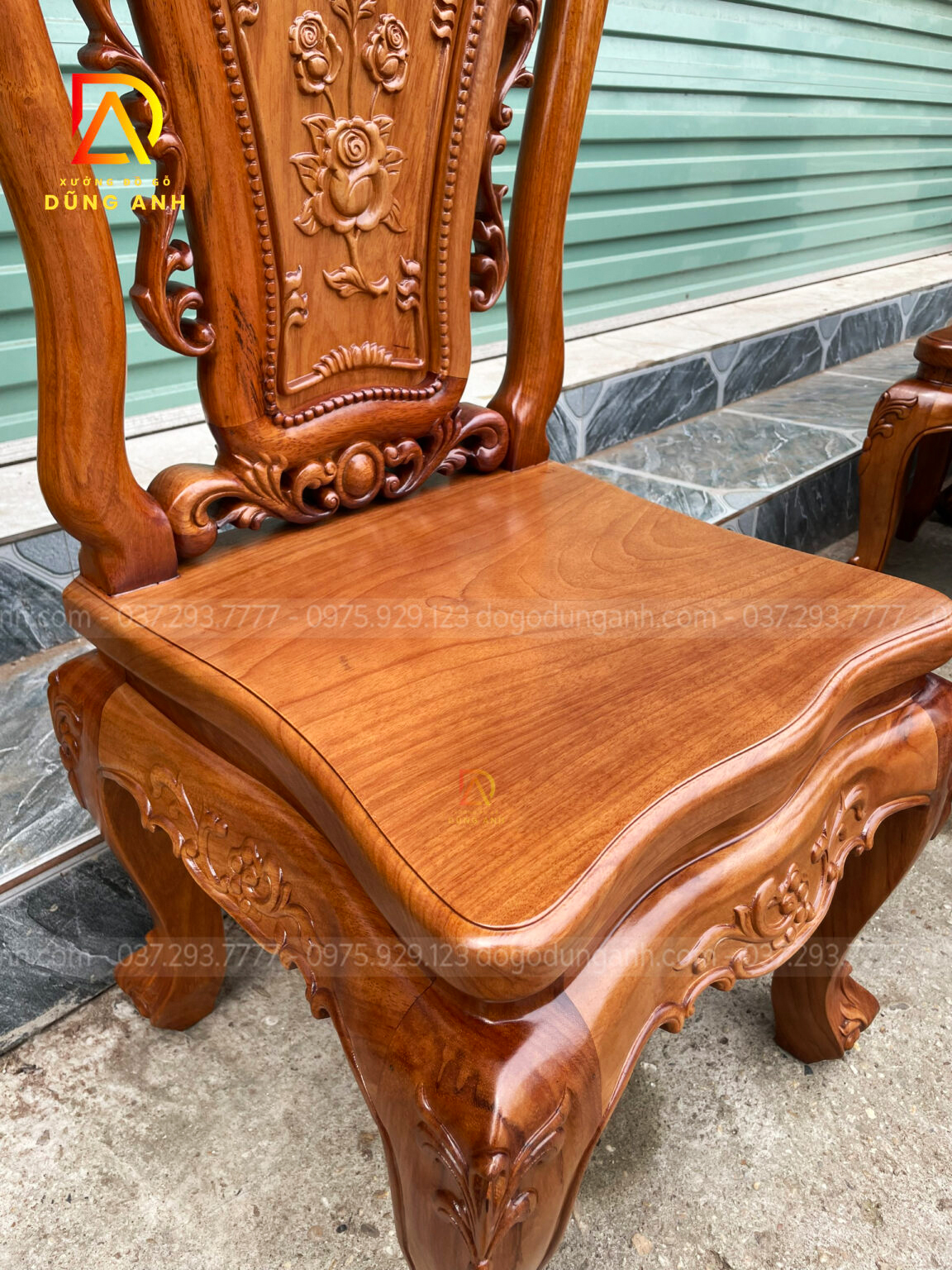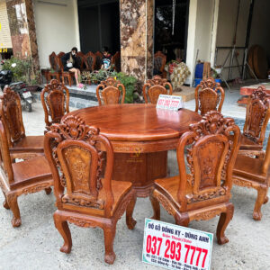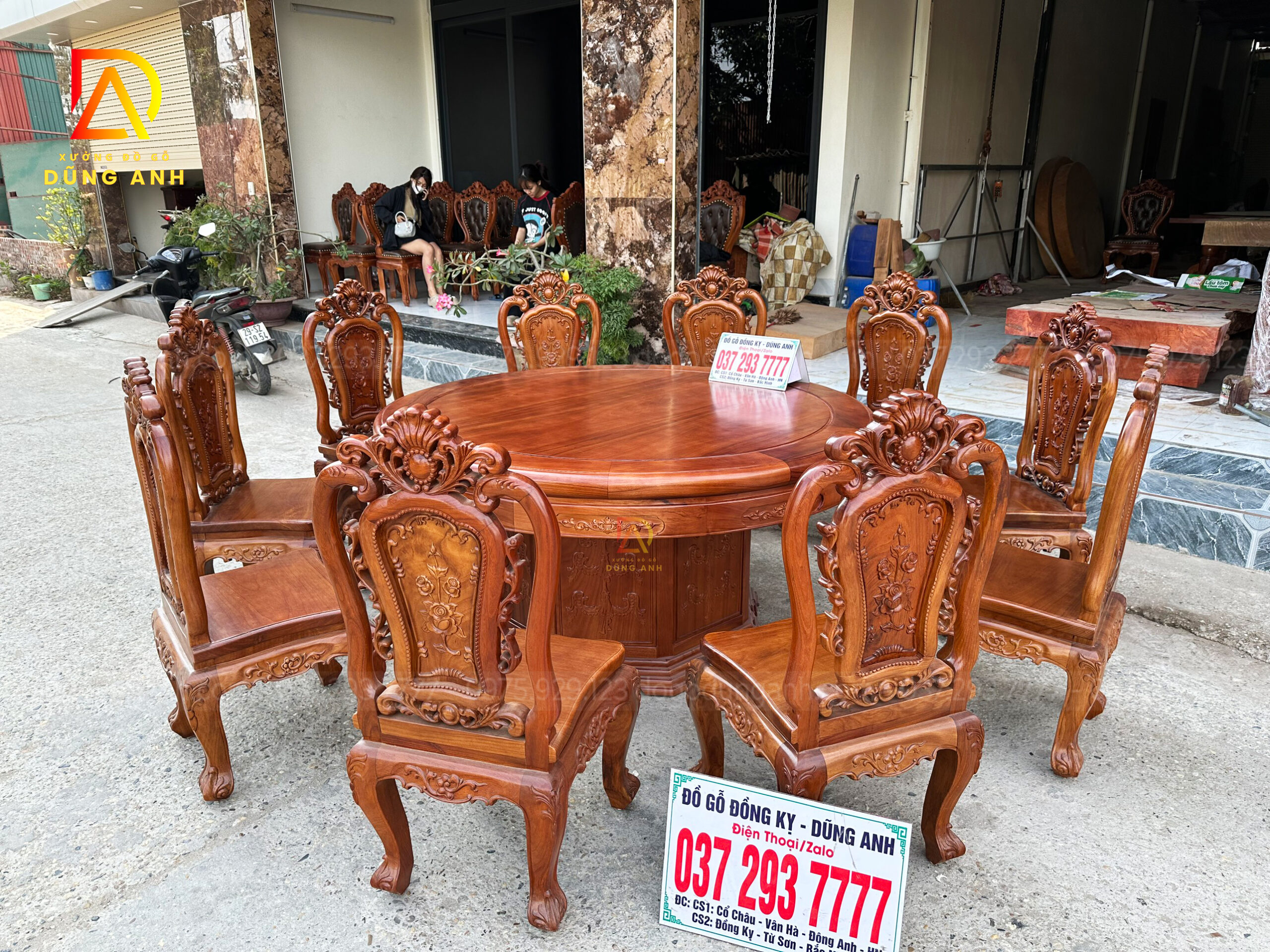 Đồ Gỗ Dũng Anh | Bộ 10 Ghế Hoàng Gia hoa hồng+ Bàn tròn yếm bo – Gỗ Gõ Đỏ