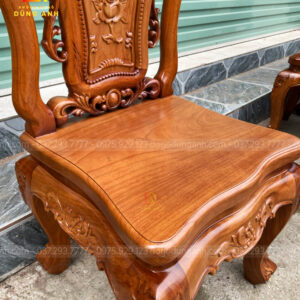 - Chiếc ghế sở hữu mặt yếm được đục vô cùng sắc nét với kích thước là dày 3 cm chân ghế vuông vô cùng chắc chắn với kích thước là 8 cm đảm bảo là có thể chịu được sức nặng vô cùng tốt và bền bỉ theo thời gian , bên cạch đó thì chân ghế cũng được đục vô cùng tinh tế sắc sảo ‘