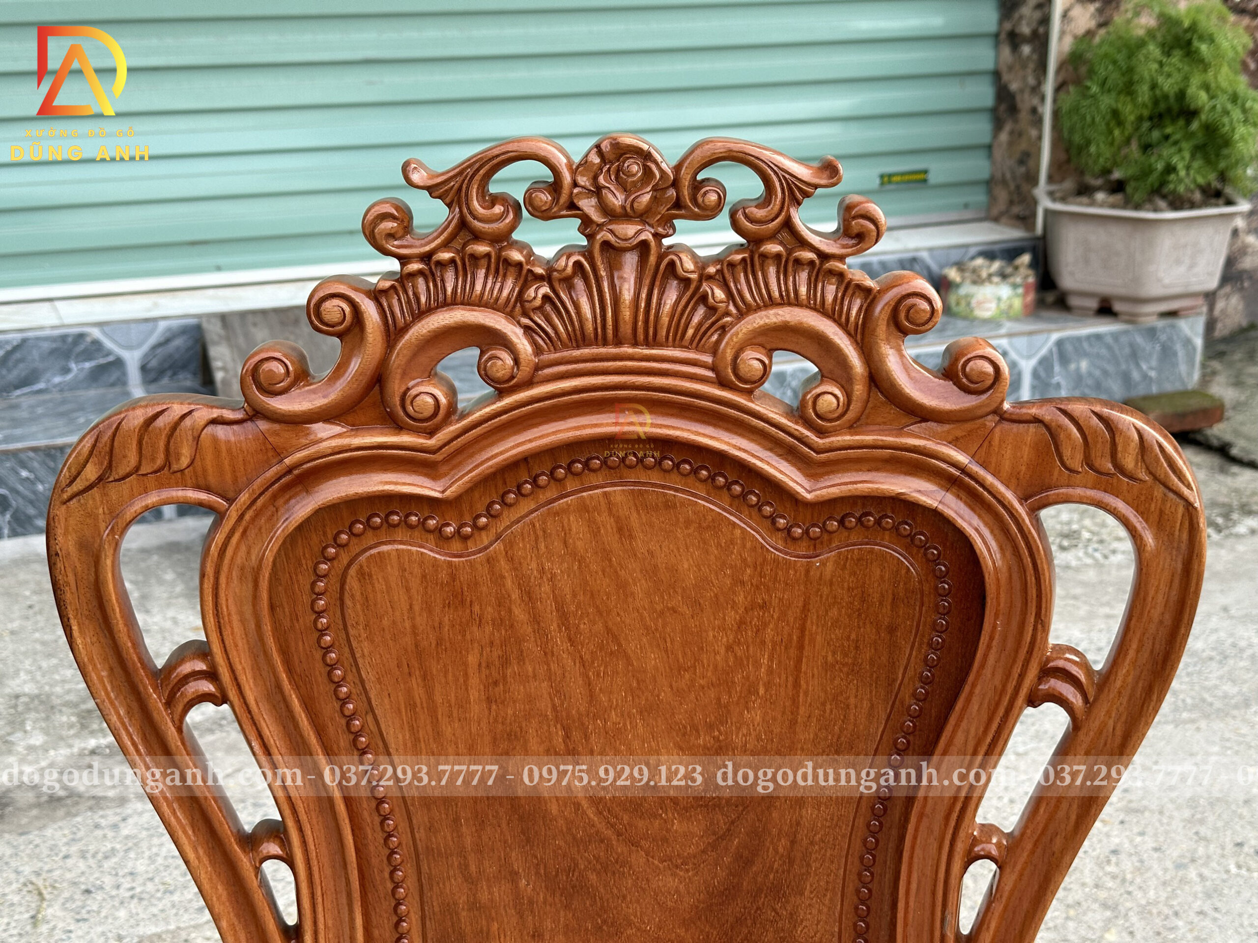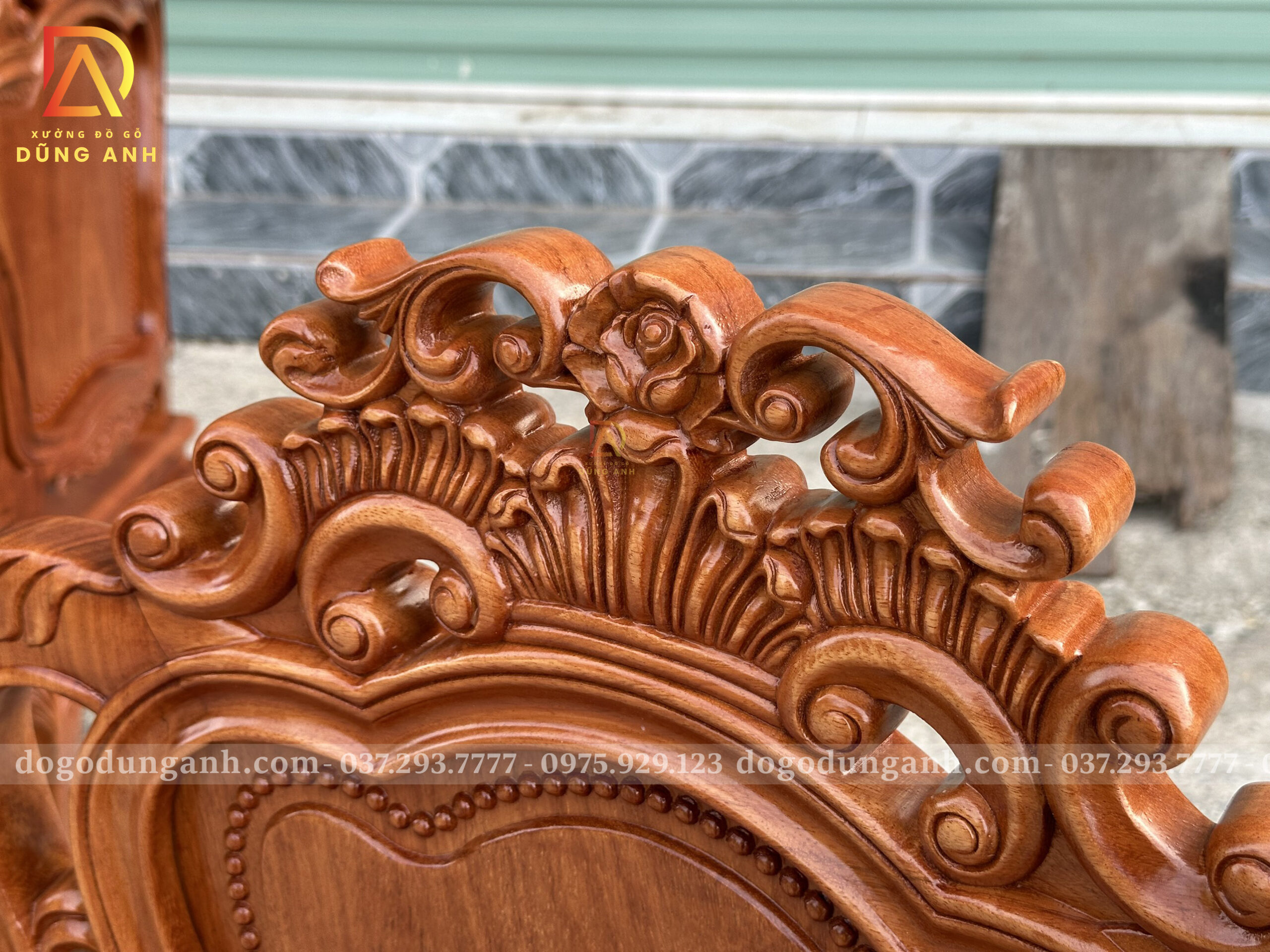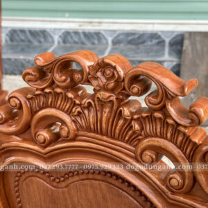 - Phần Chương ghế Liền Nguyên Khối được đục chính giữa là bông hoa hồng xung quanh là họa tiết hoa lá tây vô cùng sắc nét phía dưới