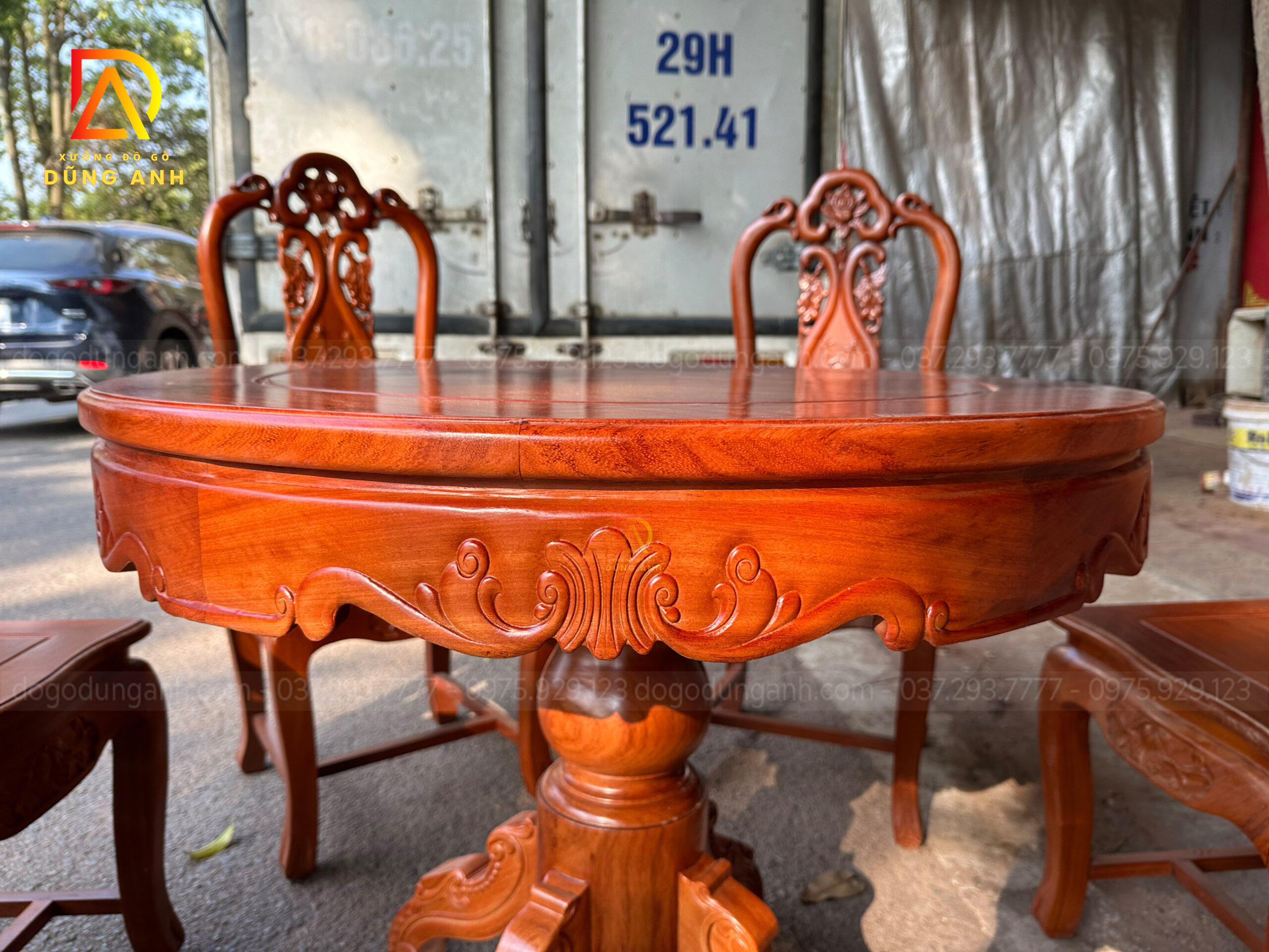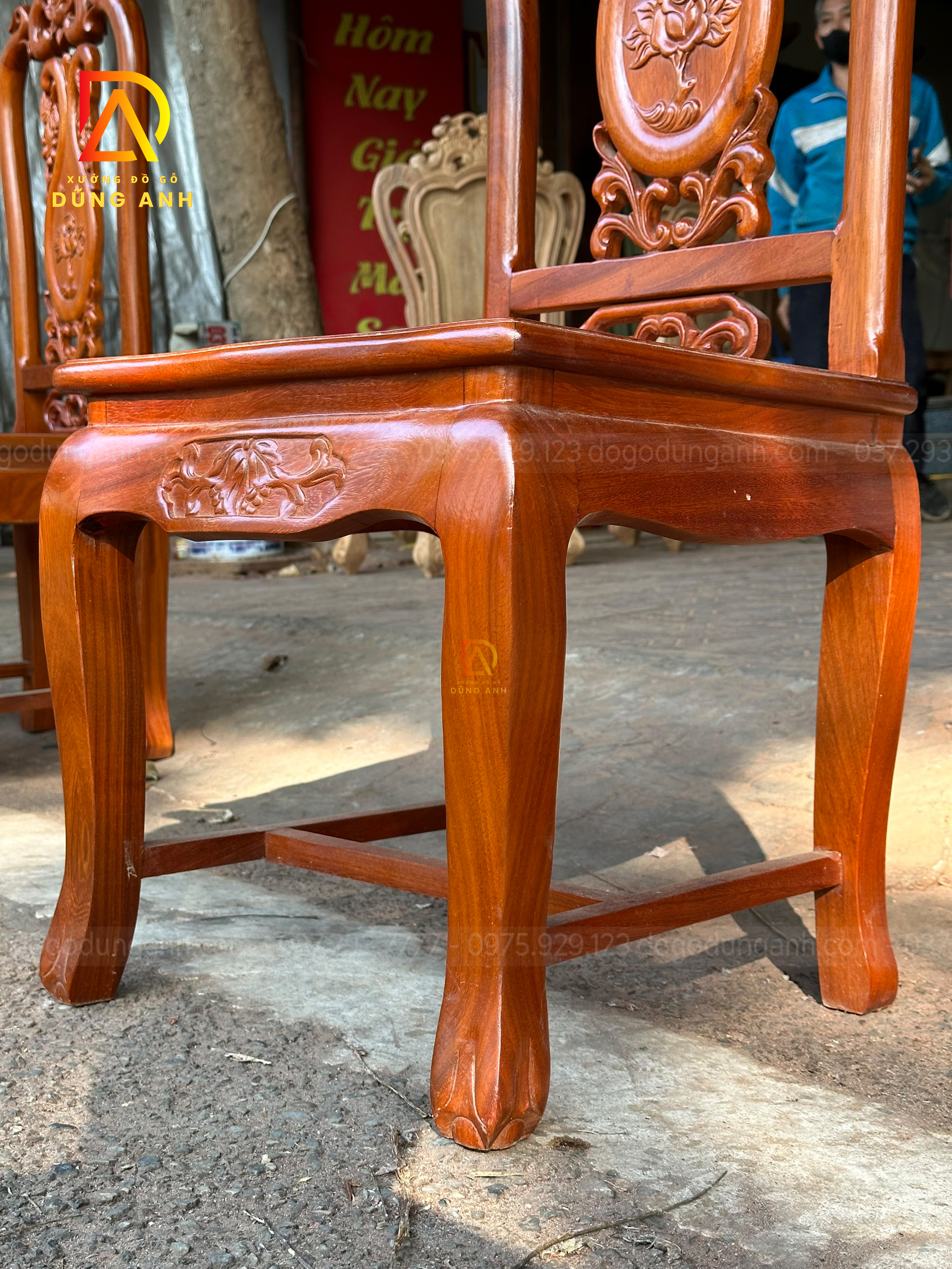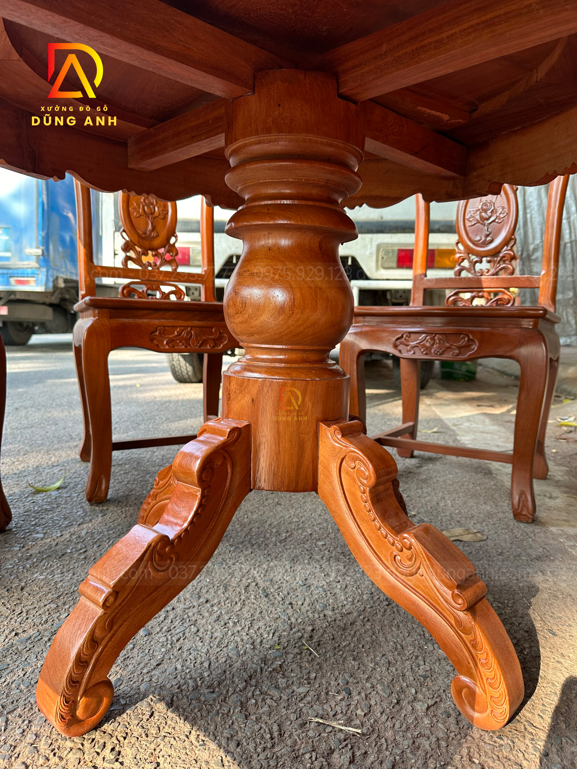 - Xung quang là 4 chiếc chân chó có độ dày 6 cm và rộng 13 cm được tiện tròn và thủ công bằng tay , đục chạm mẫu hoa lá tây tạo thêm điểm nhấn cũng như độ sang trọng