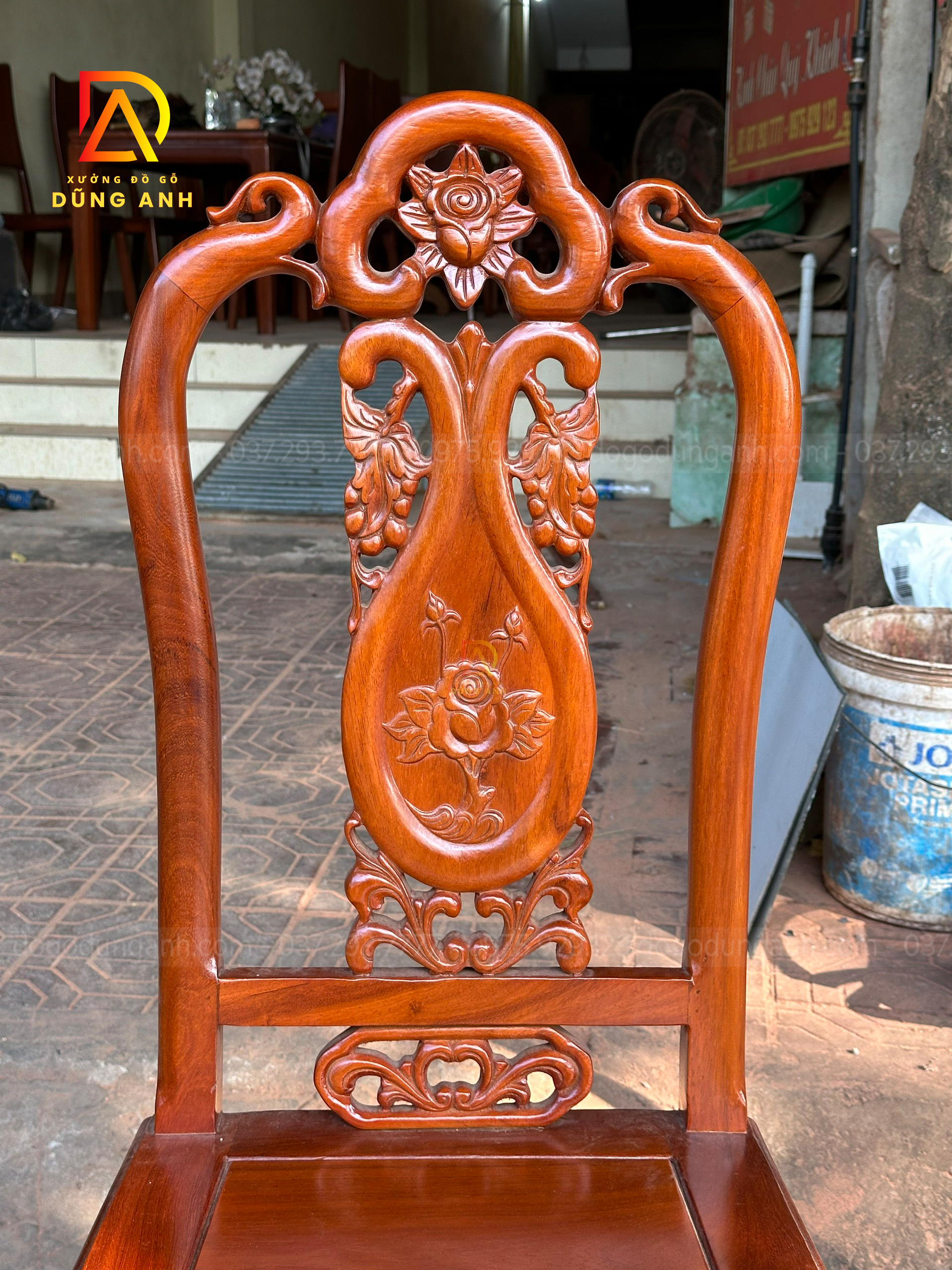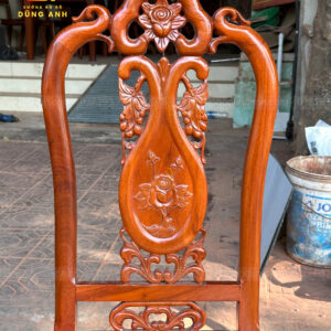 - Trương ghế đặc liền Nguyên Khối đục chạm hình hoa hồng ở chính giữa tượng trưng cho tình yêu và hạnh phúc , phía bên dưới là hai chùm nho hai bên tượng trưng cho con cháu đầy đàn , tất cả đều tỉa tay hoàn toàn 100%