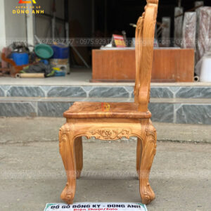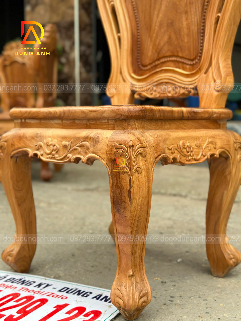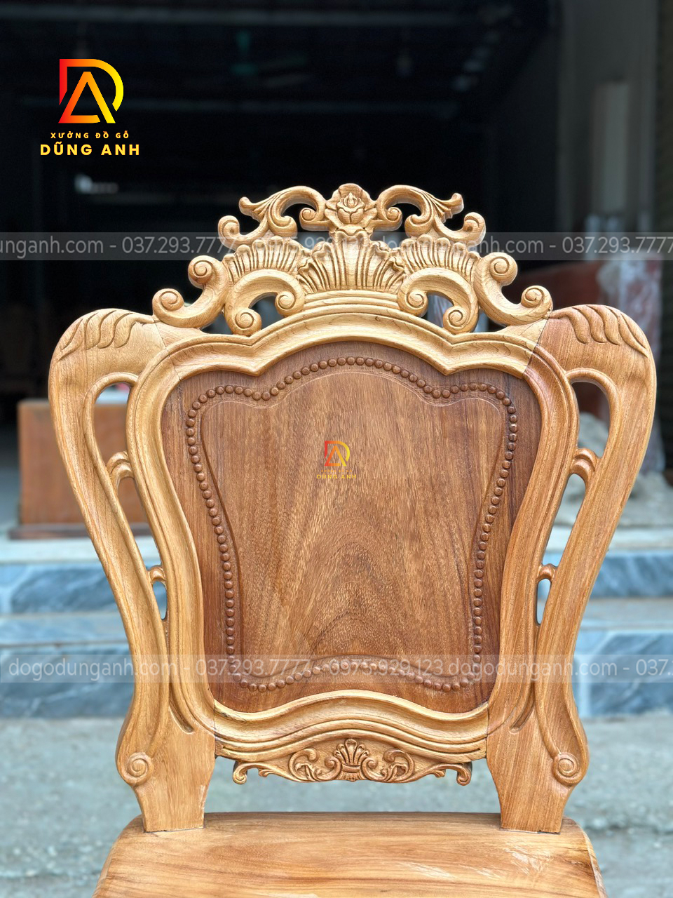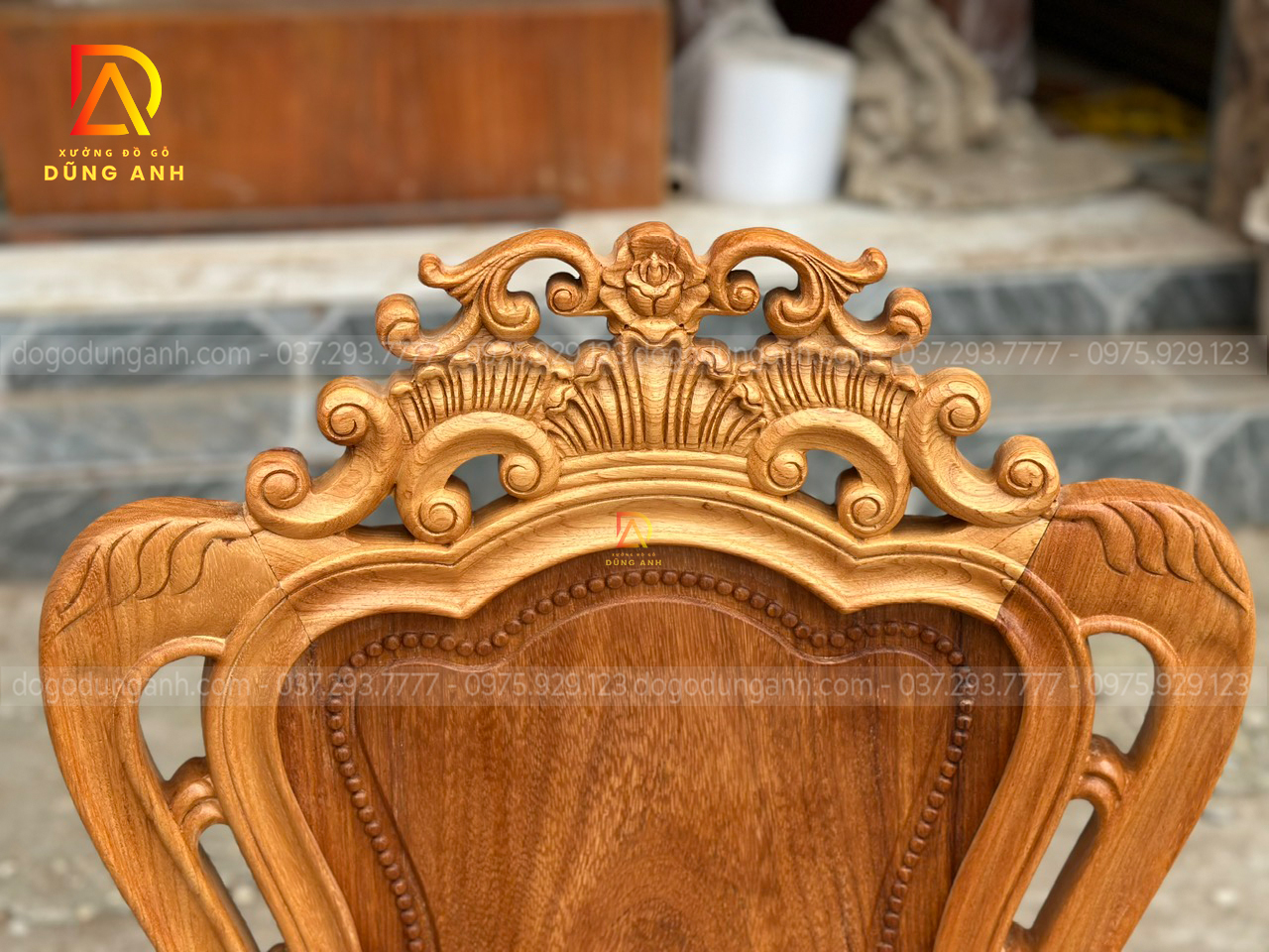 Bộ bàn ghế là sự giao thoa hài hòa giữa hai nền văn hóa: phong cách hoàng gia châu Âu cổ điển và bản sắc truyền thống Á Đông. Các mẫu ghế Louis được thiết kế theo dáng ghế quý tộc Pháp, nổi bật với đường cong mềm mại, uyển chuyển và những chi tiết chạm khắc hoa văn tỉ mỉ, sang trọng. Tựa lưng cao và tay vịn thoải mái không chỉ tạo sự dễ chịu cho người ngồi mà còn tôn lên vẻ đẹp quý phái, trang nhã.