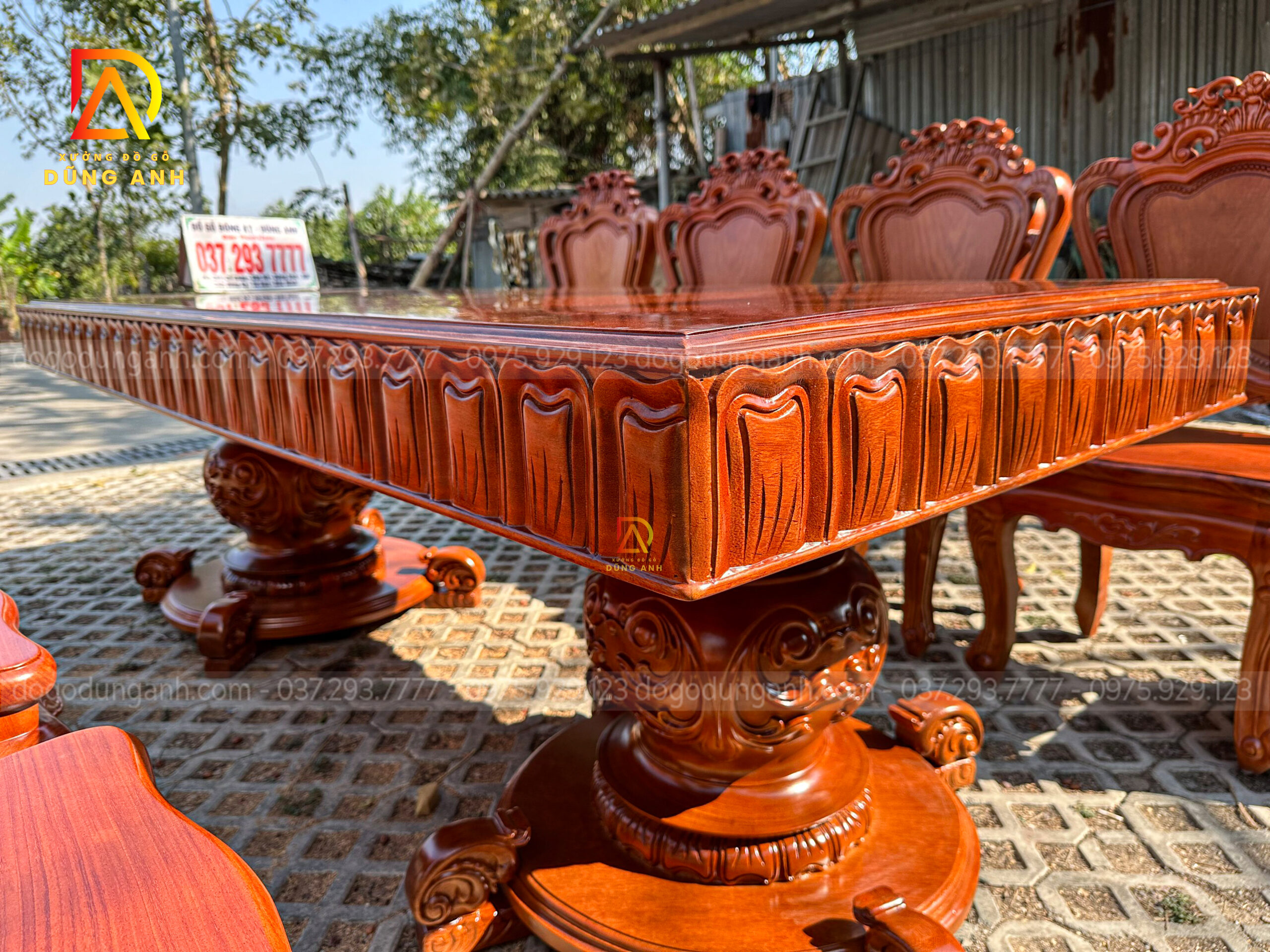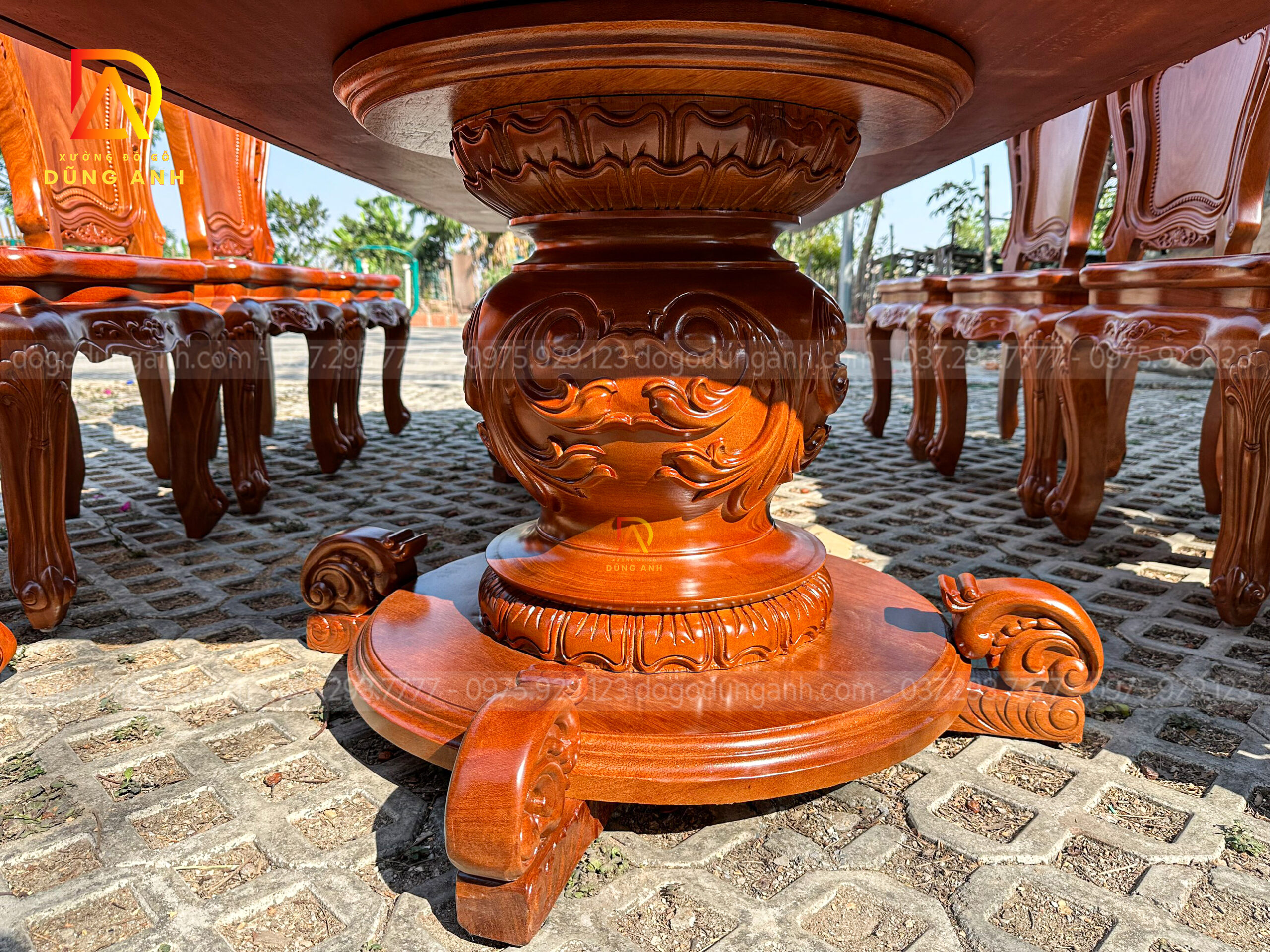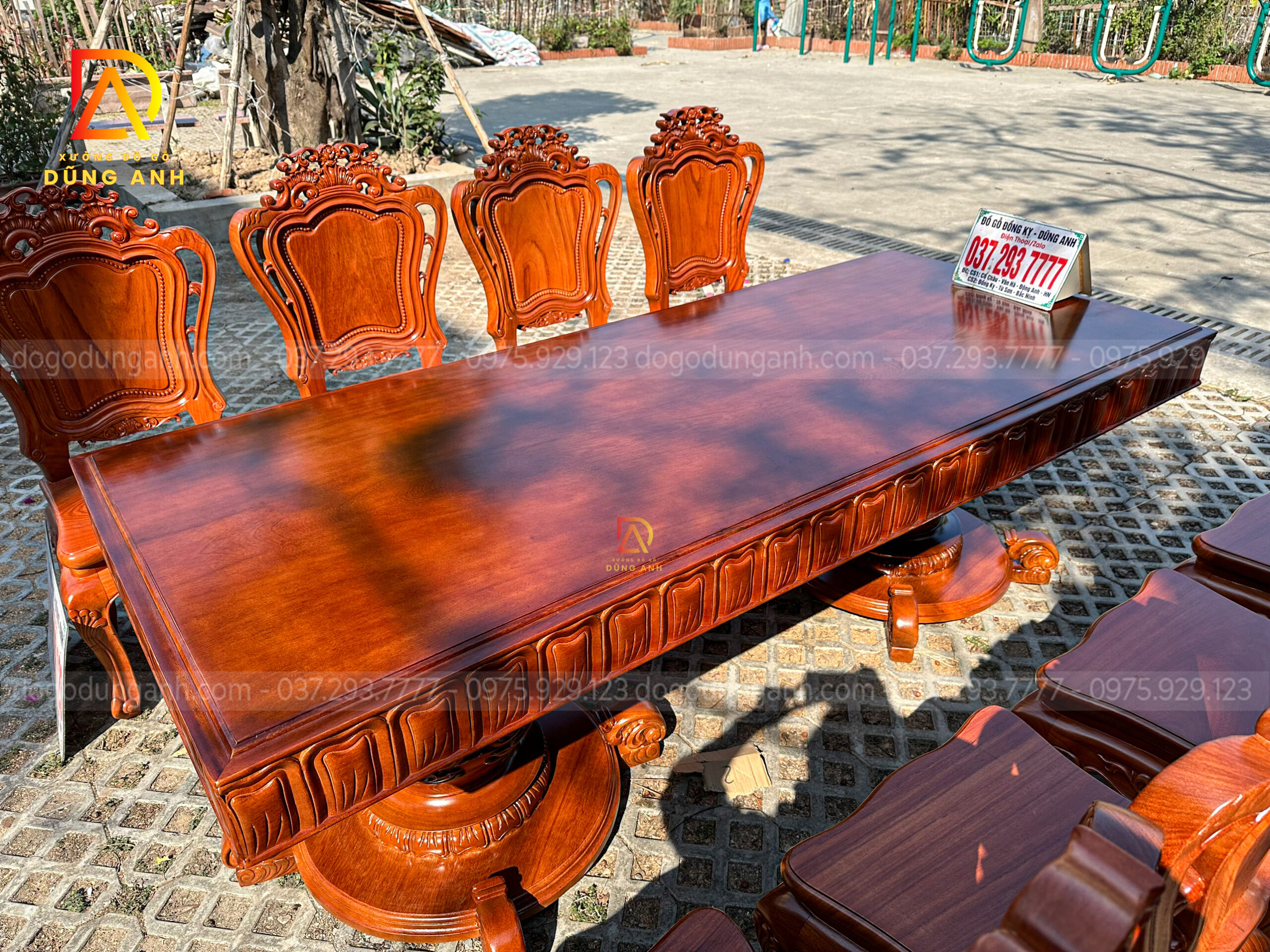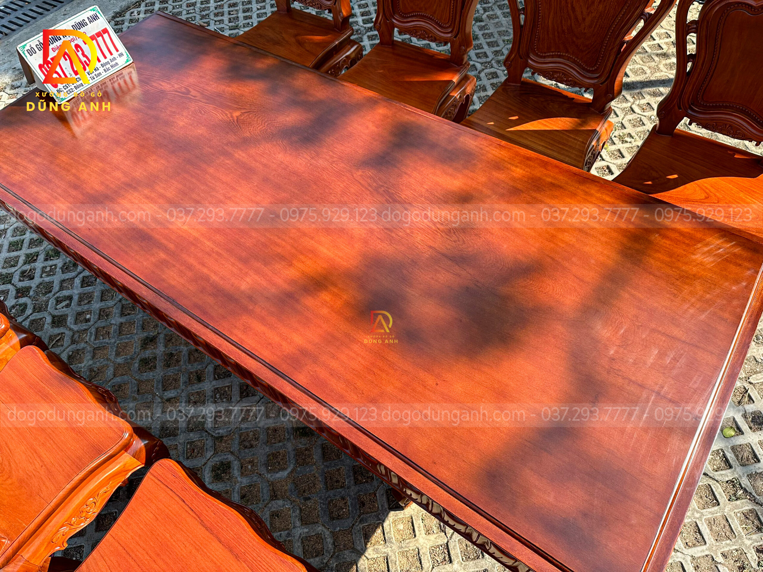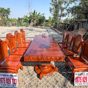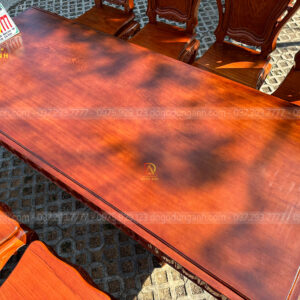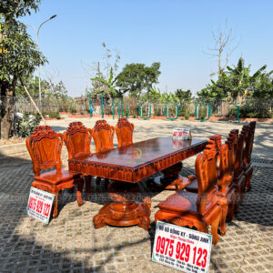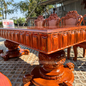 Bên cạnh bộ ghế, Đồ Gỗ Dũng Anh còn cung cấp các bàn ăn, kệ tủ và các chi tiết trang trí khác cùng chất liệu gỗ Hương Đá, tạo nên một không gian đồng bộ, sang trọng và đẳng cấp. Những món đồ này đều được chế tác với sự tỉ mỉ và chăm chút đến từng chi tiết, mang đến cho gia chủ một không gian sống hài hòa, tinh tế.