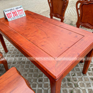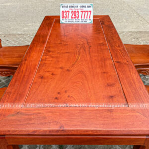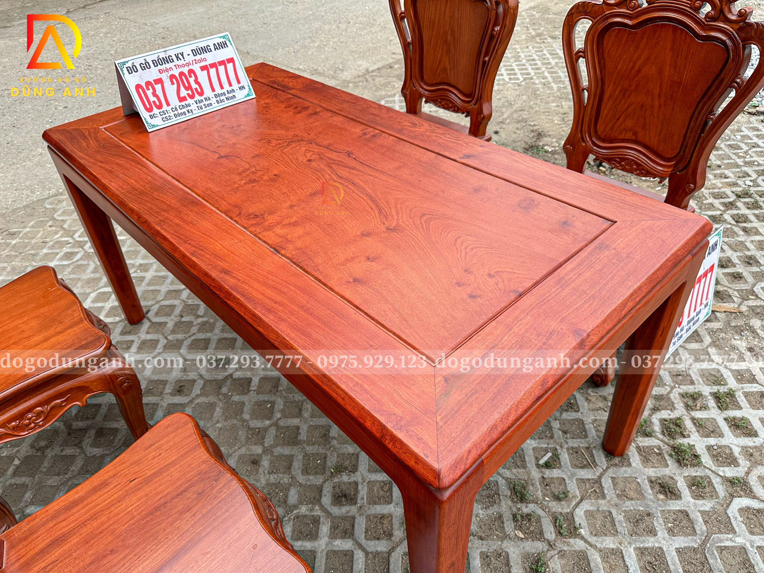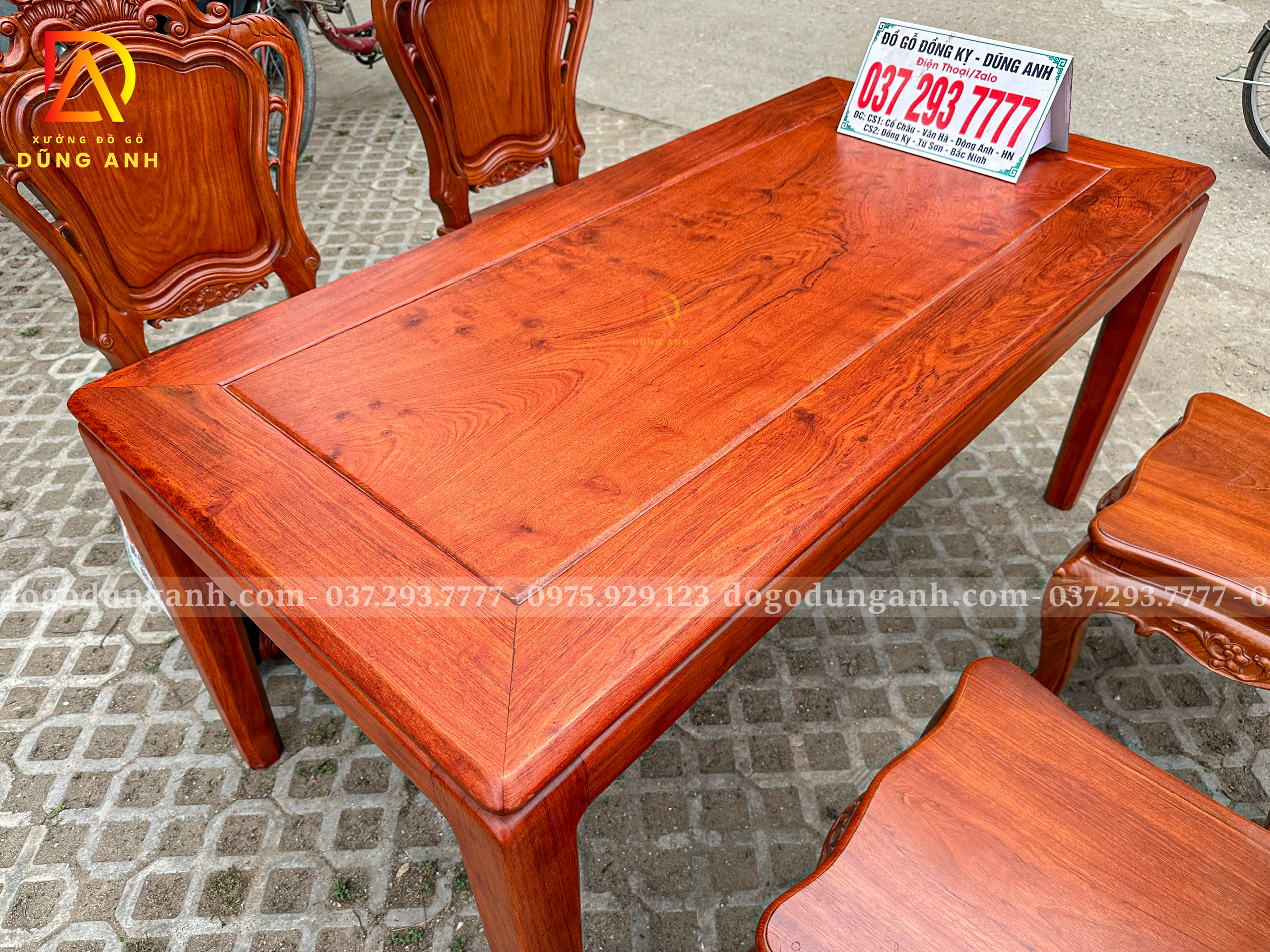 Ngoài ra, lớp sơn PU hoàn thiện màu trần trong suốt giữ nguyên vân gỗ hương đá tuyệt đẹp, bảo vệ bề mặt bàn khỏi ẩm mốc, trầy xước, đồng thời dễ vệ sinh, lau chùi. Mặt bàn khi hoàn thiện lên màu ấm áp, vân gỗ nổi bật, toát lên vẻ sang trọng và gần gũi đặc trưng của gỗ hương đá tự nhiên