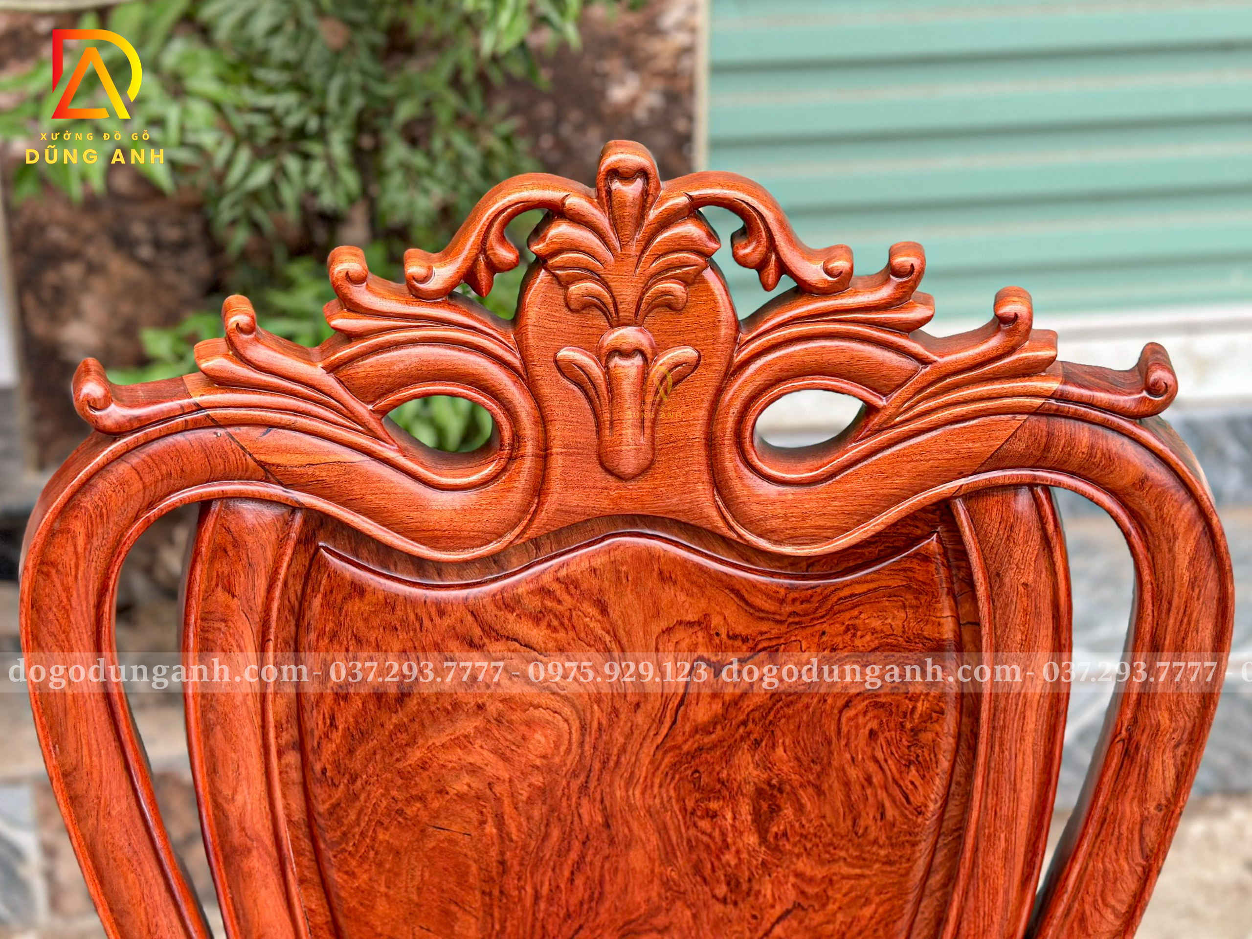 Điểm nhấn ấn tượng chính là phần đỉnh lưng ghế chạm hoa văn Louis Hoàng Gia đặc trưng, nhưng được tiết chế vừa phải, không rườm rà, giữ được nét cổ điển mà vẫn hài hòa với nội thất hiện đại