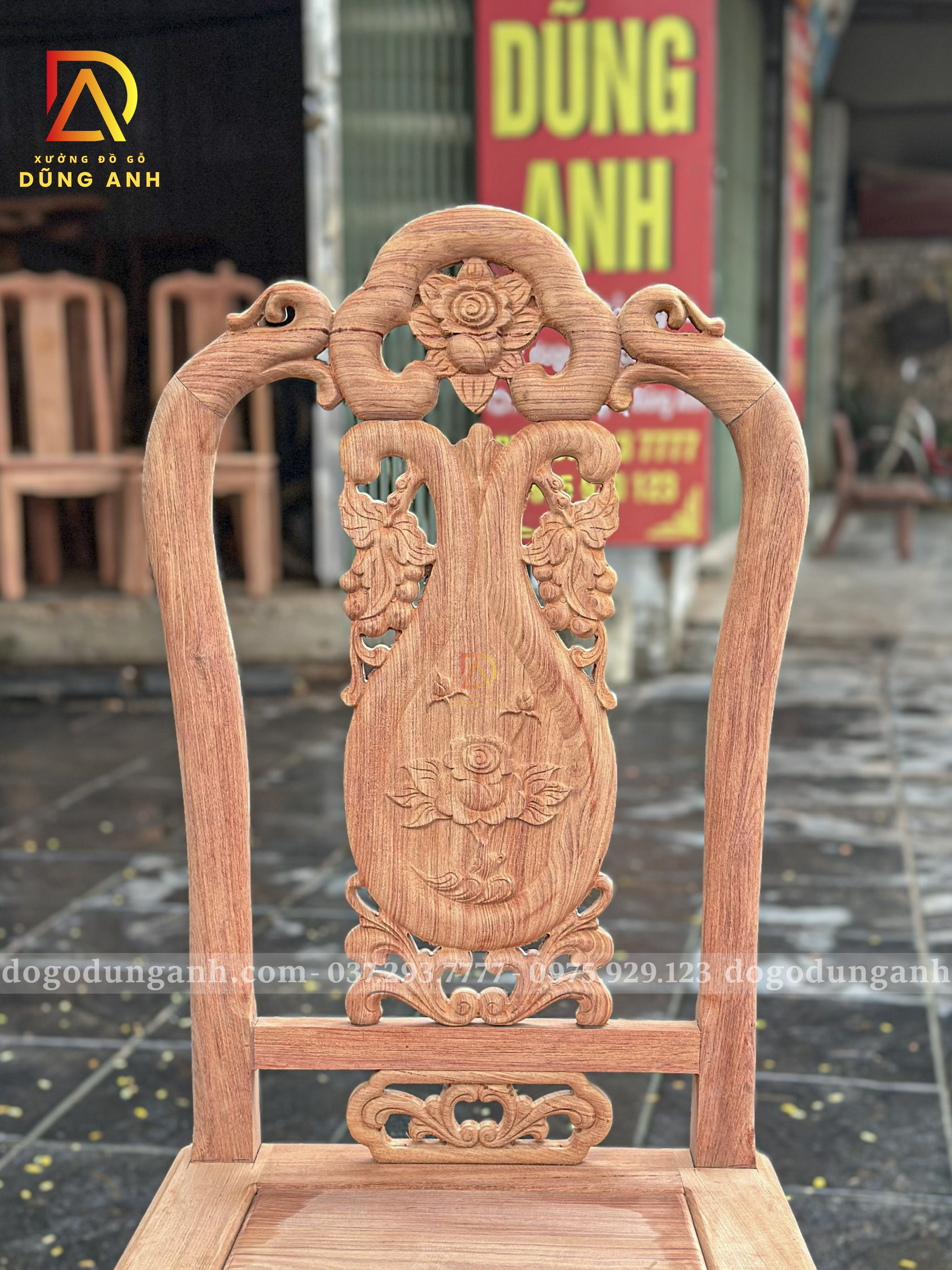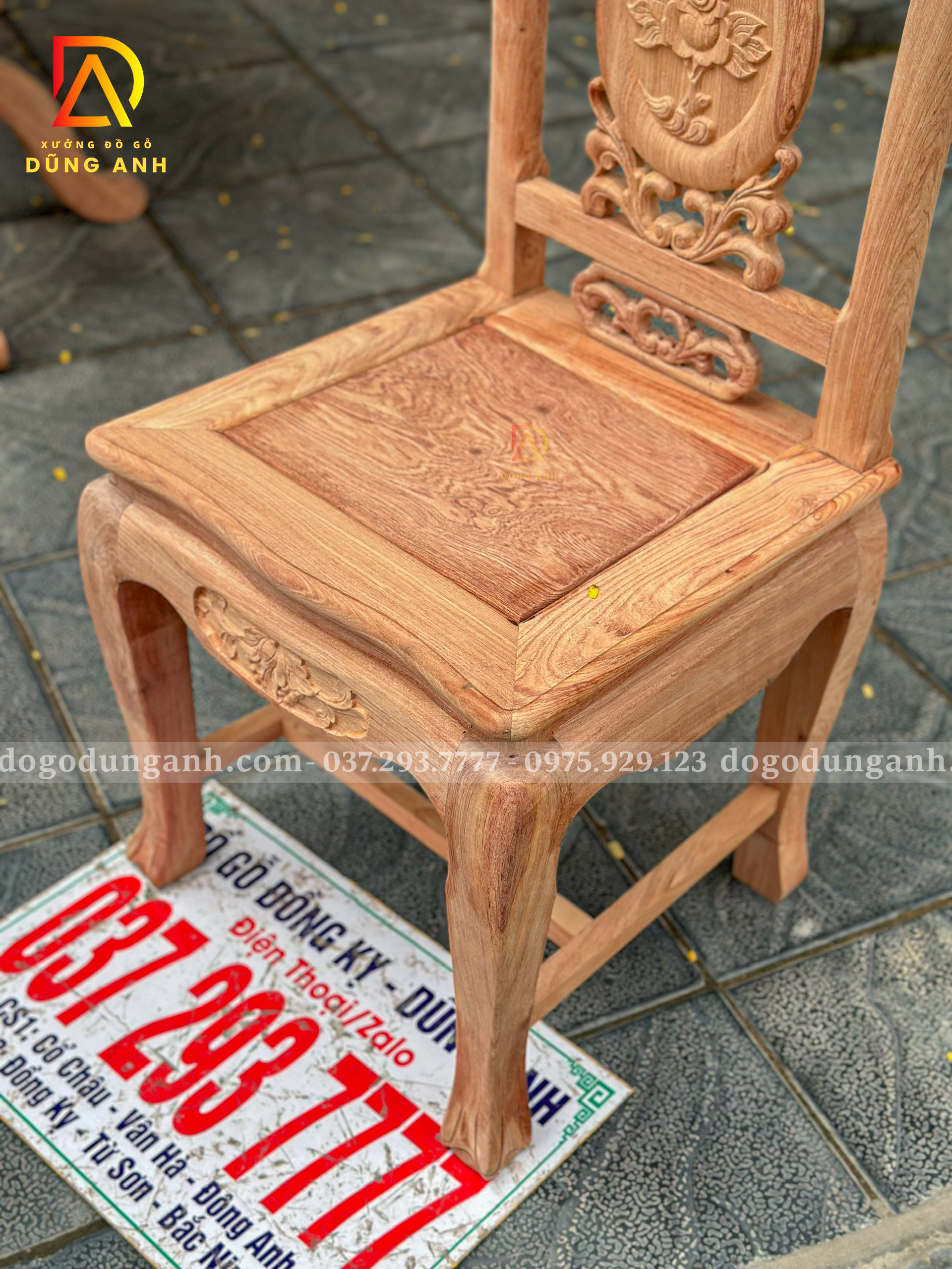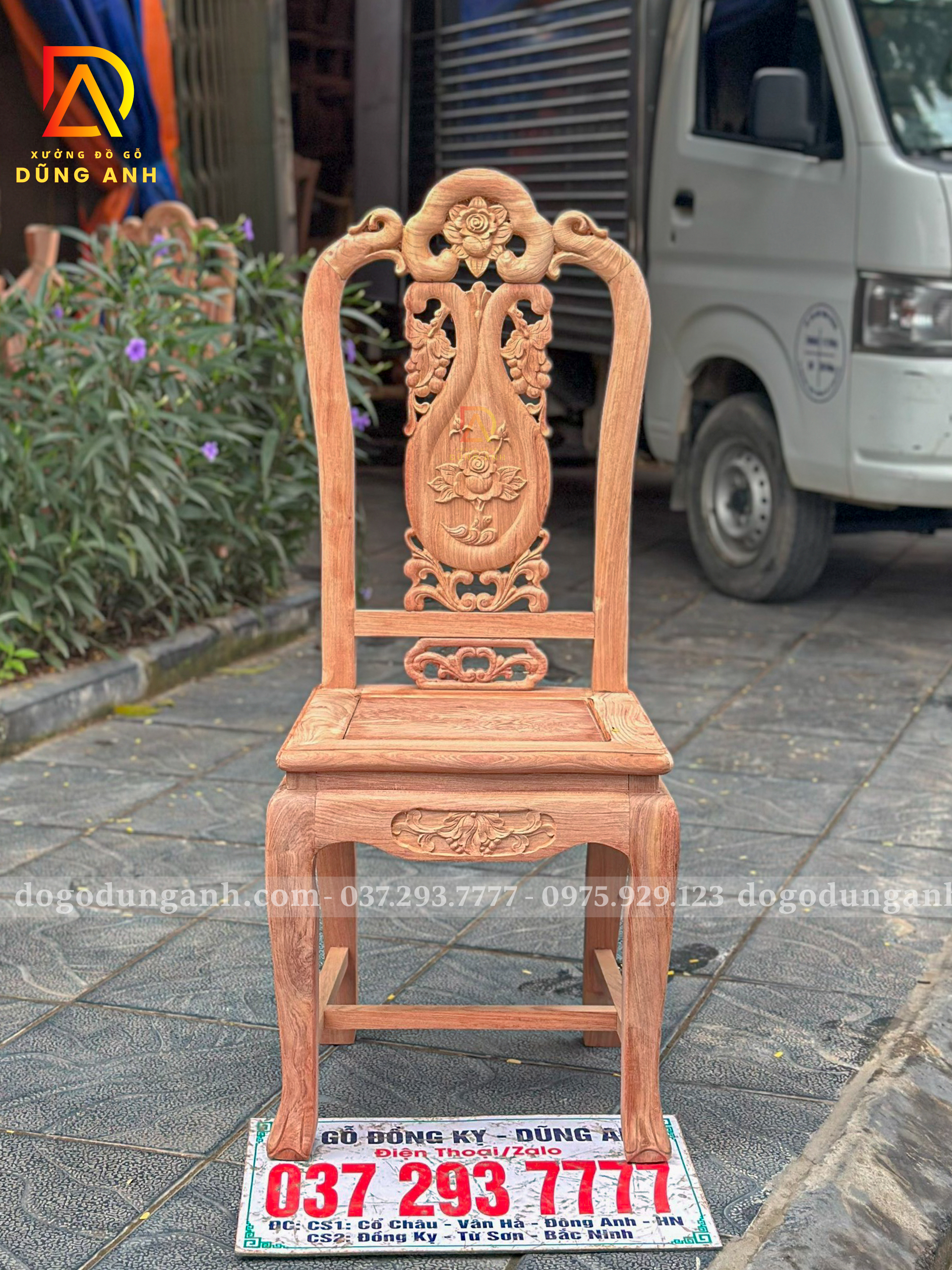 ✅ Kiểu dáng: Ghế tựa liền chạm hoa văn tinh xảo, dáng cao thoáng, tựa cong nhẹ ôm lưng, form ghế cân đối sang trọng.
