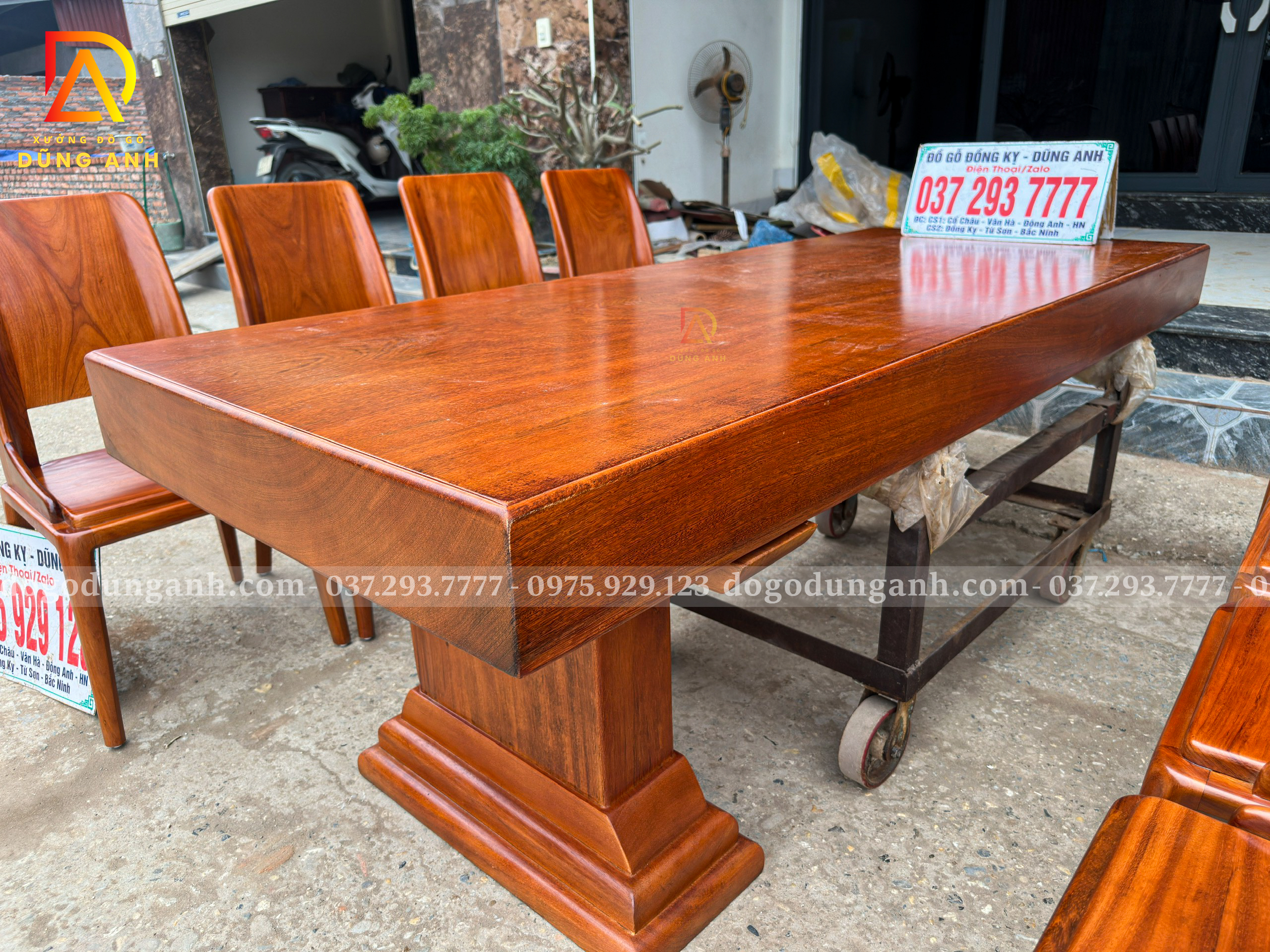 - Chiếc bàn có kích thước rộng 90cm, dài 220cm, thiết kế mặt nguyên khối bề thế, mang đến cảm giác sang trọng và đẳng cấp cho không gian phòng ăn