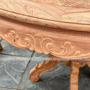 Mặt bàn tròn đường kính lớn, yếm bàn vén cong mềm mại tạo điểm nhấn nghệ thuật. Dáng tròn biểu trưng cho sự đoàn viên, ấm cúng. Chân bàn trụ tiện tay chắc chắn, vững chãi và bề thế