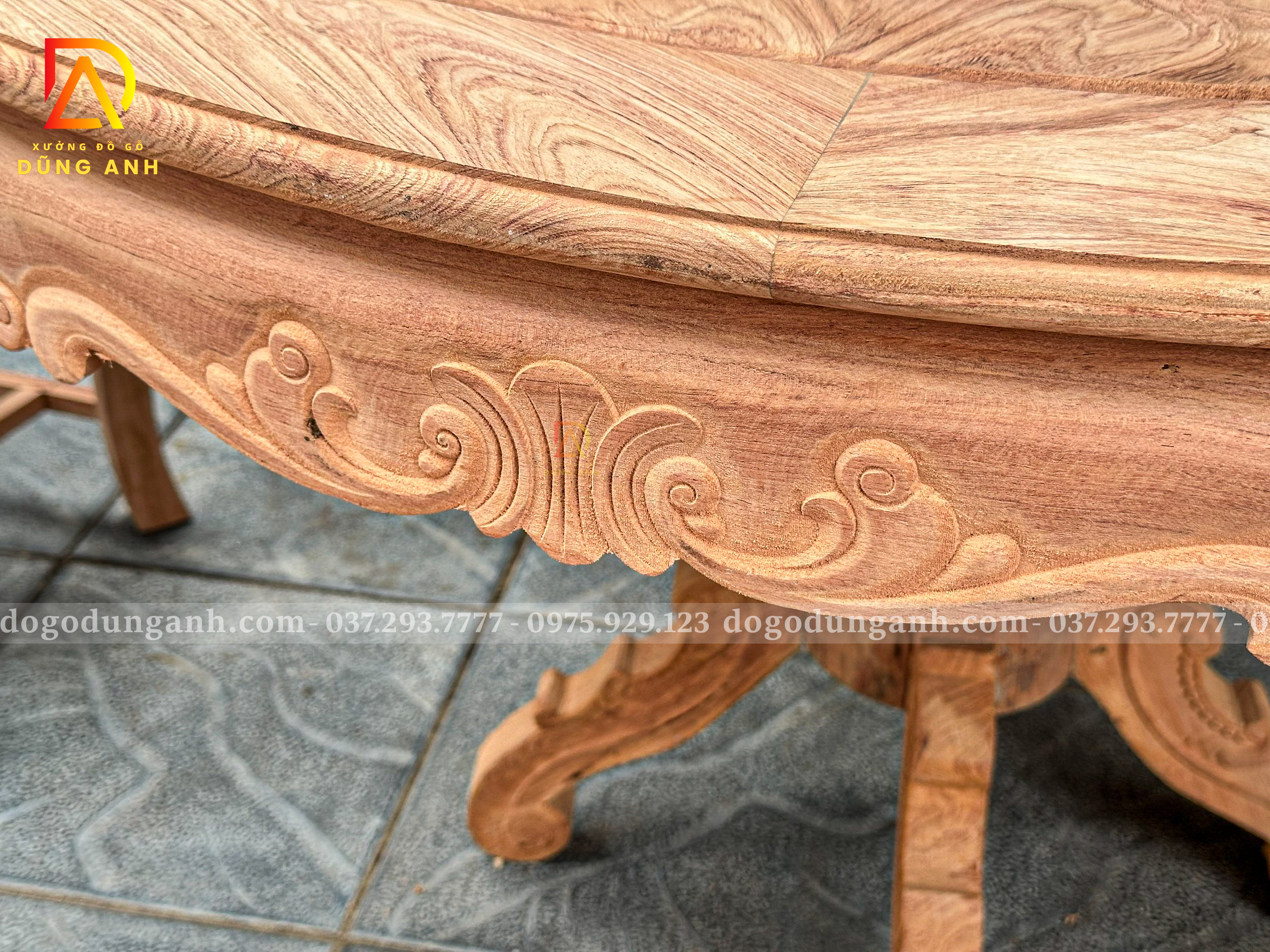 Sản phẩm được chế tác hoàn toàn từ gỗ Hương Đá tự nhiên 100%, dòng gỗ quý với đặc trưng là vân gỗ dày, sắc nét, màu sắc hồng nâu sang trọng và mùi thơm dịu nhẹ. Độ đanh chắc cao, ít cong vênh nứt nẻ giúp bộ bàn ghế có tuổi thọ hàng chục năm sử dụng