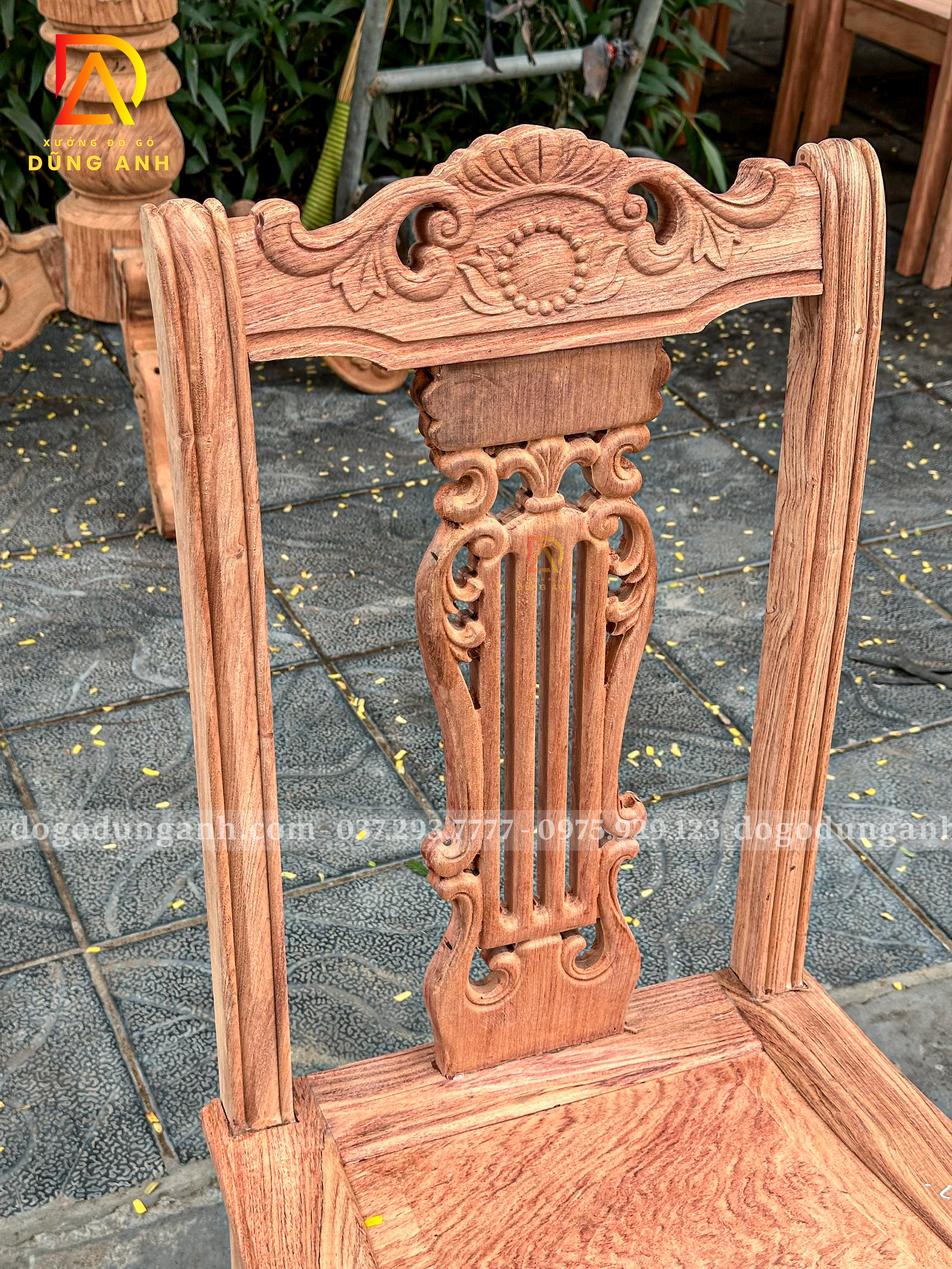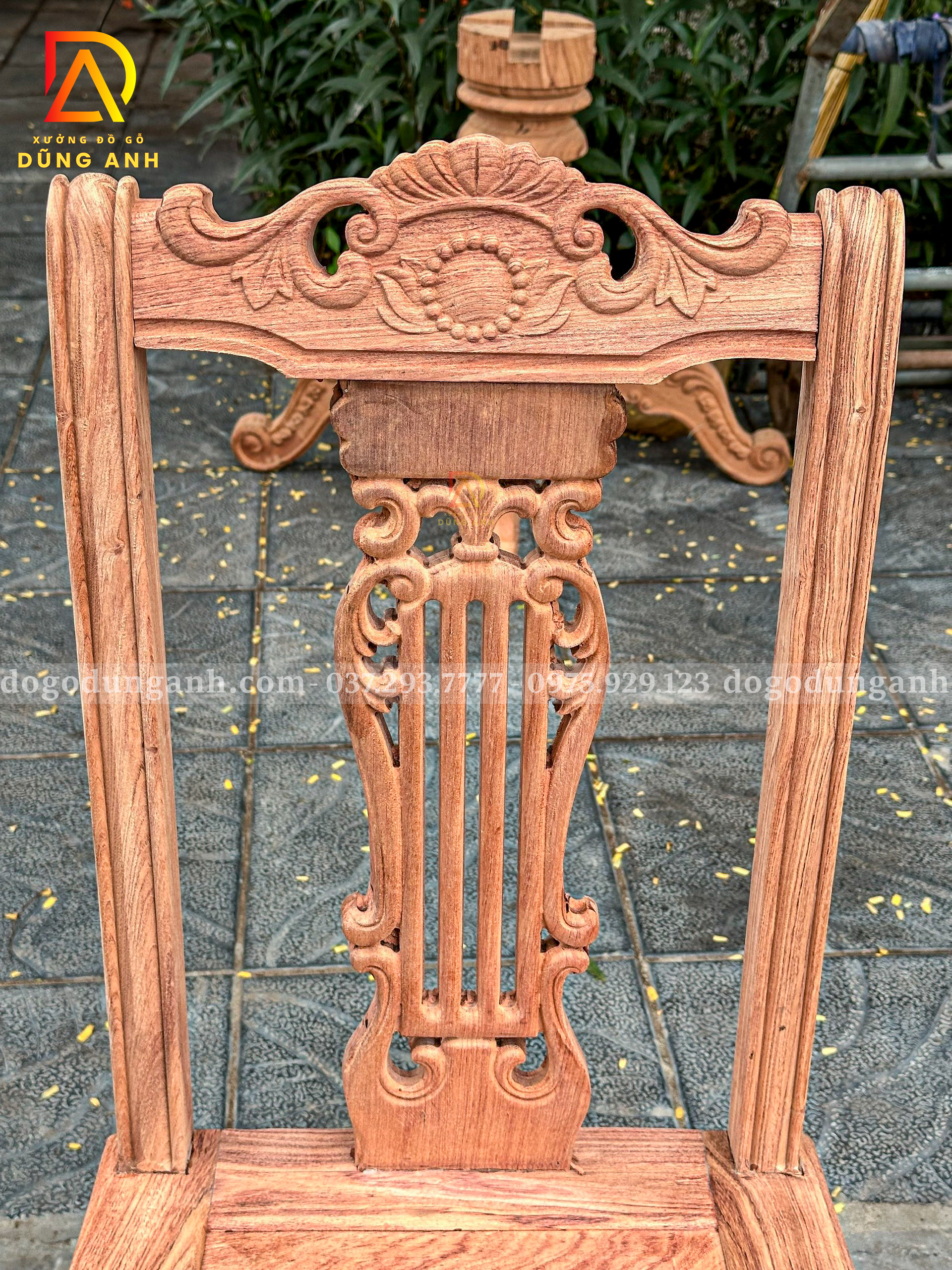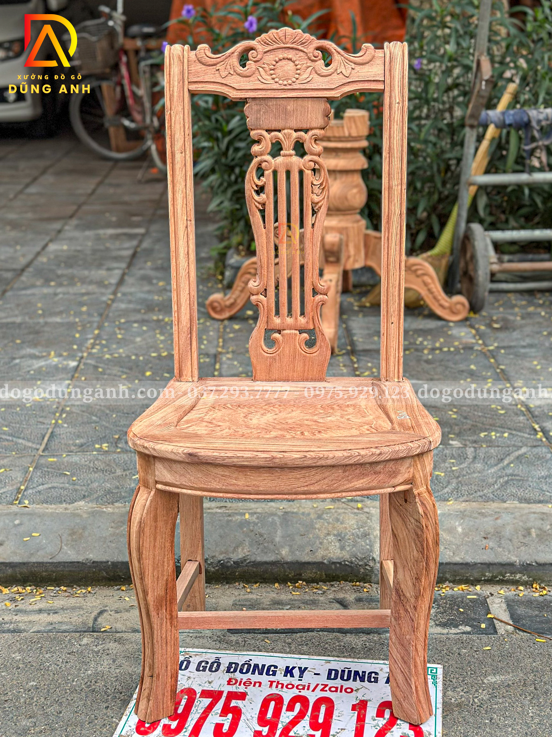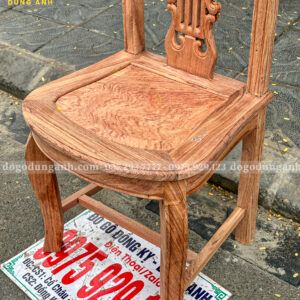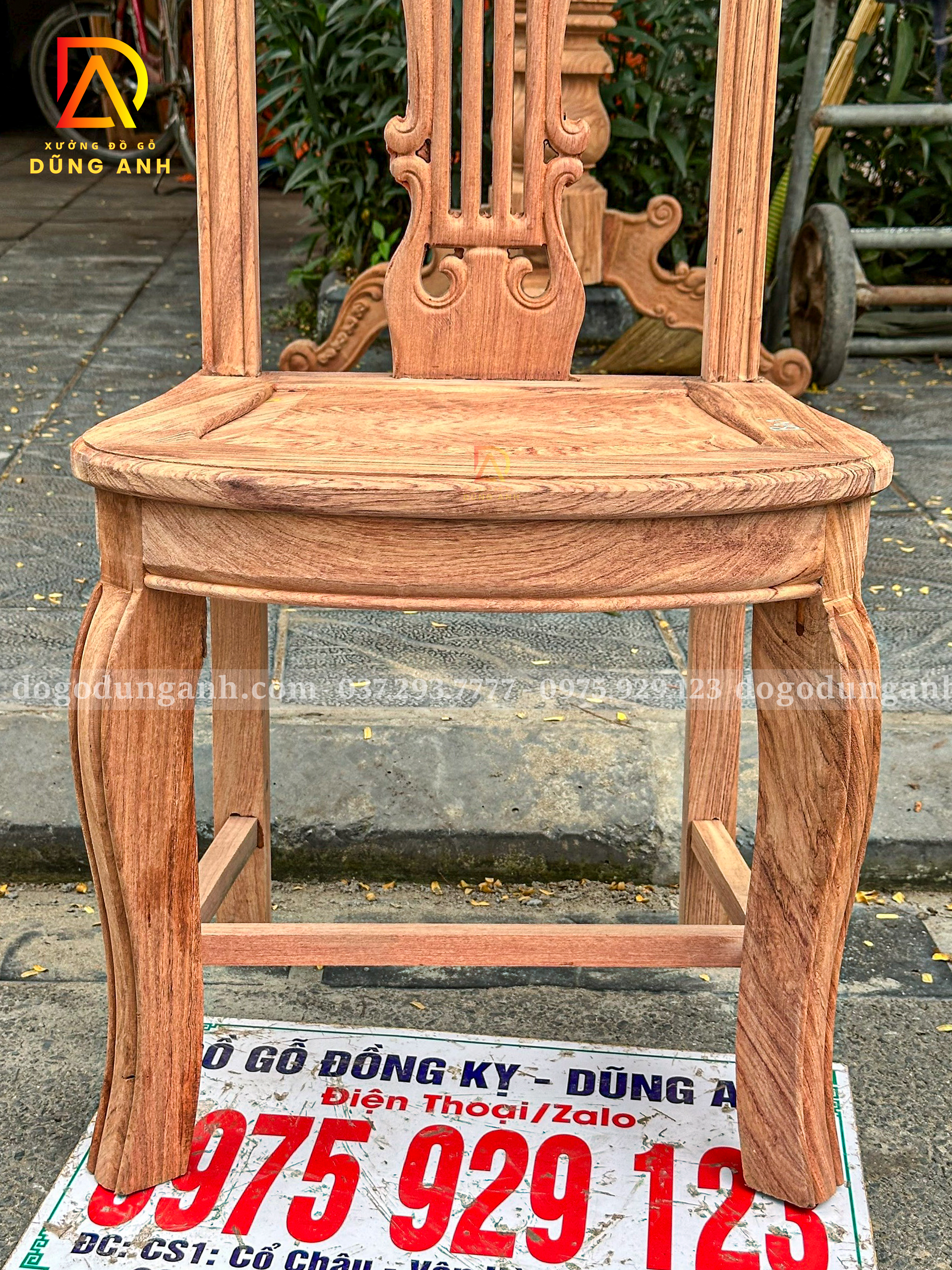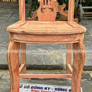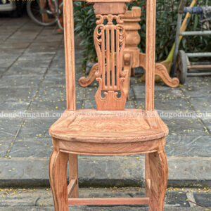 Ghế ăn với chương và vách liền nguyên khối, hoa văn tinh xảo, nổi bật nhất là vách đàn cổ điển – vừa nghệ thuật vừa lạ mắt. Mặt ghế kiểu ván long khung, bo viền mềm mại, tạo nên tổng thể cân đối – thanh thoát – êm ái khi sử dụng