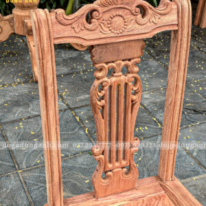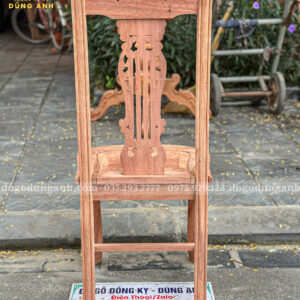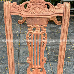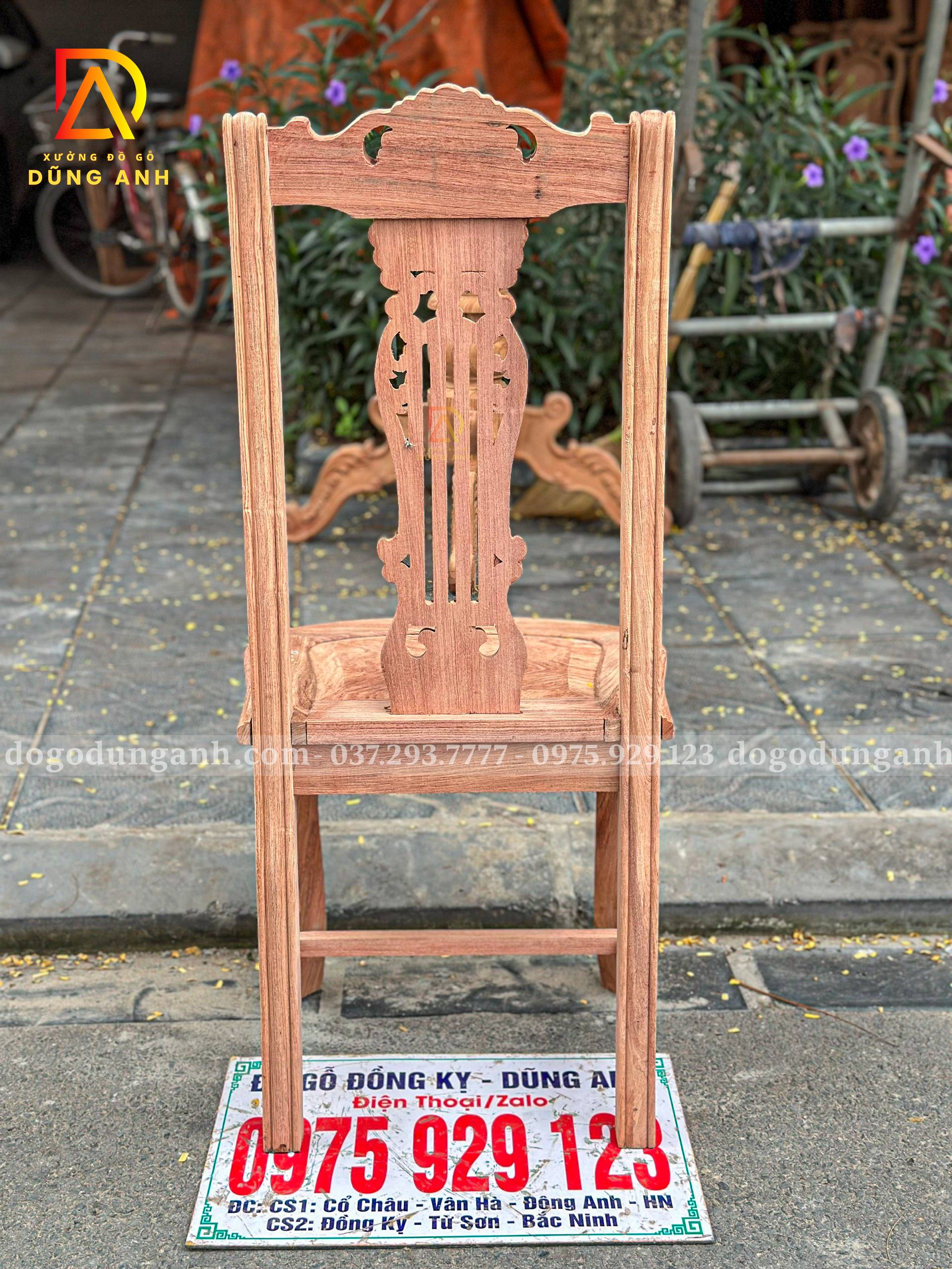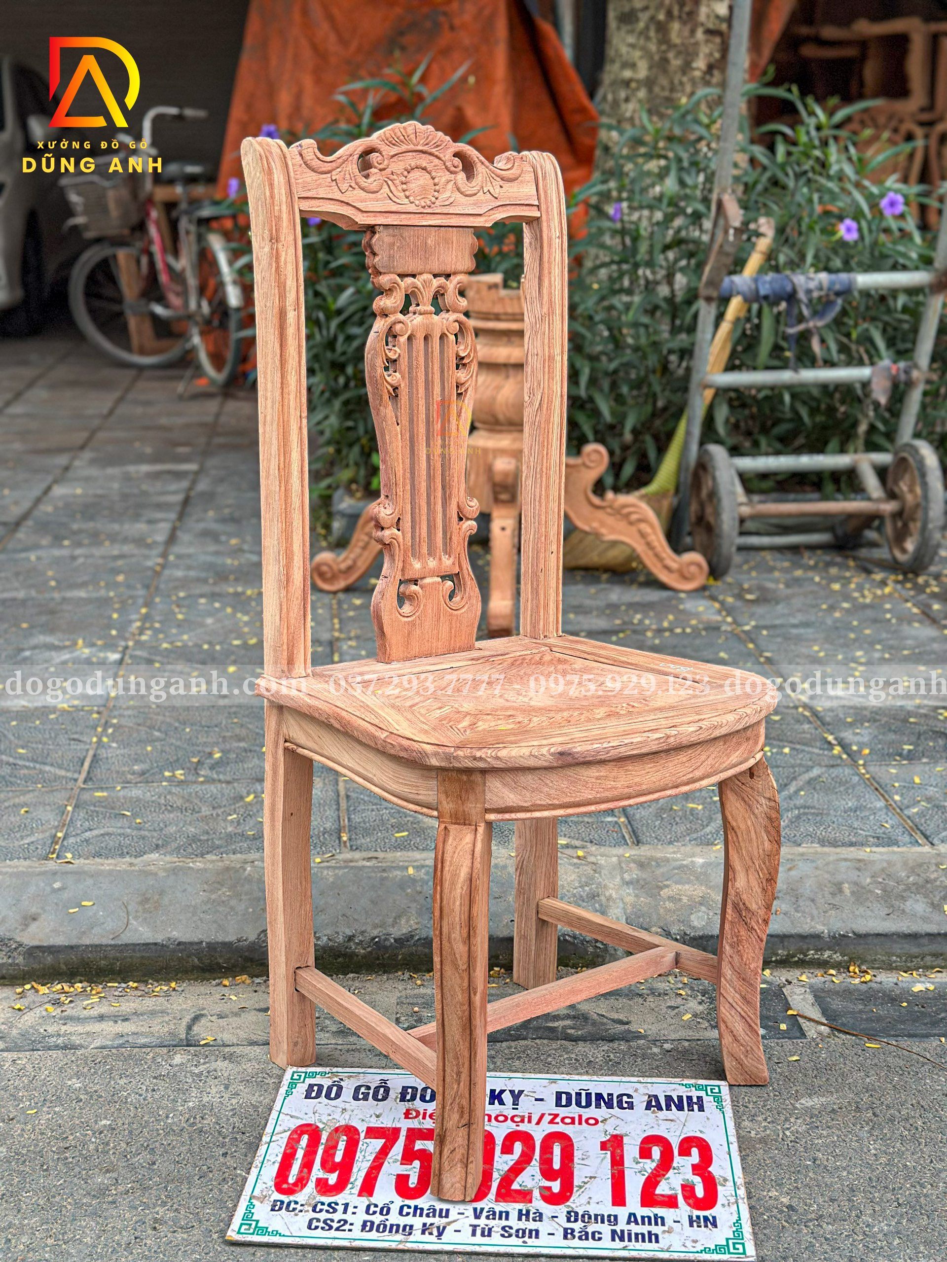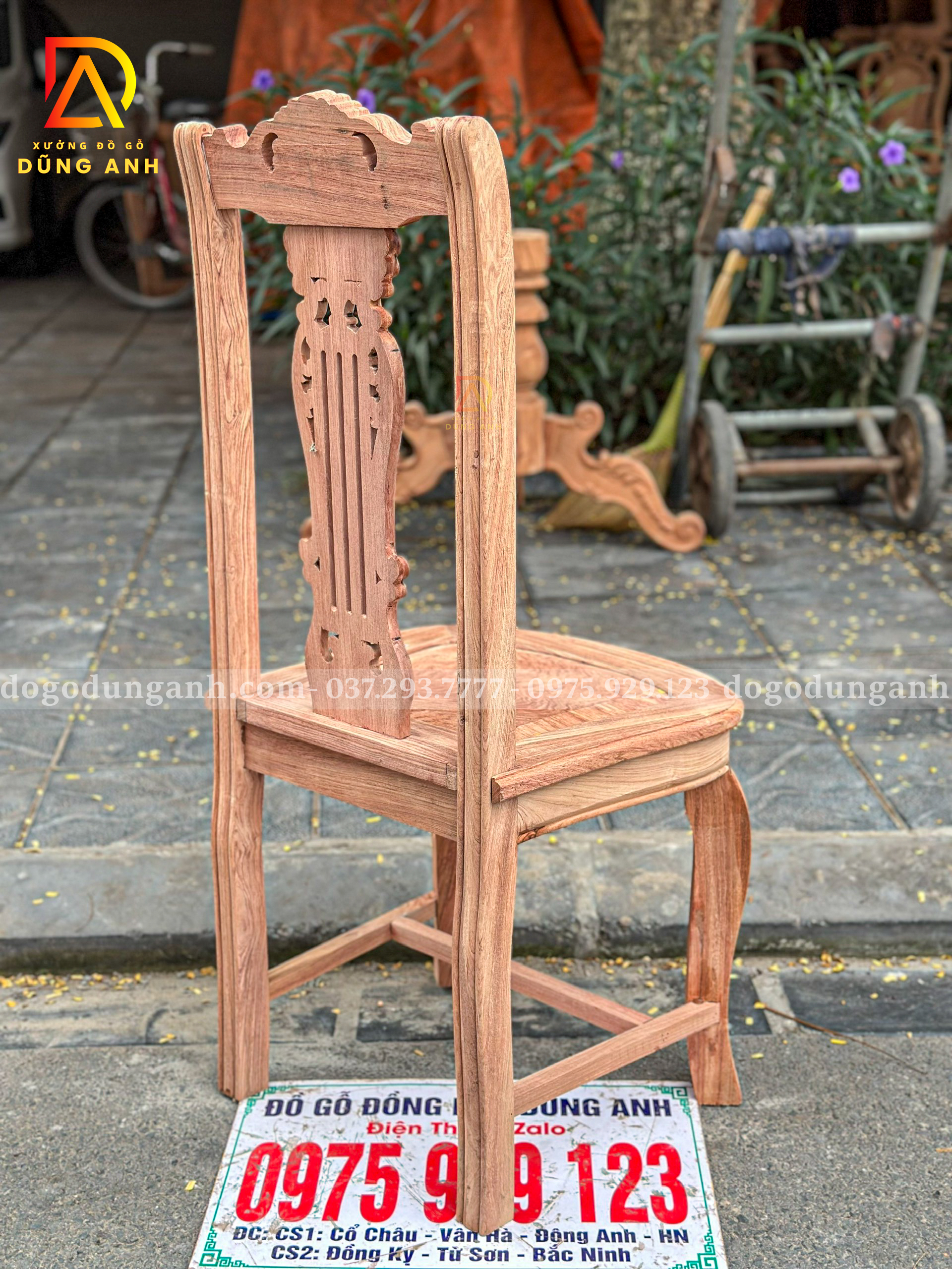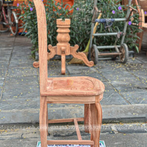 Ghế ăn với chương và vách liền nguyên khối, hoa văn tinh xảo, nổi bật nhất là vách đàn cổ điển – vừa nghệ thuật vừa lạ mắt. Mặt ghế kiểu ván long khung, bo viền mềm mại, tạo nên tổng thể cân đối – thanh thoát – êm ái khi sử dụng