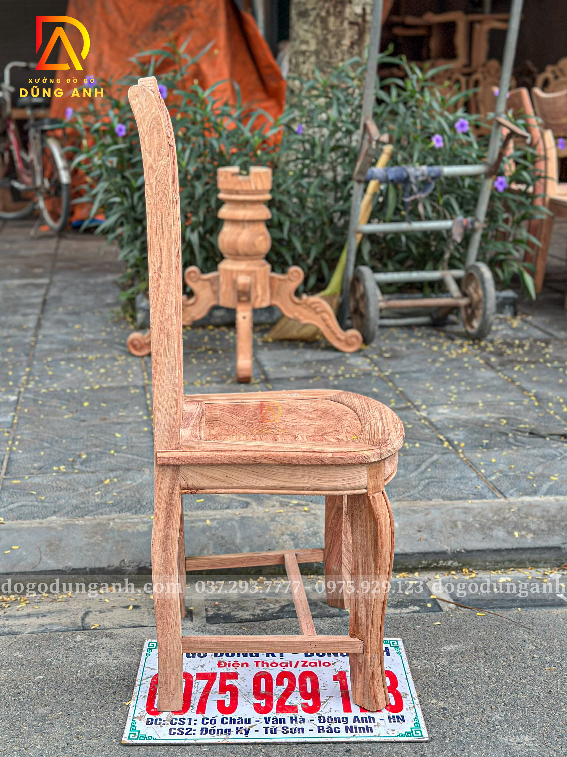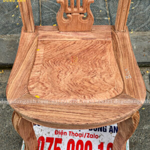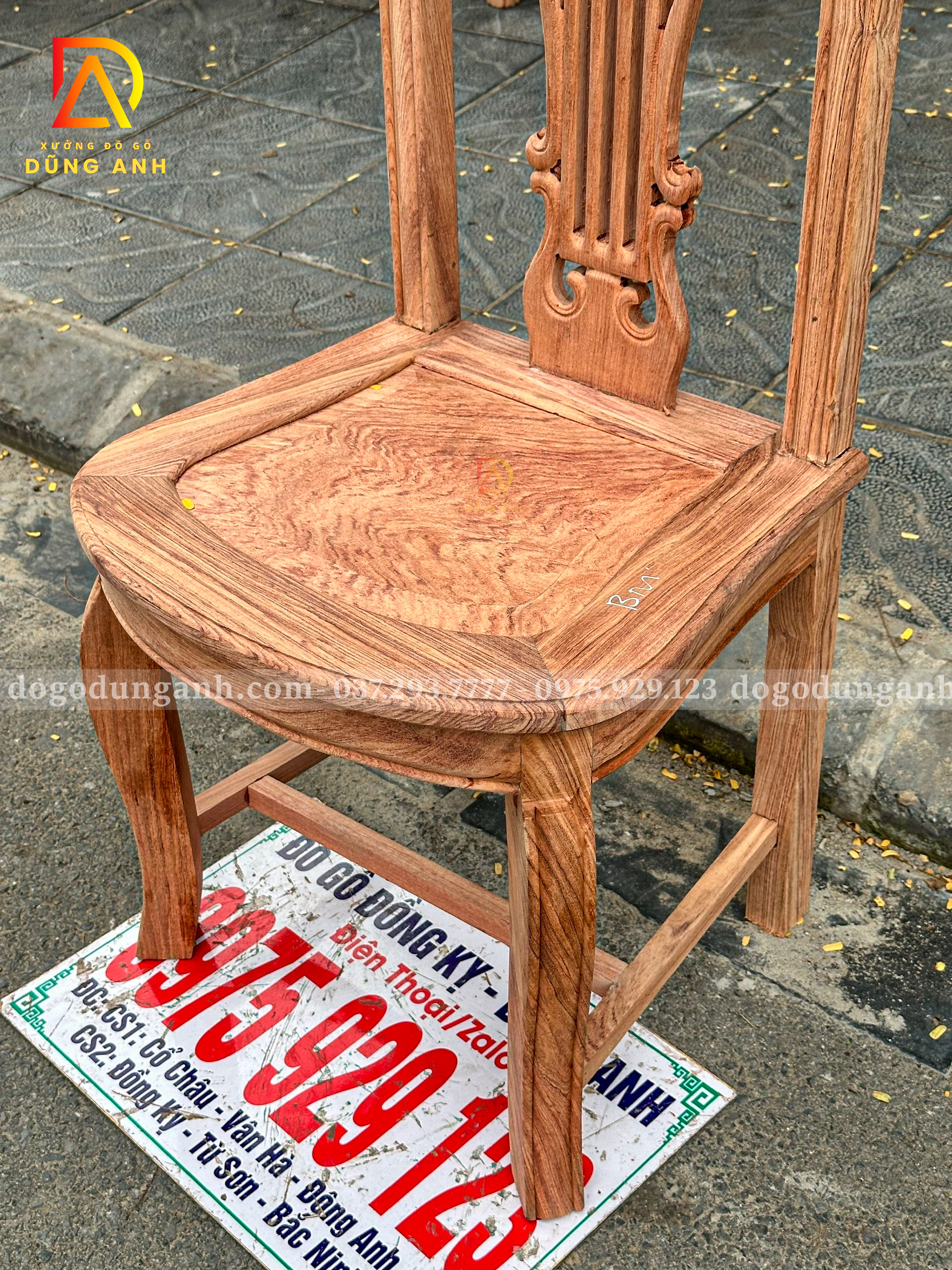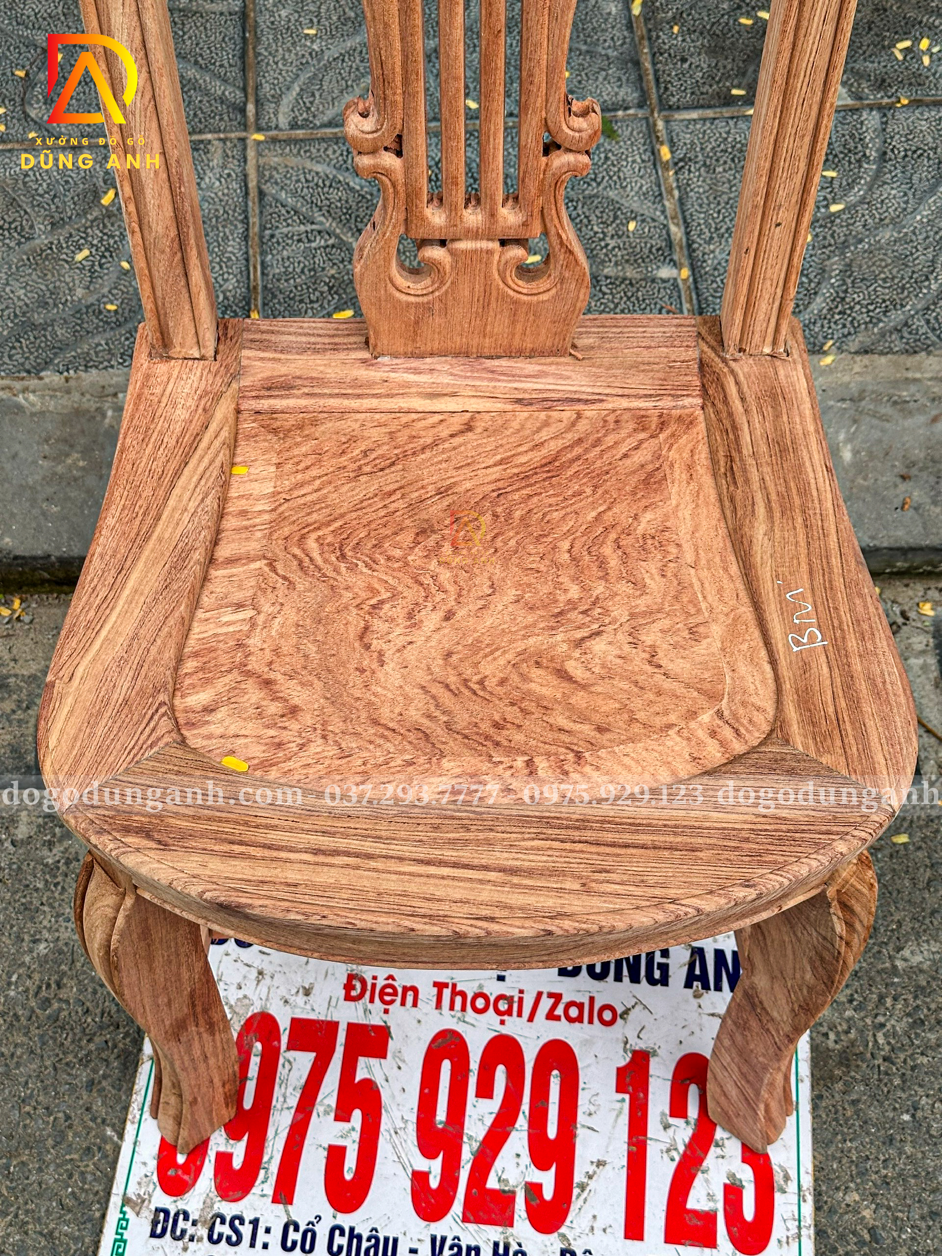 Toàn bộ ghế được làm từ gỗ hương đá chọn vân đẹp, phần vân gỗ sắc nét, đều màu, càng nổi bật hơn khi hoàn thiện phủ màu. Kiểu dáng tổng thể cân đối, lưng tựa ôm nhẹ, tạo cảm giác thoải mái khi sử dụng