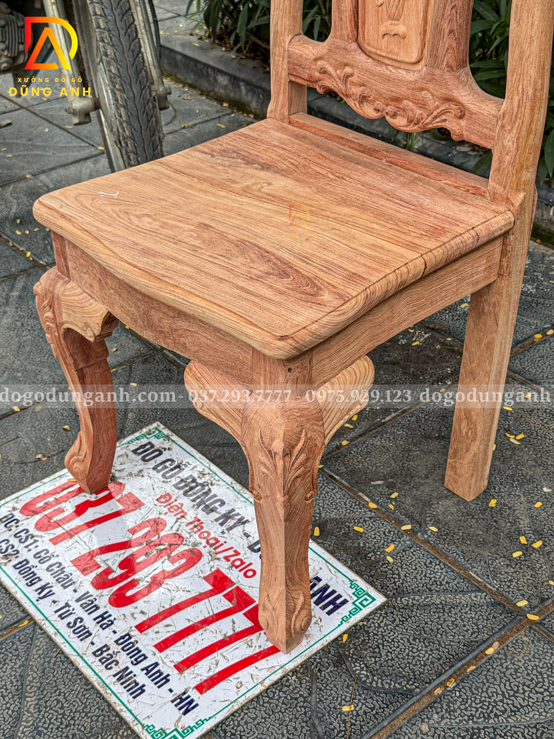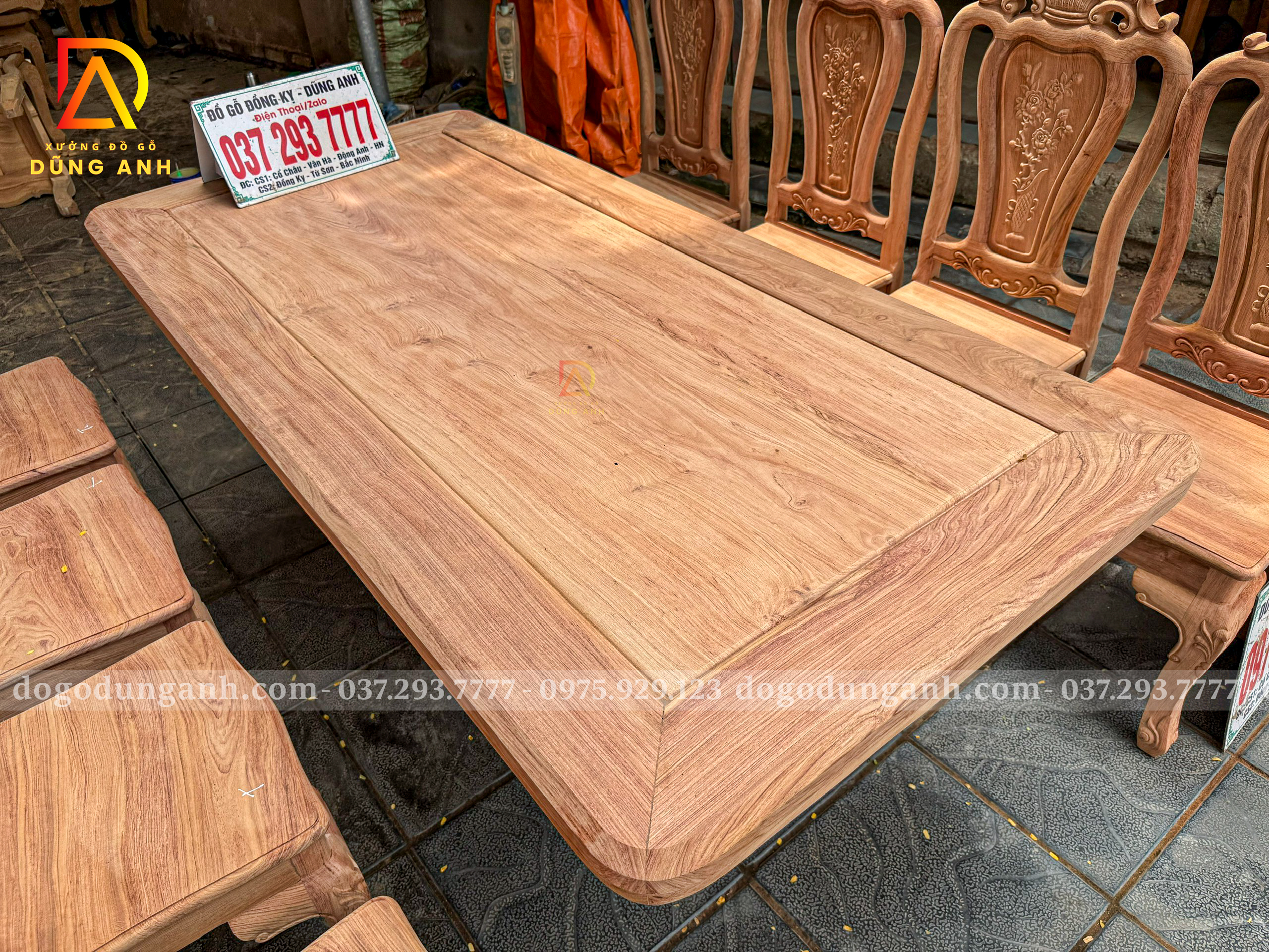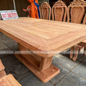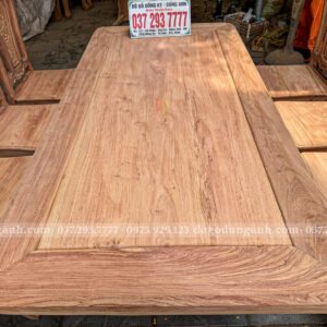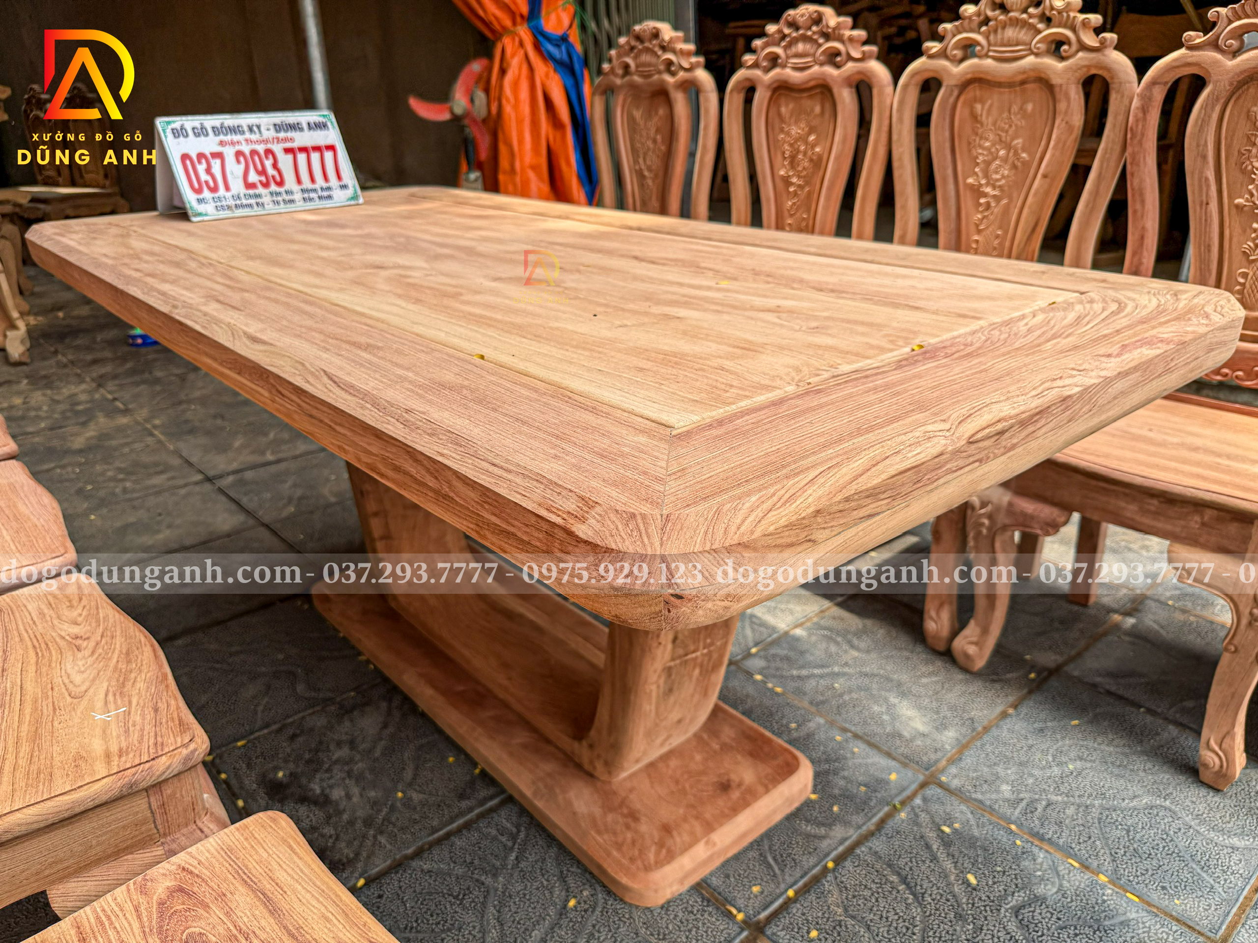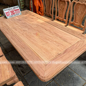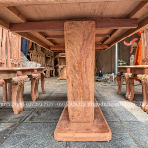 Sản phẩm được chế tác từ gỗ Hương Đá , nổi tiếng với vân gỗ sắc nét, thớ gỗ chắc và độ ổn định cao theo thời gian. Điểm nhấn khác biệt nằm ở phần mặt bàn với khuôn tranh kép dày 8 cm, được soi chỉ tỉ mỉ thay vì để mặt trơn như thông thường. Thiết kế này không chỉ làm nổi bật đường nét của mặt bàn mà còn tăng chiều sâu thị giác, mang đến vẻ tinh tế, sang trọng và độc đáo cho tổng thể bộ sản phẩm