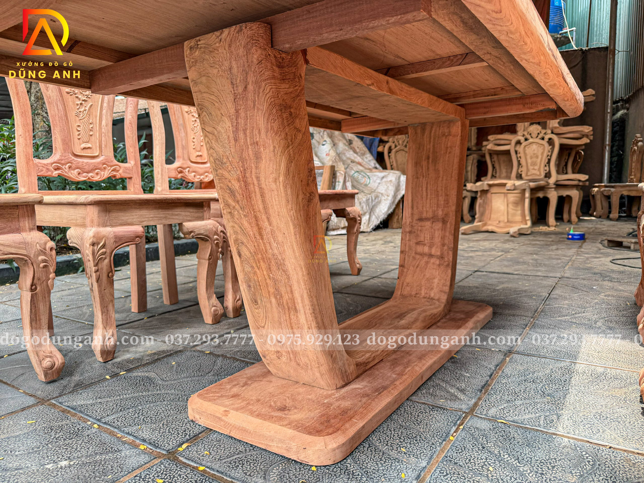 Bộ bàn ăn nổi bật với thiết kế chân bàn chữ U vát xéo – điểm nhấn tạo nên phong cách hiện đại đầy cuốn hút. Phần chân trụ được chế tác nguyên khối từ gỗ hương đá, đảm bảo sự chắc chắn và độ bền vượt trội theo thời gian
