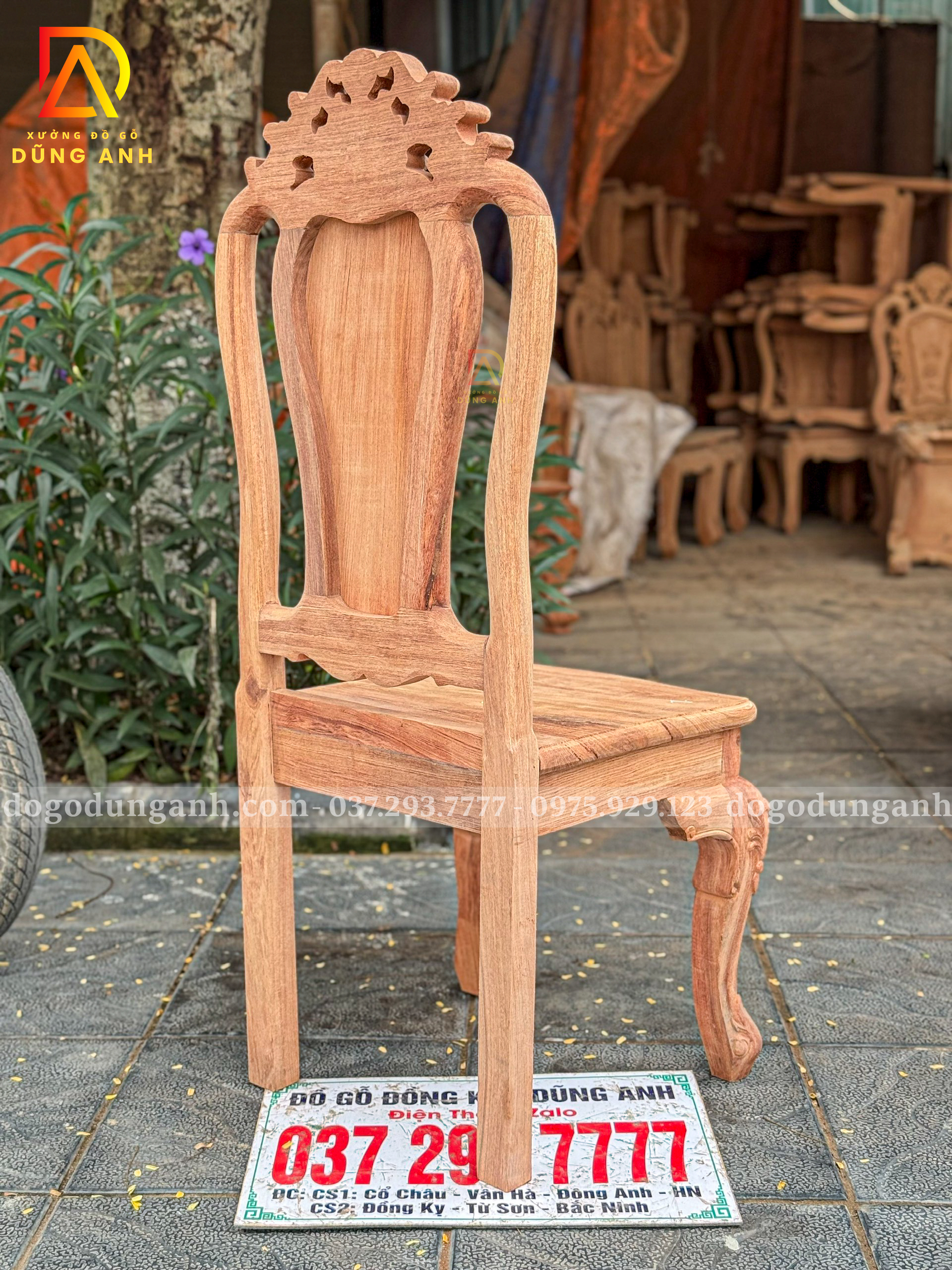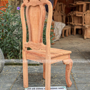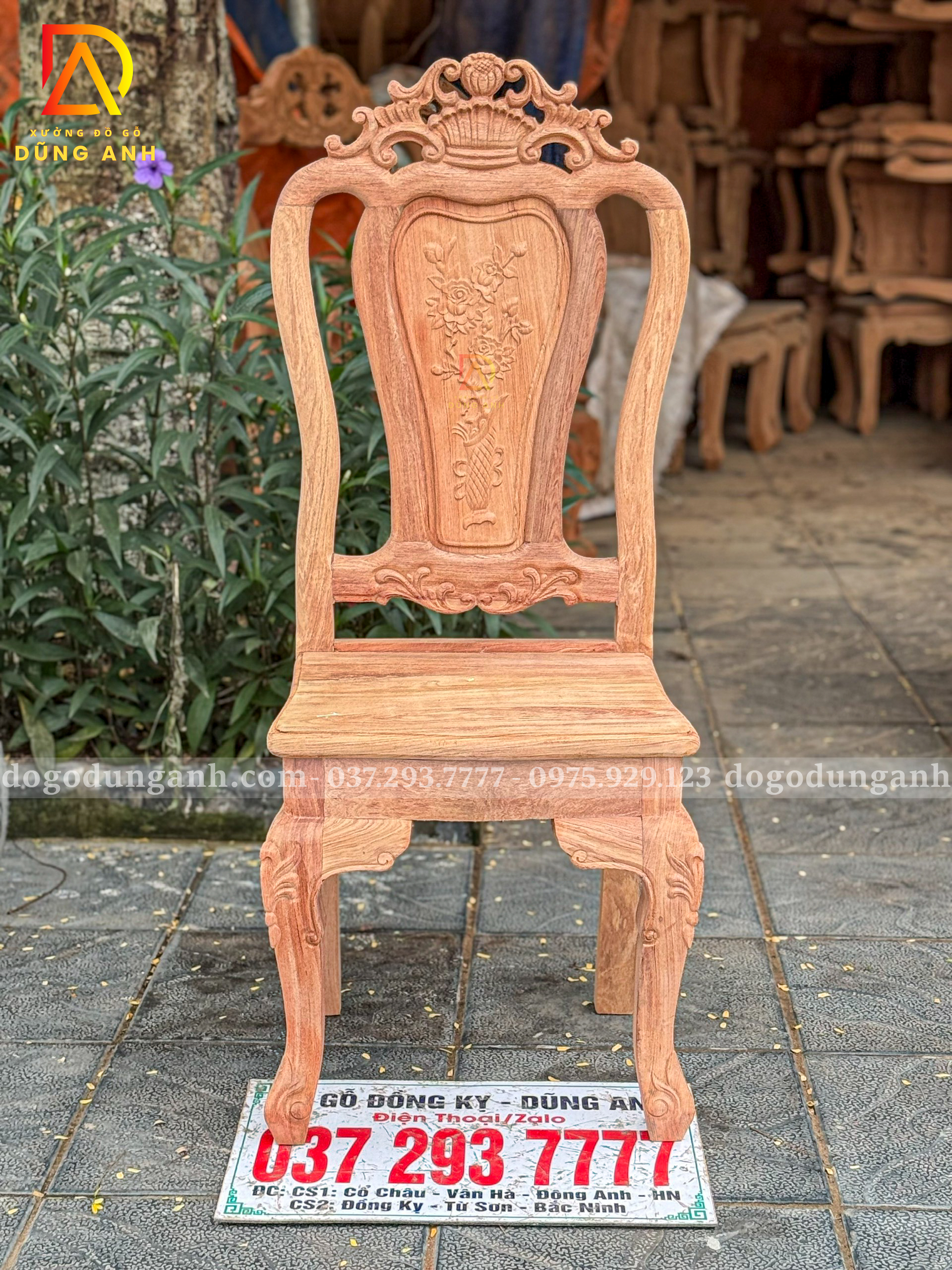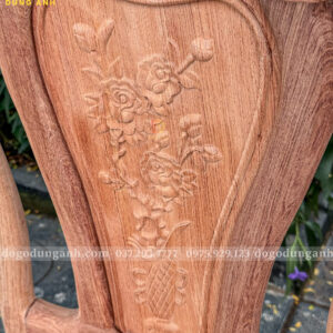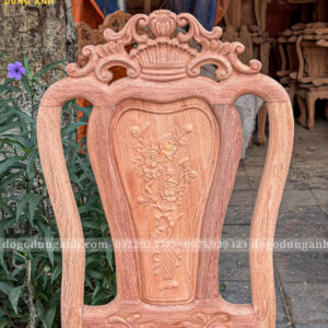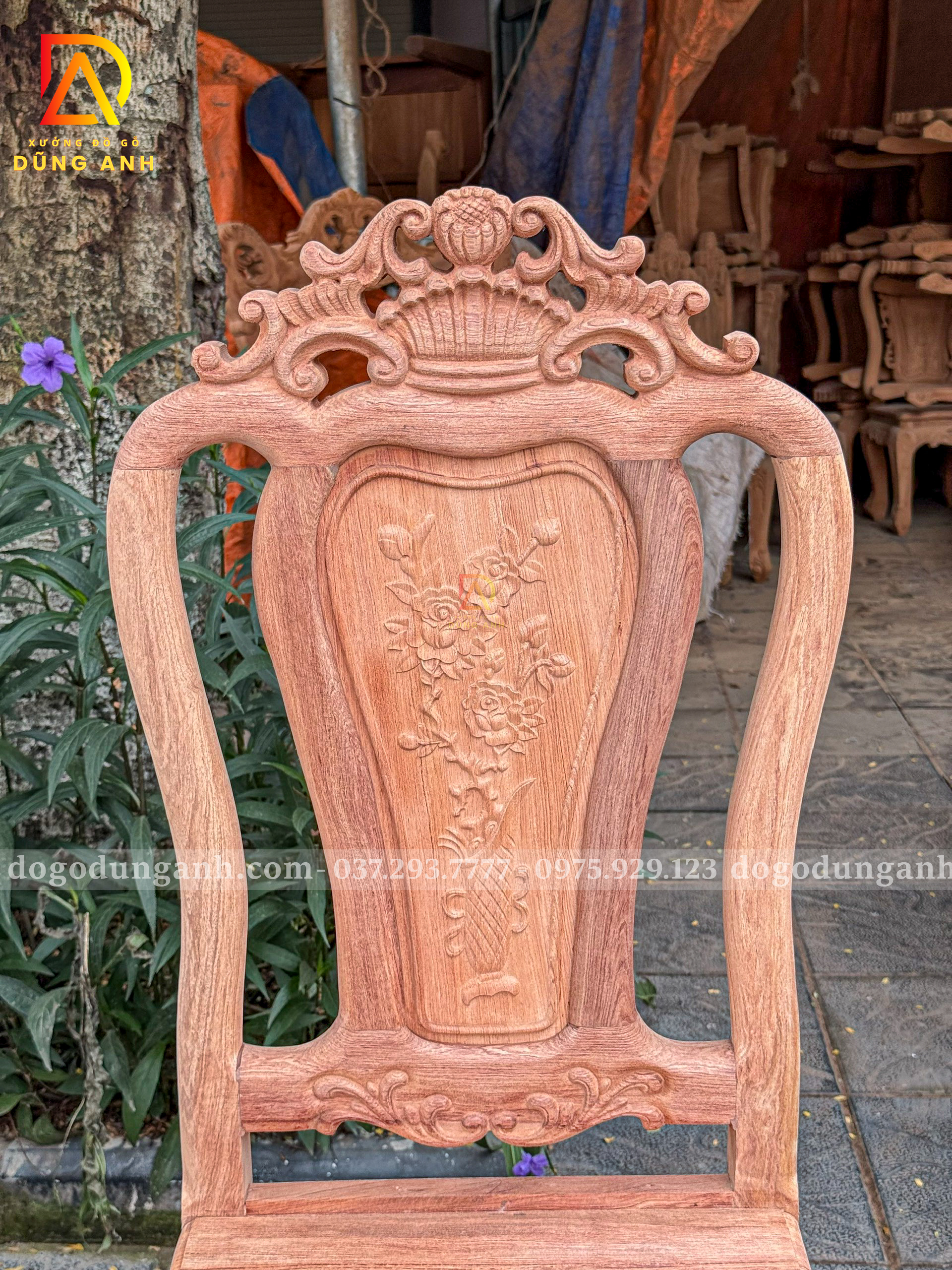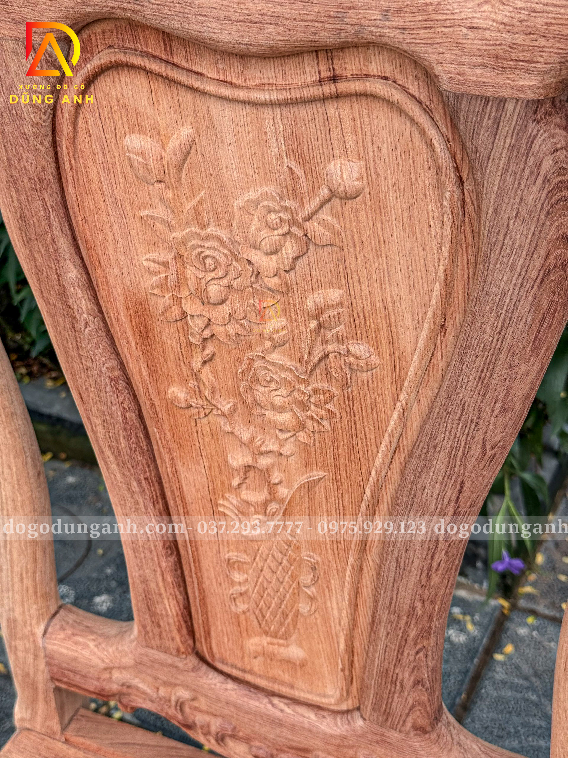 - Trung tâm đục bình hoa: Hình ảnh bình hoa cổ đầy ý nghĩa được đục thủ công ngay giữa lưng ghế, thể hiện sự trọn vẹn – viên mãn, biểu tượng của sự sung túc và đủ đầy