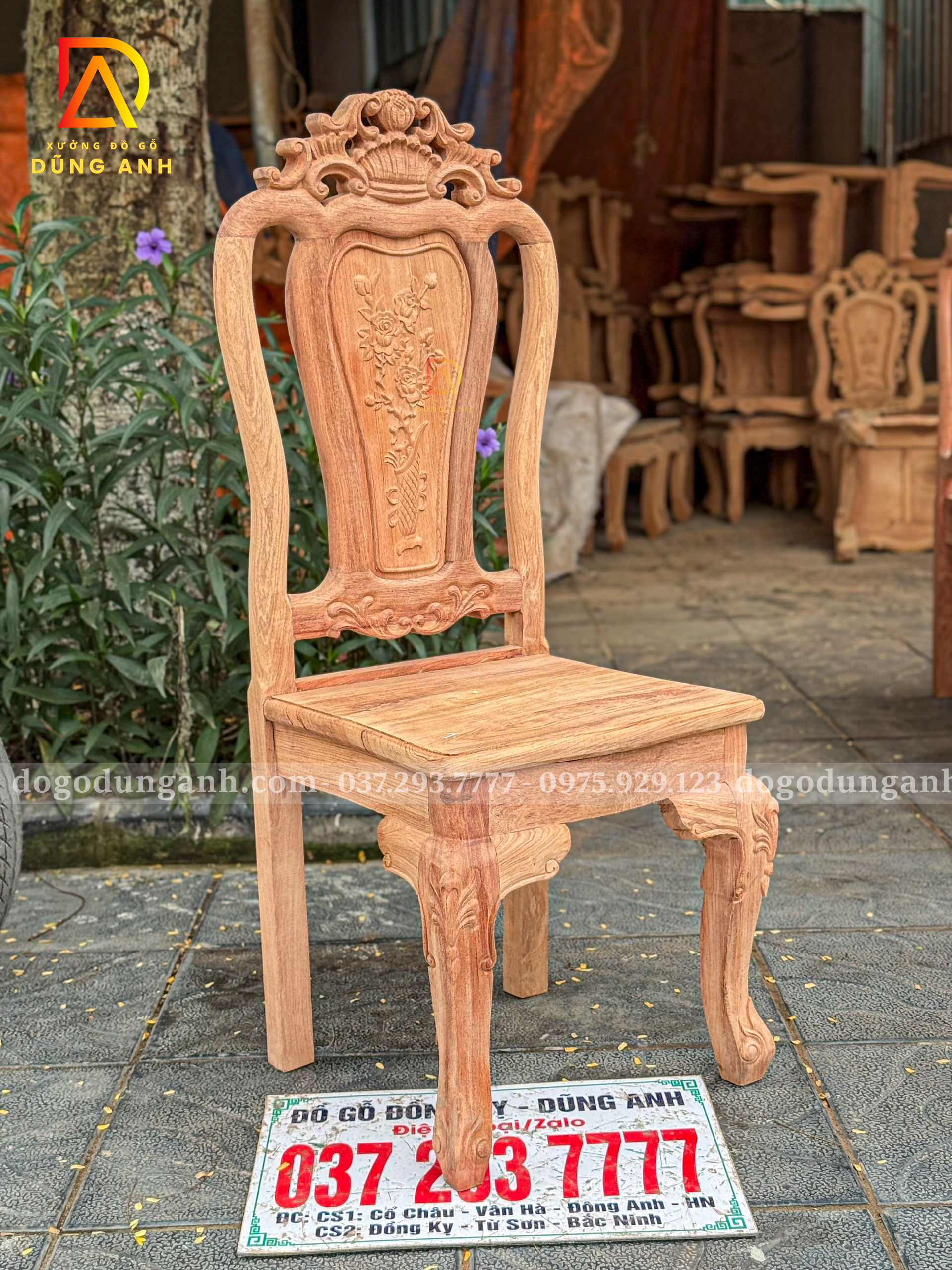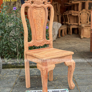 🔸 Kiểu dáng ghế: Mẫu ghế Hoa Cúc đục chạm thủ công, họa tiết nổi bật trên phần lưng tựa, form ghế lớn, dáng lưng liền cong mềm mại, tay khoét nhẹ tạo cảm giác thoáng và tiện di chuyển