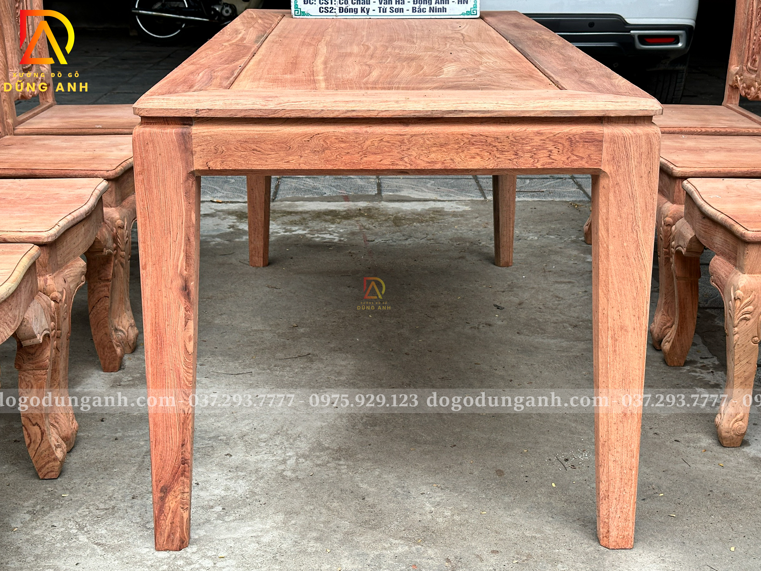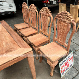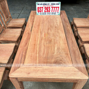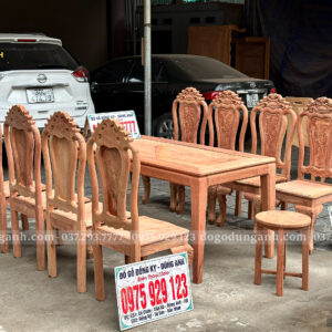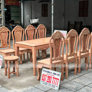 Đồ Gỗ Dũng Anh trân trọng giới thiệu tới quý khách hàng mẫu bộ bàn ăn chữ nhật 4 chân kết hợp 8 ghế hoa cúc – sản phẩm được chế tác từ gỗ Hương Đá Nam Phi cao cấp, mang phong cách sang trọng, bền bỉ và phù hợp với nhiều không gian sống hiện đại