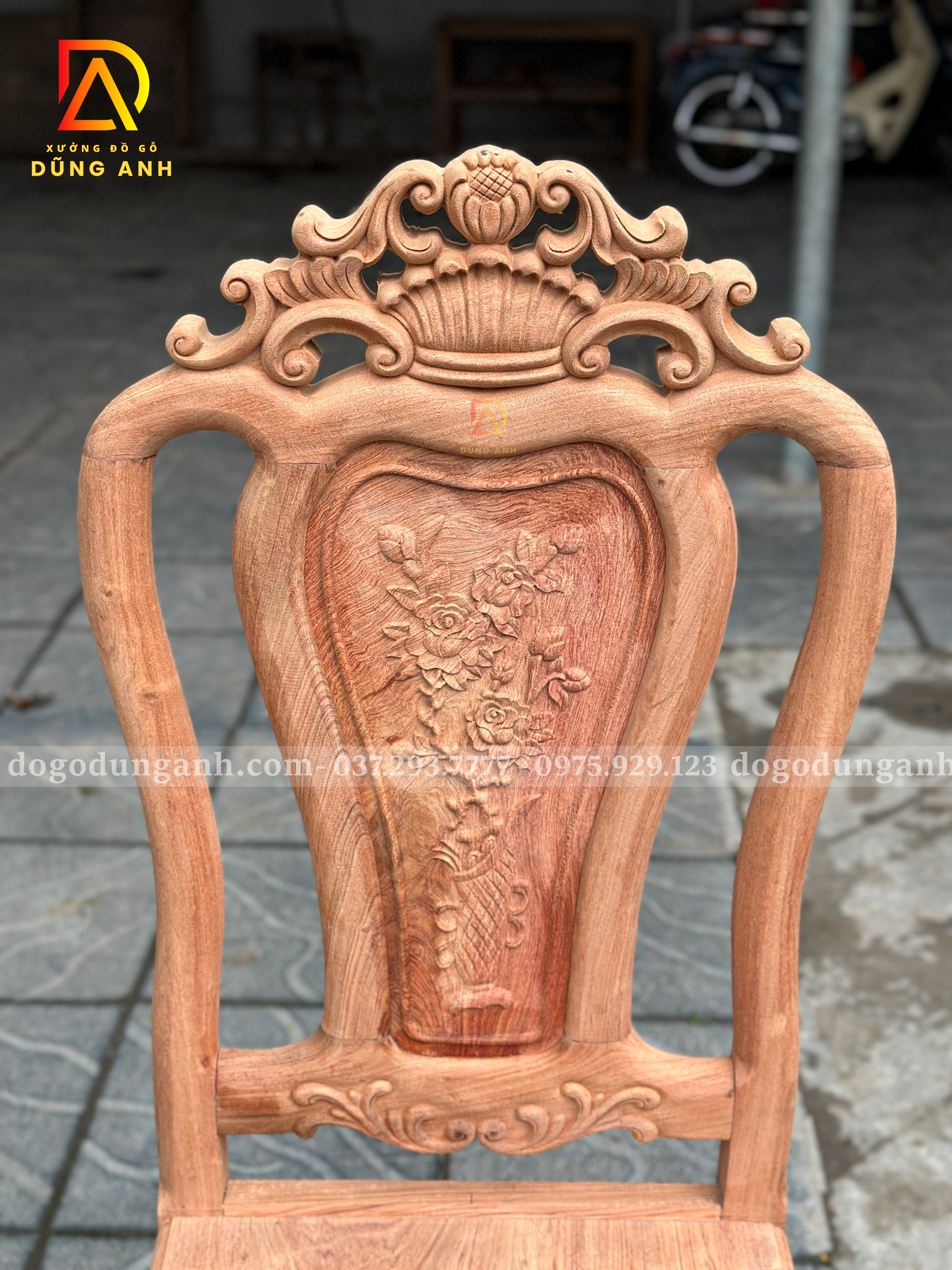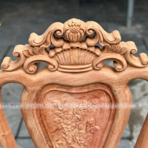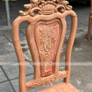 - Trung tâm đục bình hoa: Hình ảnh bình hoa cổ đầy ý nghĩa được đục thủ công ngay giữa lưng ghế, thể hiện sự trọn vẹn – viên mãn, biểu tượng của sự sung túc và đủ đầy
