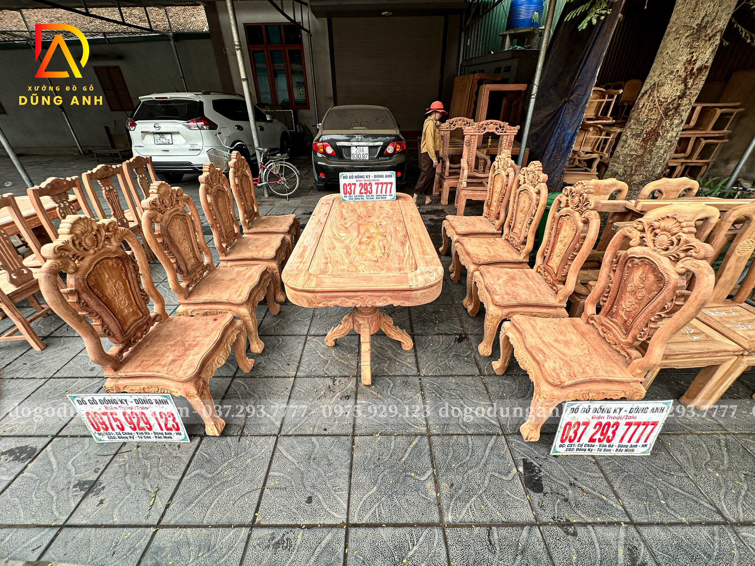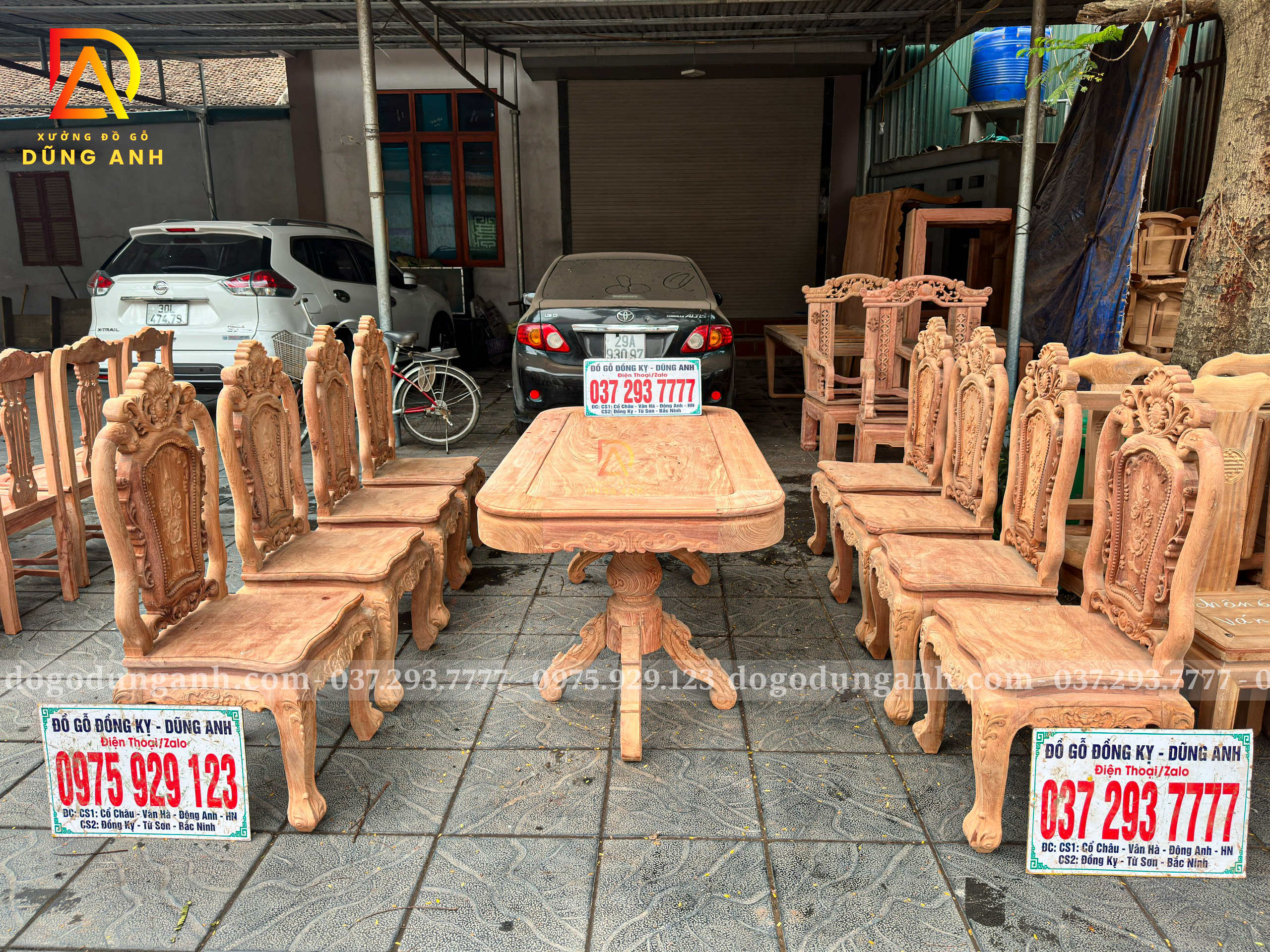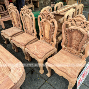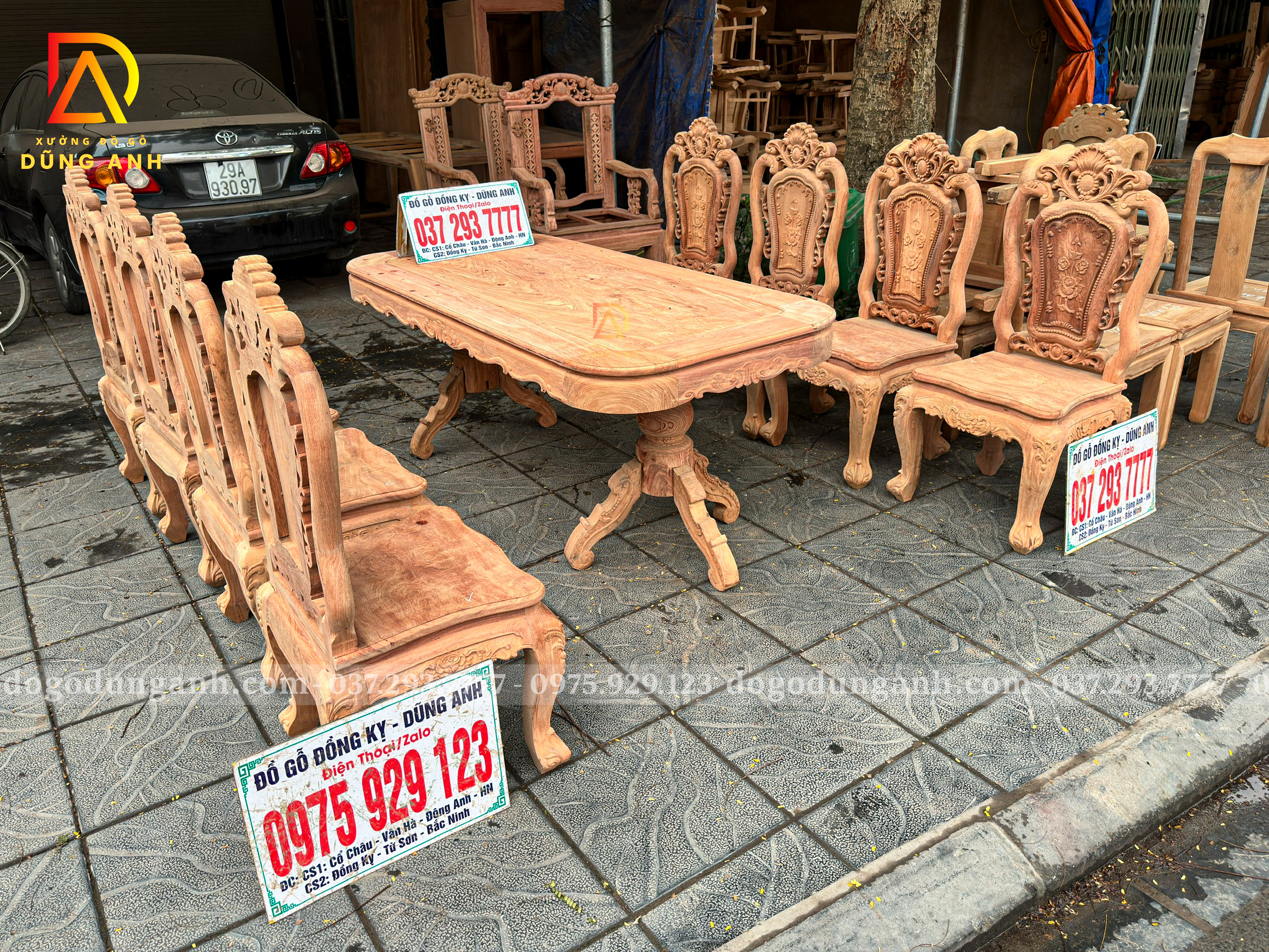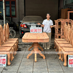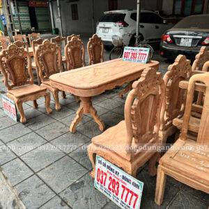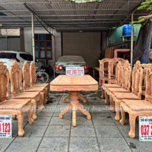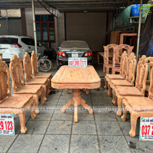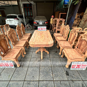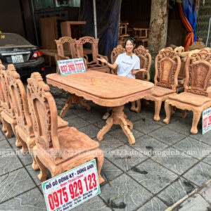 Đây là mẫu bàn ăn cao cấp hội tụ đầy đủ yếu tố đẹp – bền – đẳng cấp, nổi bật với thiết kế hoàng gia, chân trụ độc đáo và ghế đục chạm tinh xảo. Một lựa chọn hoàn hảo cho những khách hàng yêu thích nội thất gỗ tự nhiên cao cấp và giá trị lâu dài.