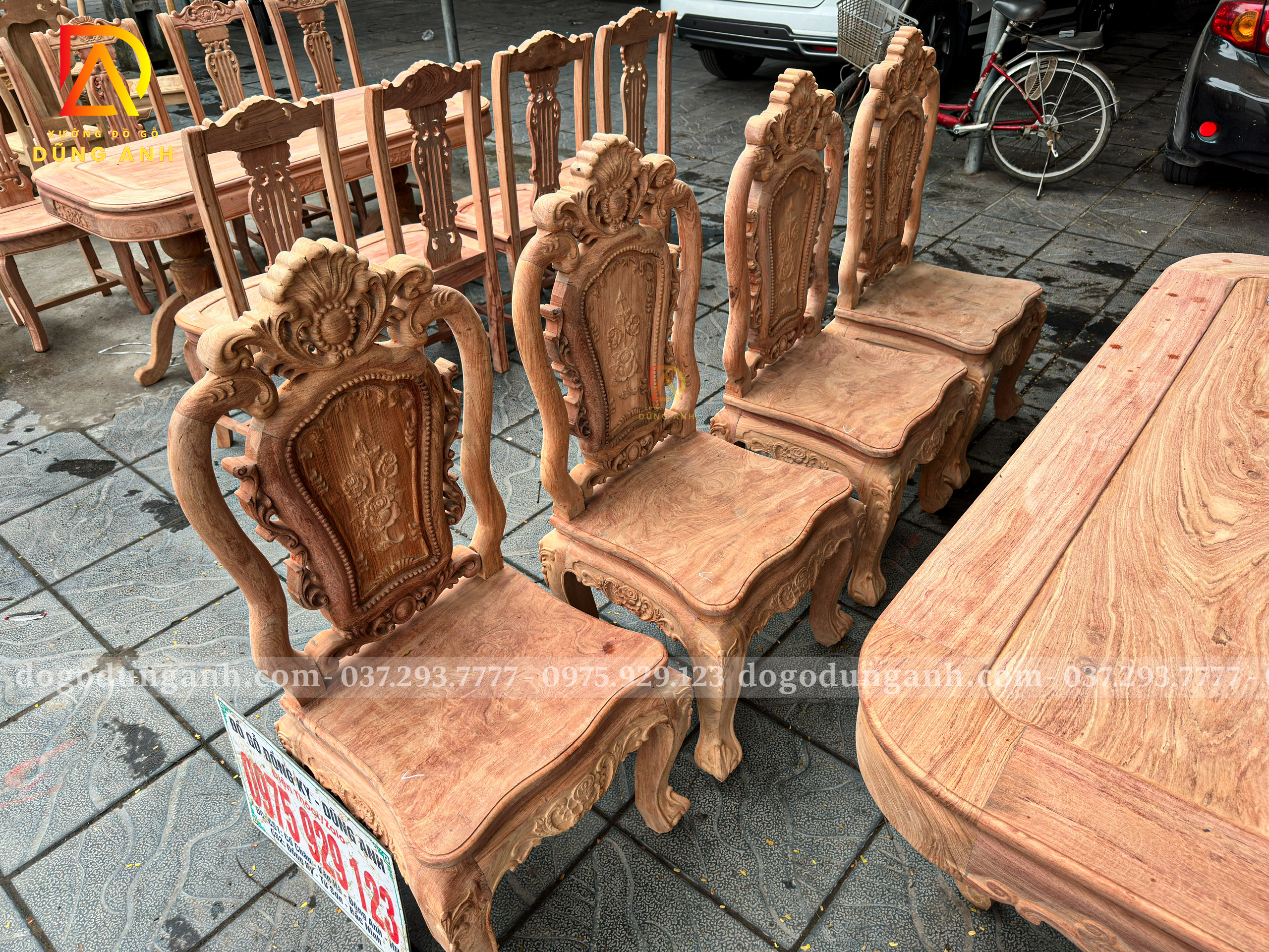 Đồ Gỗ Dũng Anh giới thiệu đến quý khách mẫu bộ bàn ăn chữ nhật 8 ghế louis hoa hồng được chế tác từ gỗ hương đá Nam Phi cao cấp. Sản phẩm nổi bật với thiết kế hoàng gia, đường nét đục chạm tinh xảo, kết hợp chất gỗ tuyển chọn vân đẹp, mang đến không gian phòng ăn sang trọng và đẳng cấp vượt trội