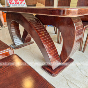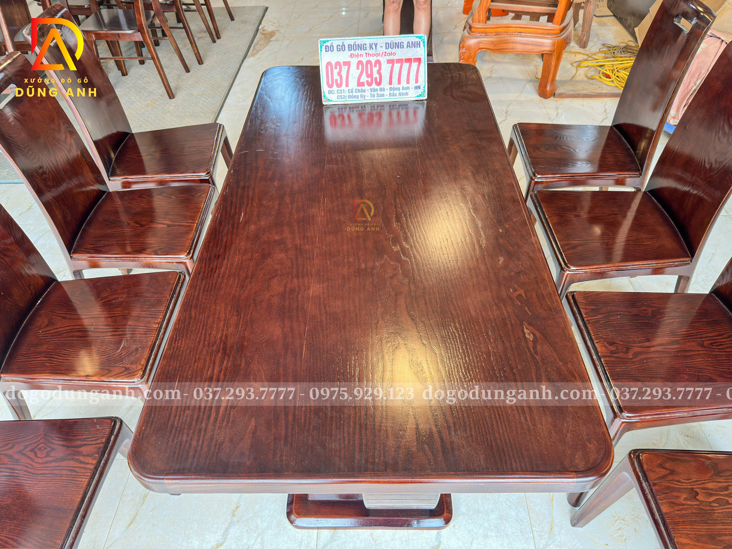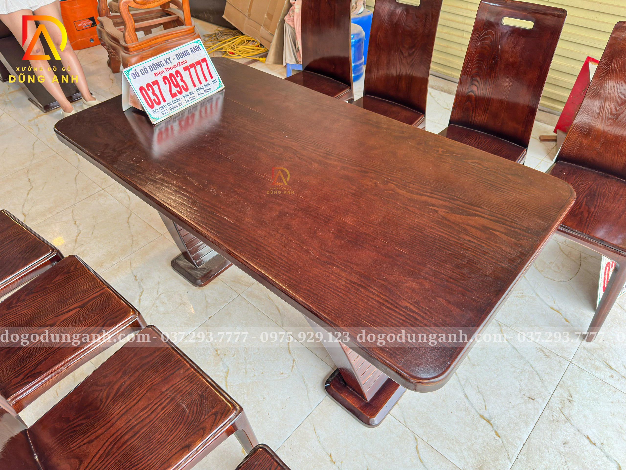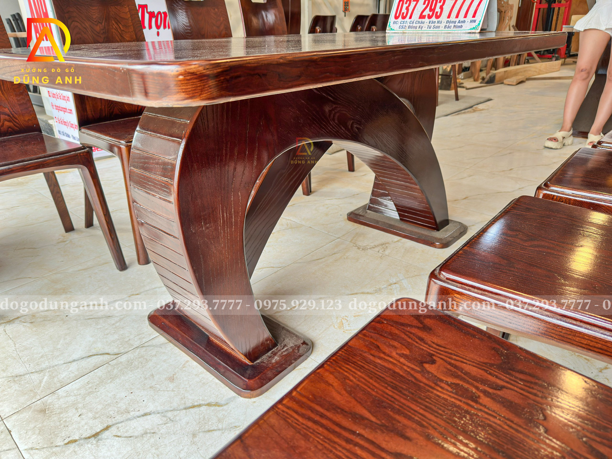 Chiếc bàn chữ nhật vuông vắn, kết hợp chân hộp bản lớn tạo nên cảm giác đầm chắc ngay từ ánh nhìn đầu tiên. Đi cùng là 8 ghế Anh Đào liền khối, thiết kế tối giản nhưng tối ưu trải nghiệm ngồi – vững, êm và cực kỳ thoải mái cho cả gia đình