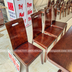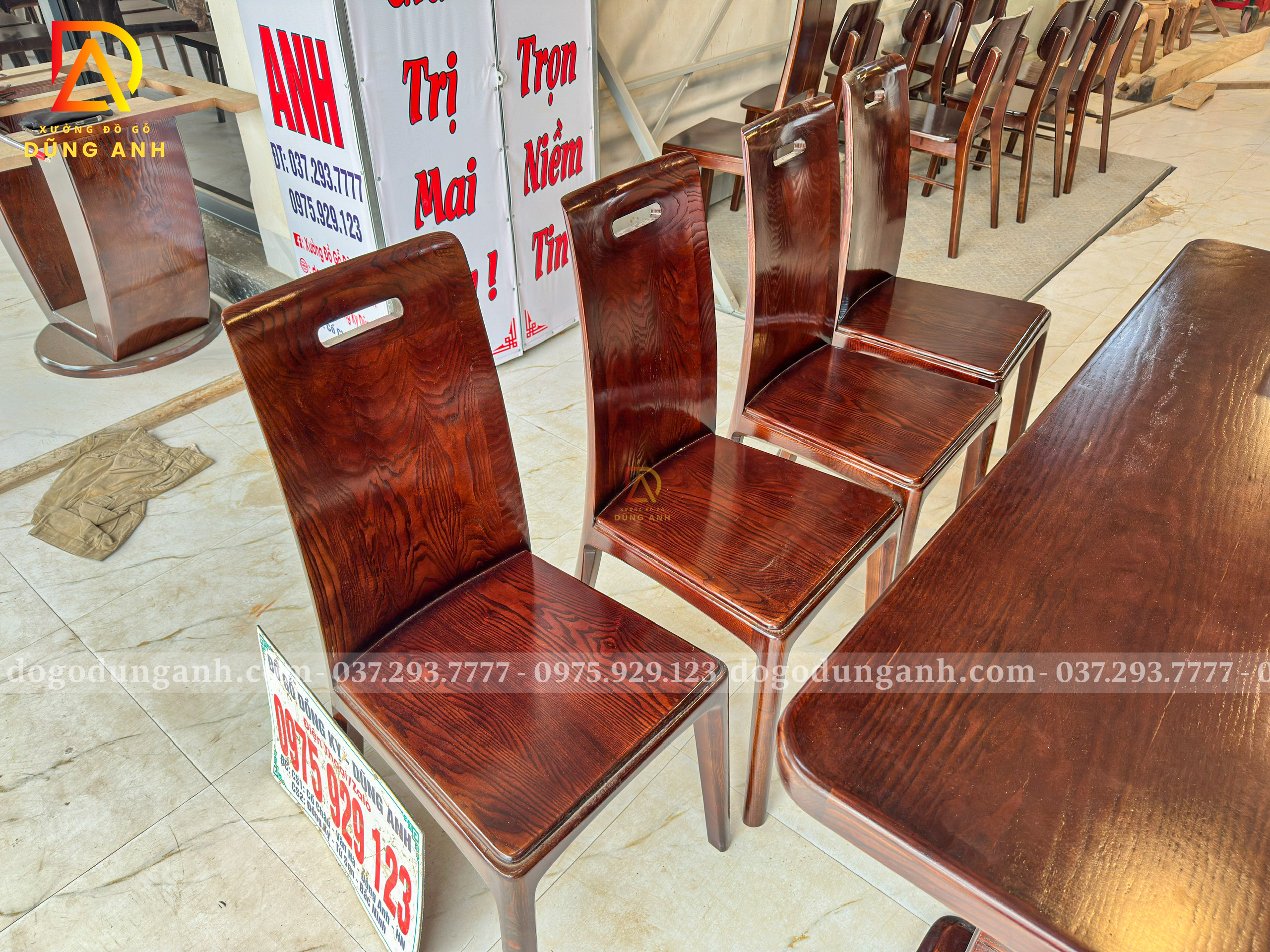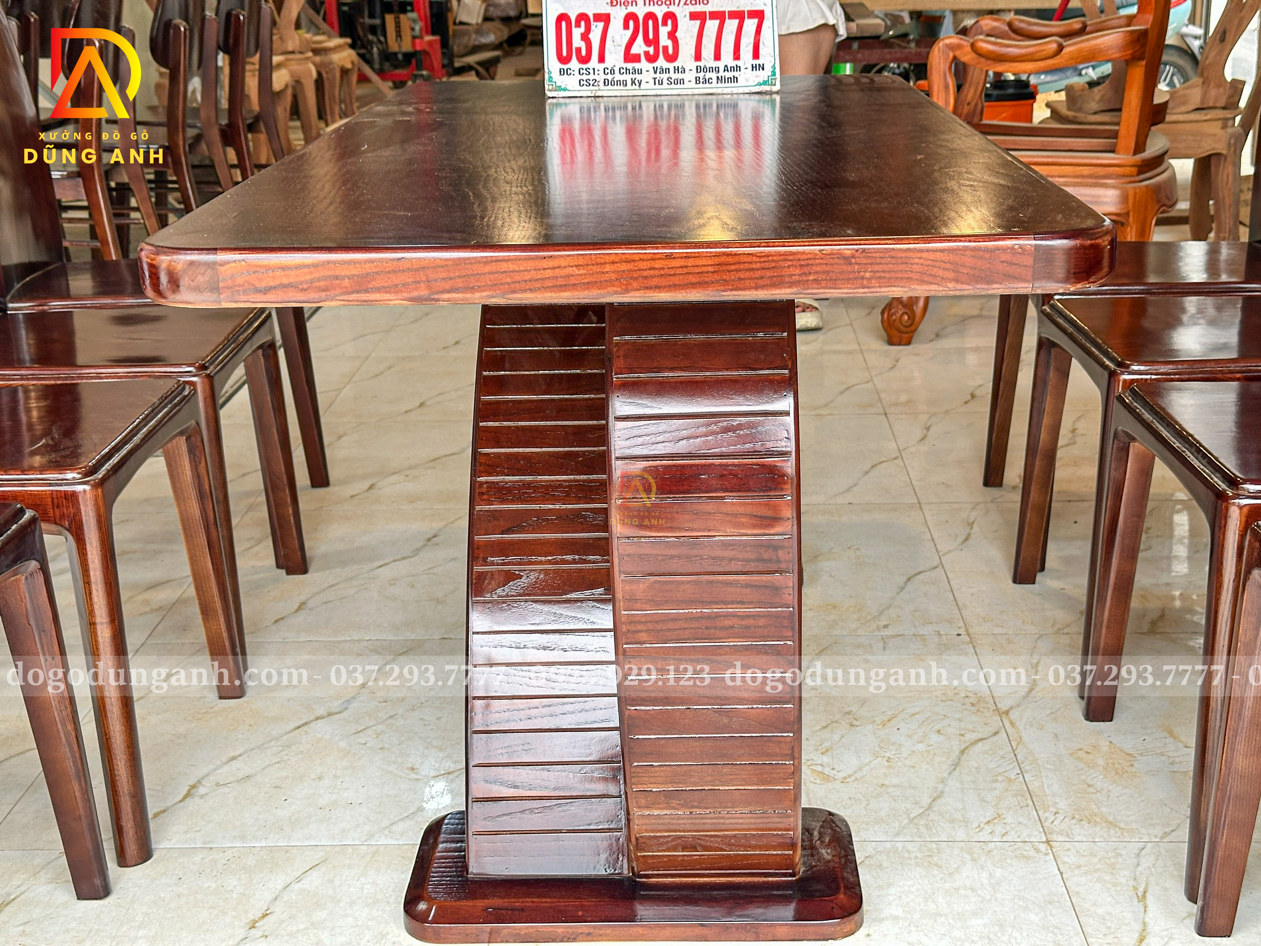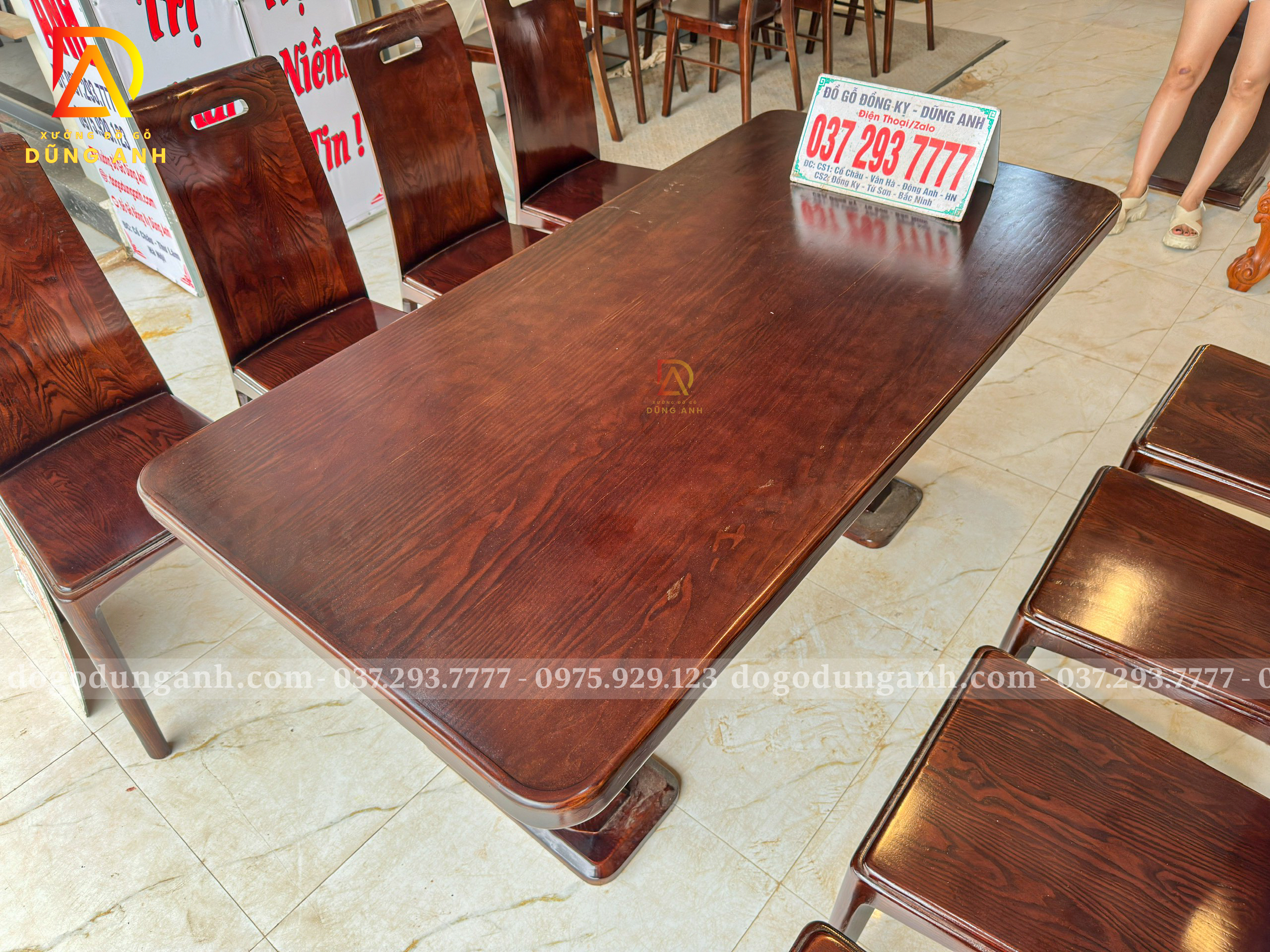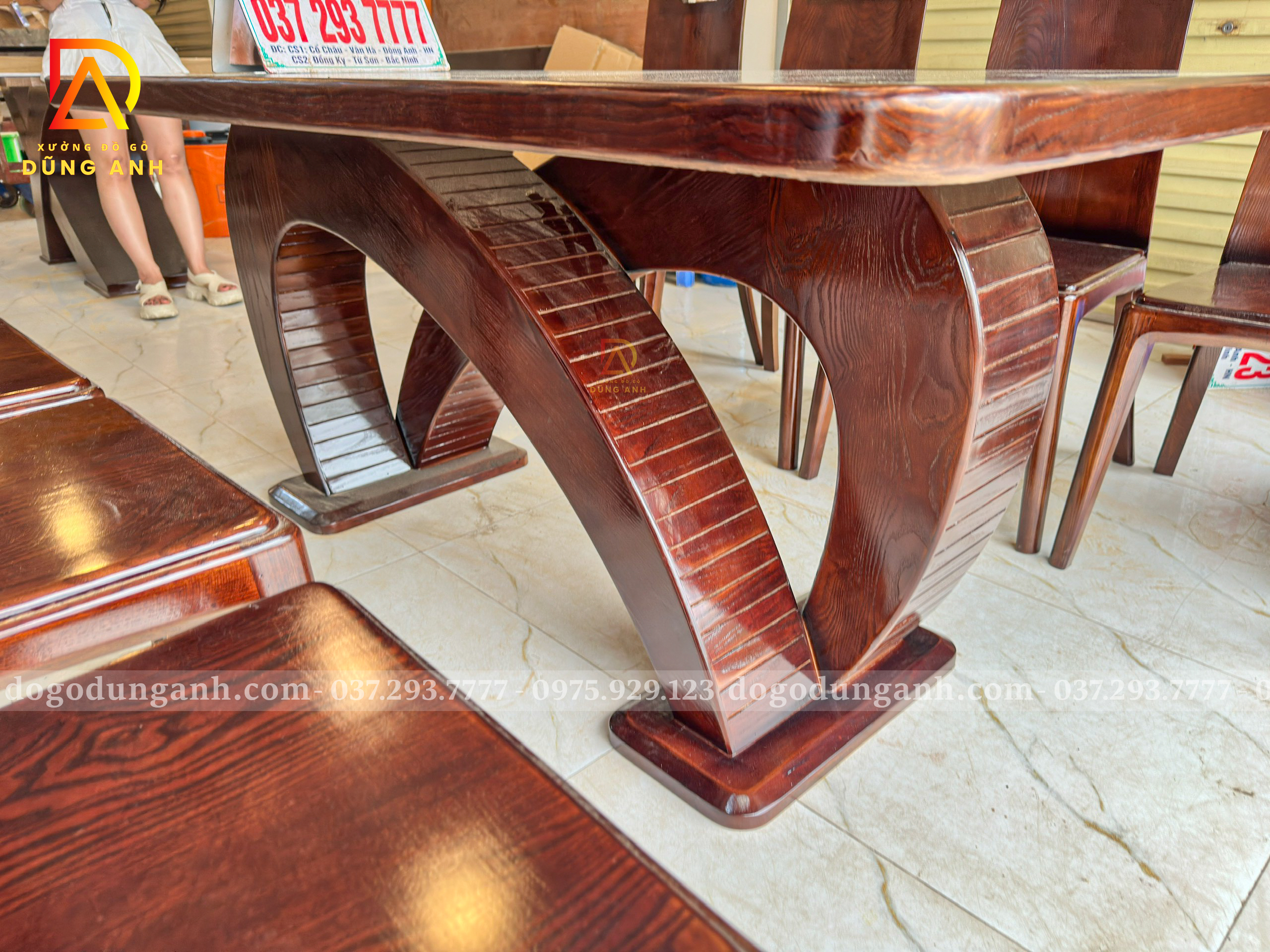 Chiếc bàn chữ nhật vuông vắn, kết hợp chân hộp bản lớn tạo nên cảm giác đầm chắc ngay từ ánh nhìn đầu tiên. Đi cùng là 8 ghế Anh Đào liền khối, thiết kế tối giản nhưng tối ưu trải nghiệm ngồi – vững, êm và cực kỳ thoải mái cho cả gia đình