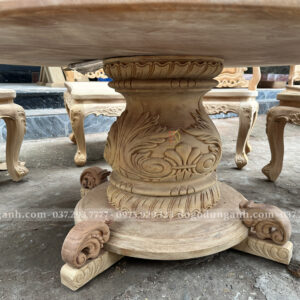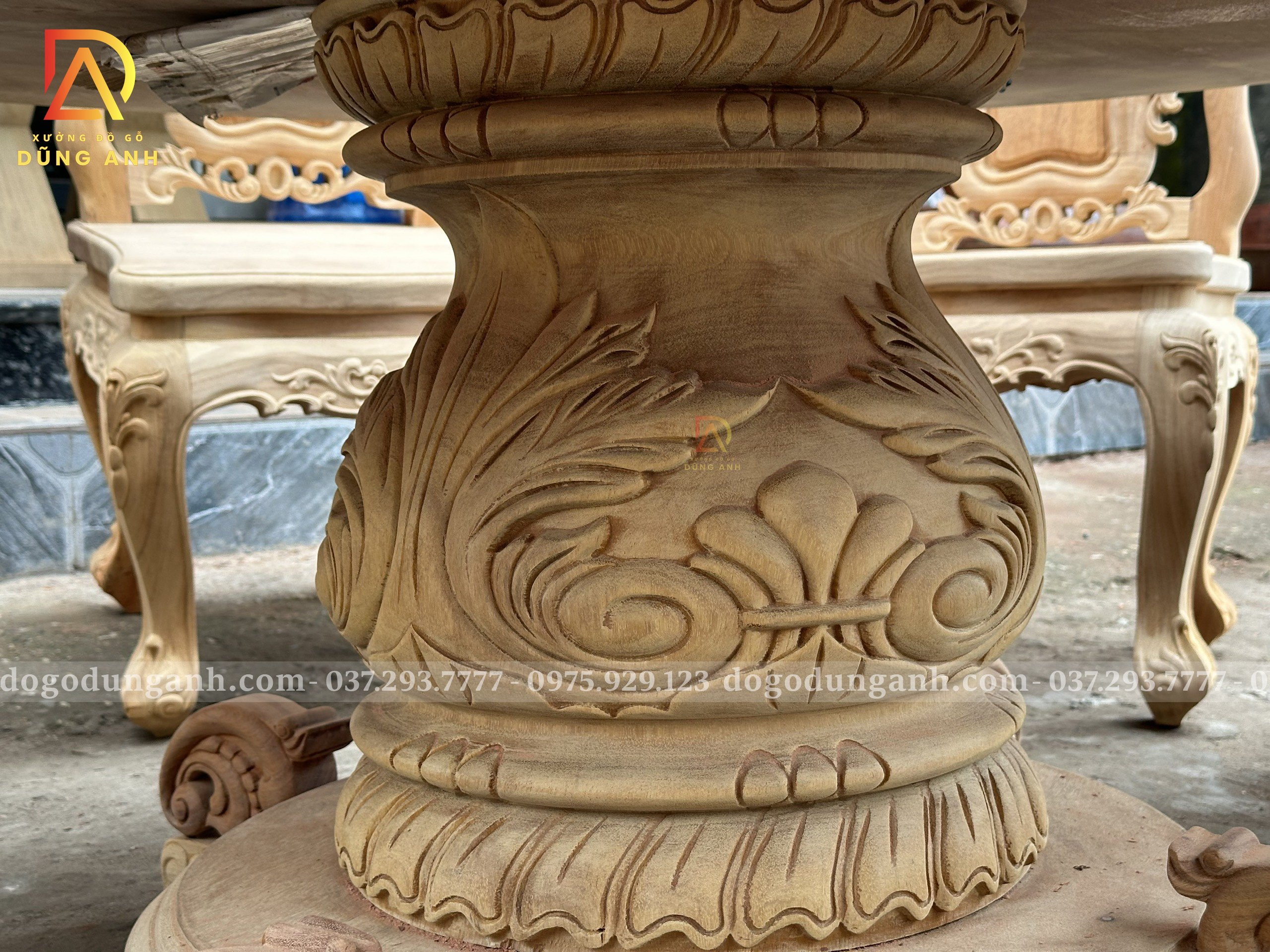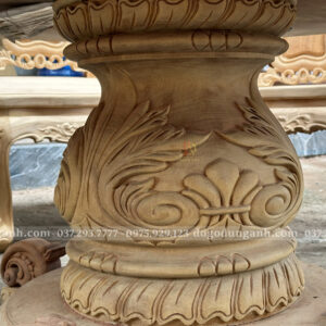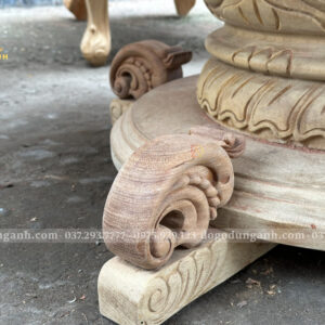 - Chân trụ có độ dày vuông là 50 cm đục chạm hoa lá tây tỉ mỉ sắc nét , phía dưới đục chạm thêm hình răng ngưa và bờm ngựa tạo điểm nhấn hơn cho chiếc bàn