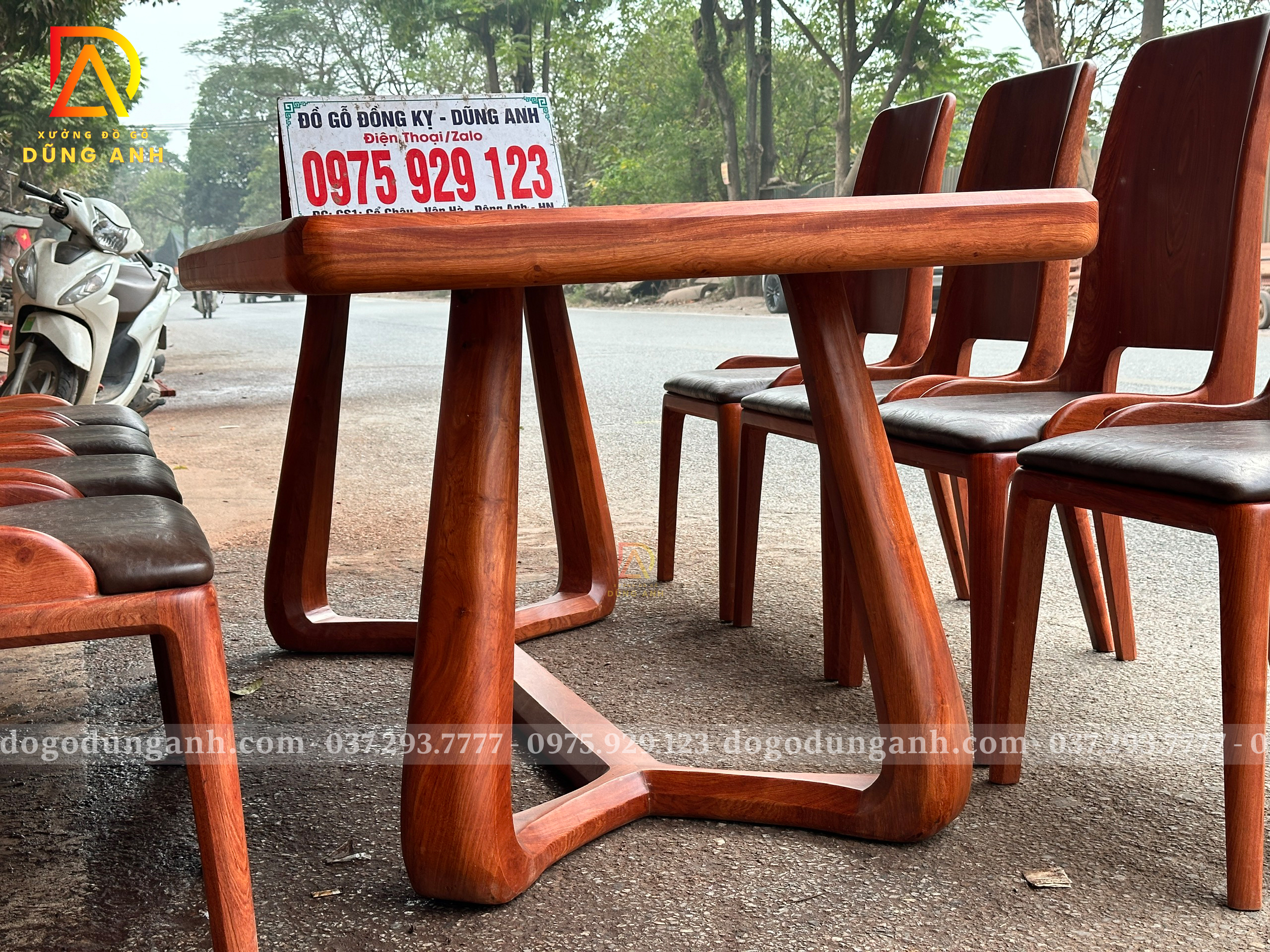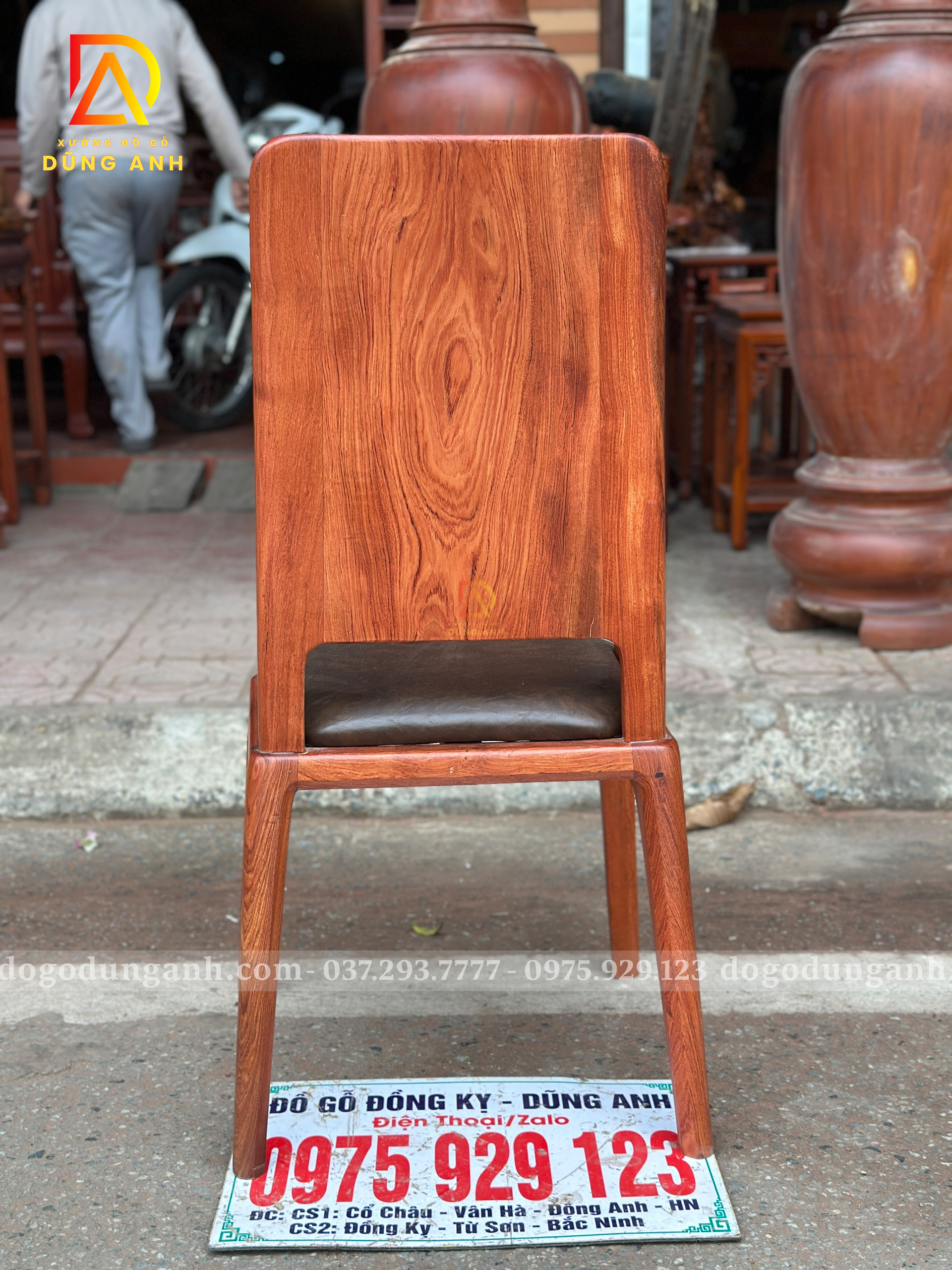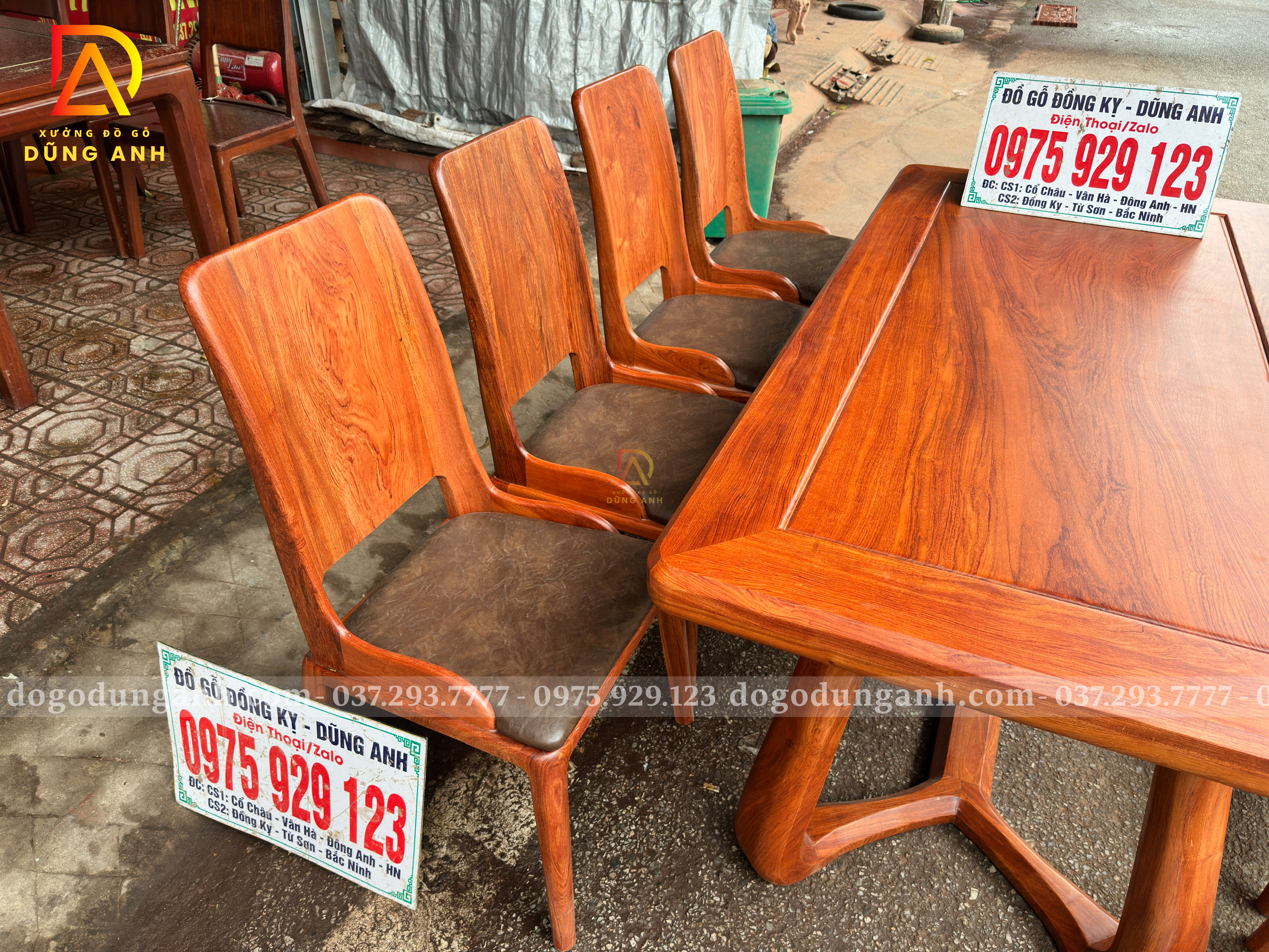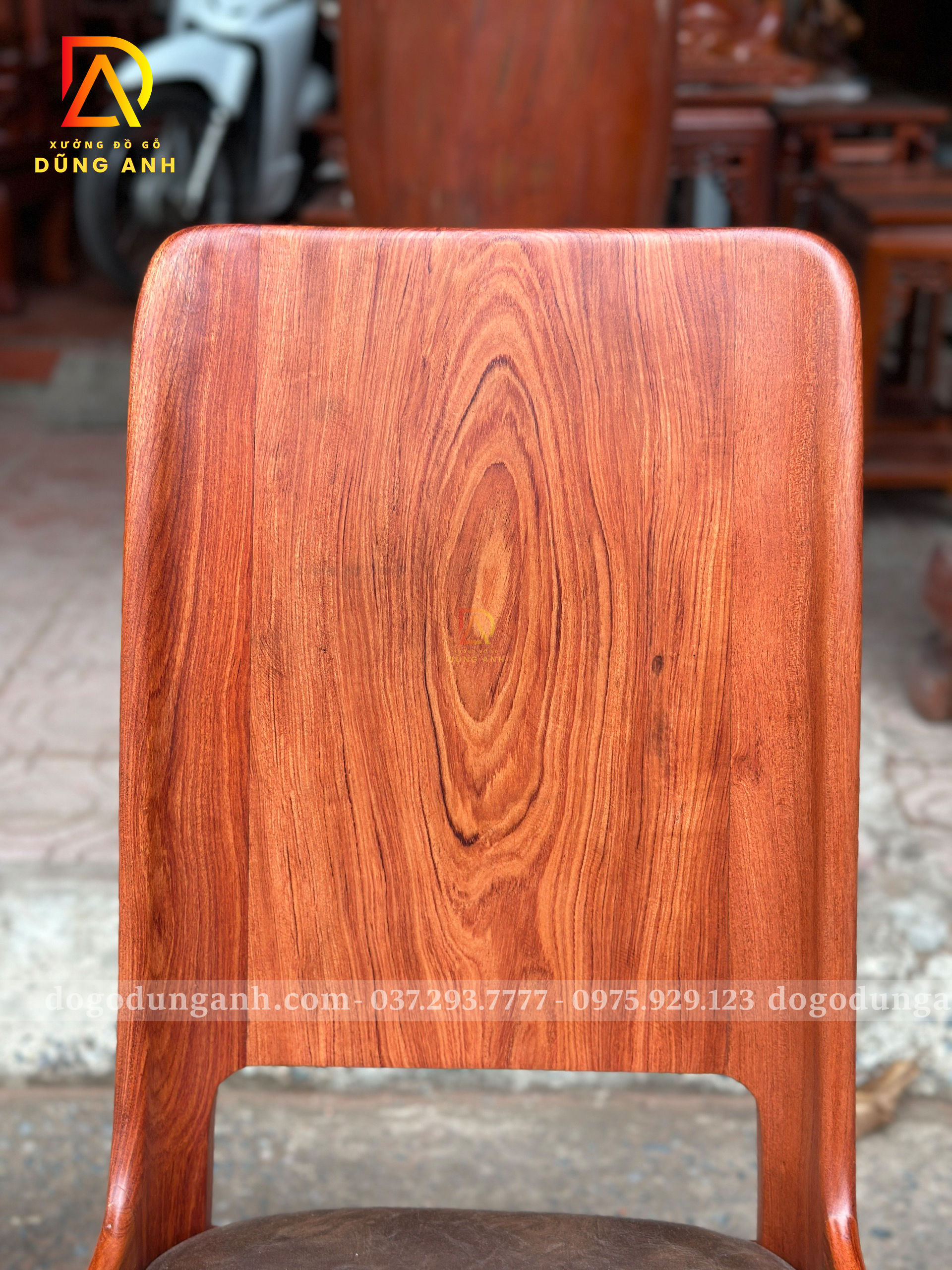 Các chi tiết trên bộ ghế ăn được những nghệ nhân Xưởng Đồ Gỗ Dũng Anh gia công tỉ mỉ, tạo nên những đường nét gọn gàng, sắc sảo và dứt khoát. Thay vì hoa văn cầu kỳ, thiết kế hiện đại tập trung vào tỷ lệ cân đối, bề mặt hoàn thiện tinh tế và từng đường bo, đường cong được xử lý chính xác, thể hiện rõ tay nghề vững vàng và tư duy thẩm mỹ đương đại.