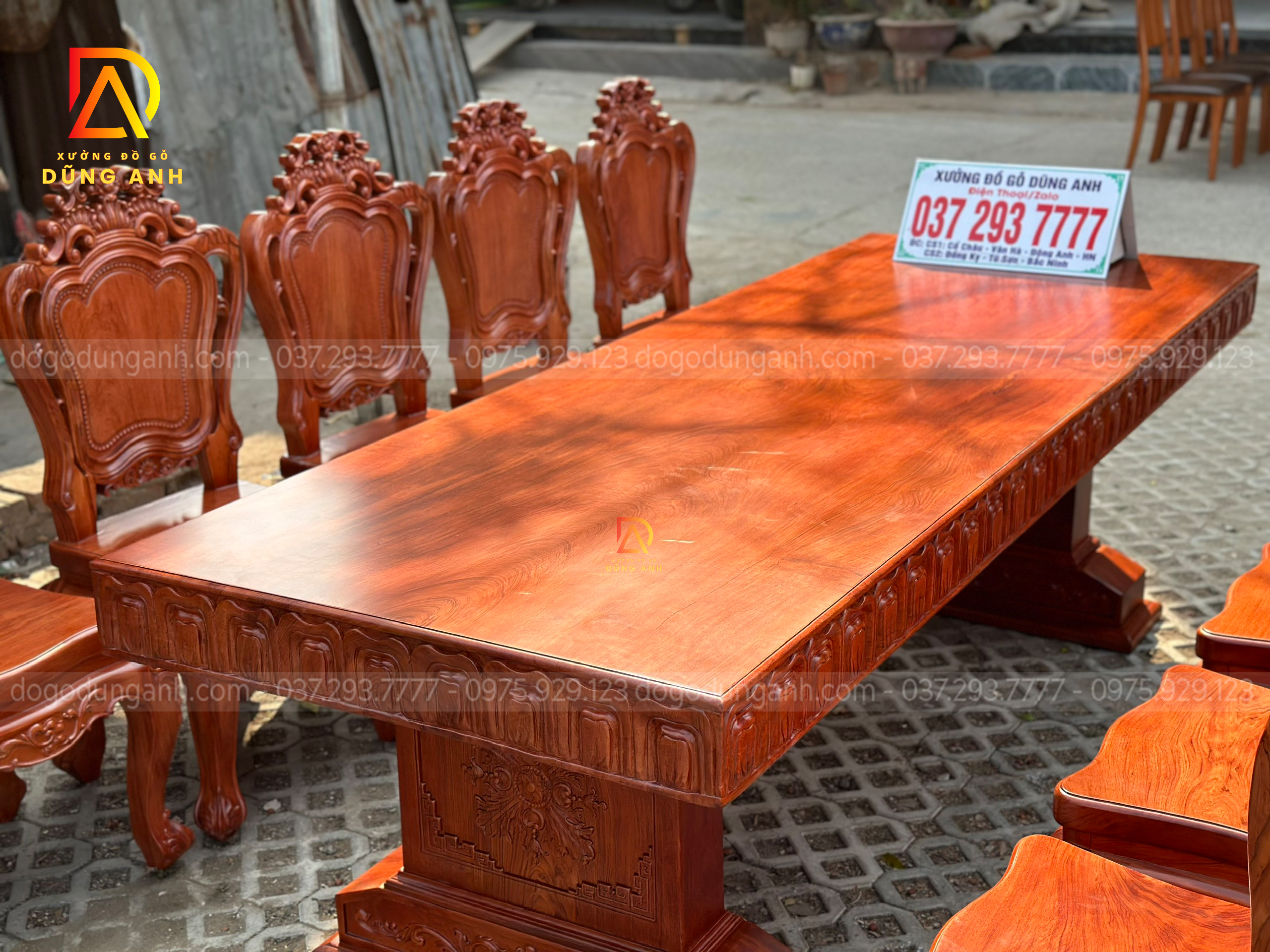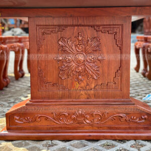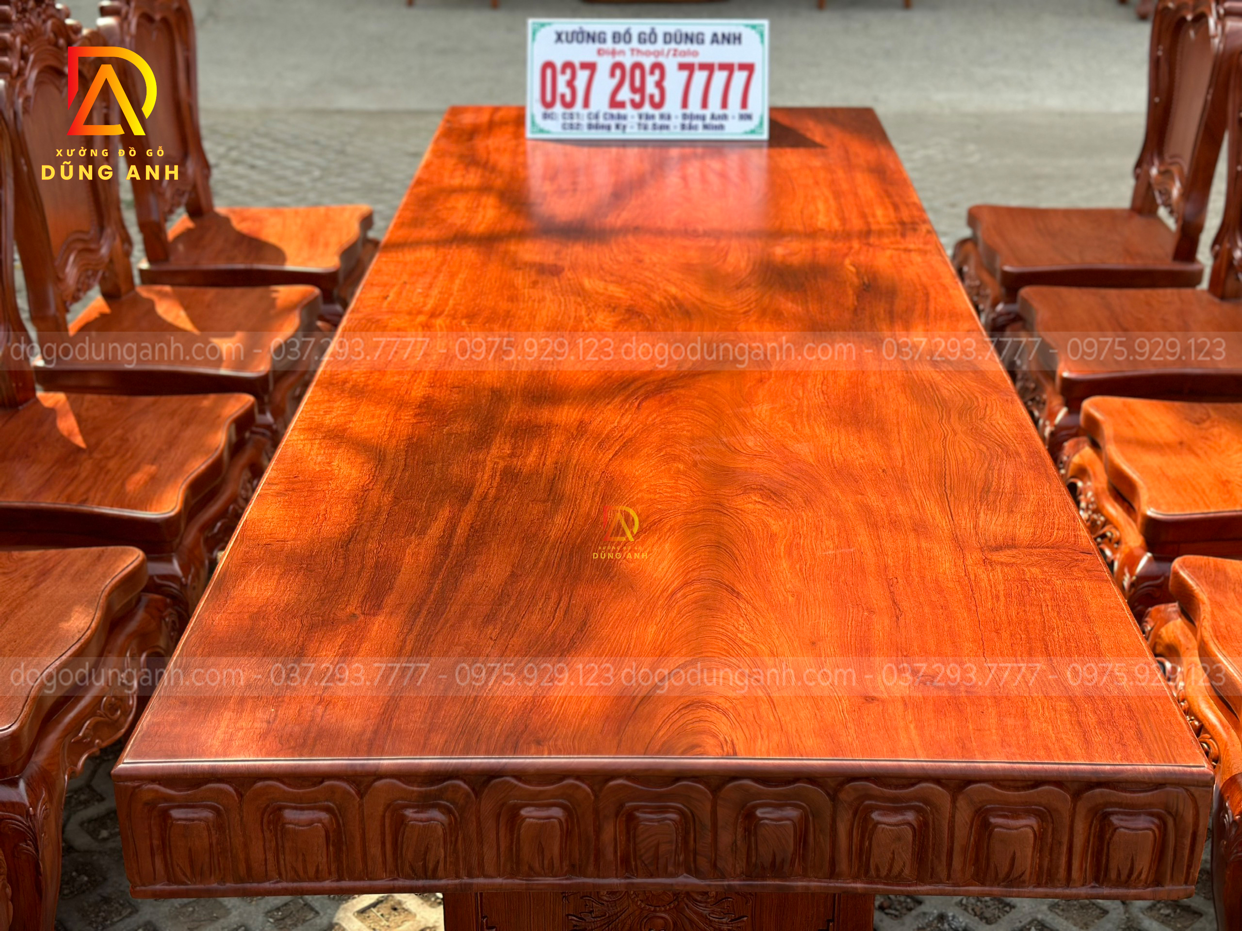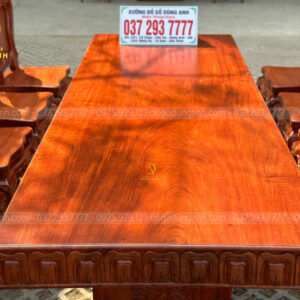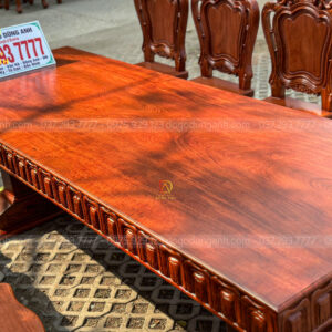 Điểm đặc biệt của bộ sản phẩm này là chiếc bàn nguyên khối gỗ Hương Đá. Với thiết kế nguyên khối, bàn không chỉ giữ nguyên vẹn vẻ đẹp tự nhiên của gỗ mà còn mang lại sự chắc chắn và bền bỉ. Mặt bàn được gia công tỉ mỉ, đảm bảo độ bóng mượt, giúp không gian thêm phần sang trọng. Bàn nguyên khối gỗ Hương Đá không chỉ là nơi để gia đình quây quần bên nhau mà còn là tác phẩm nghệ thuật, thể hiện sự tinh tế và đẳng cấp của gia chủ.