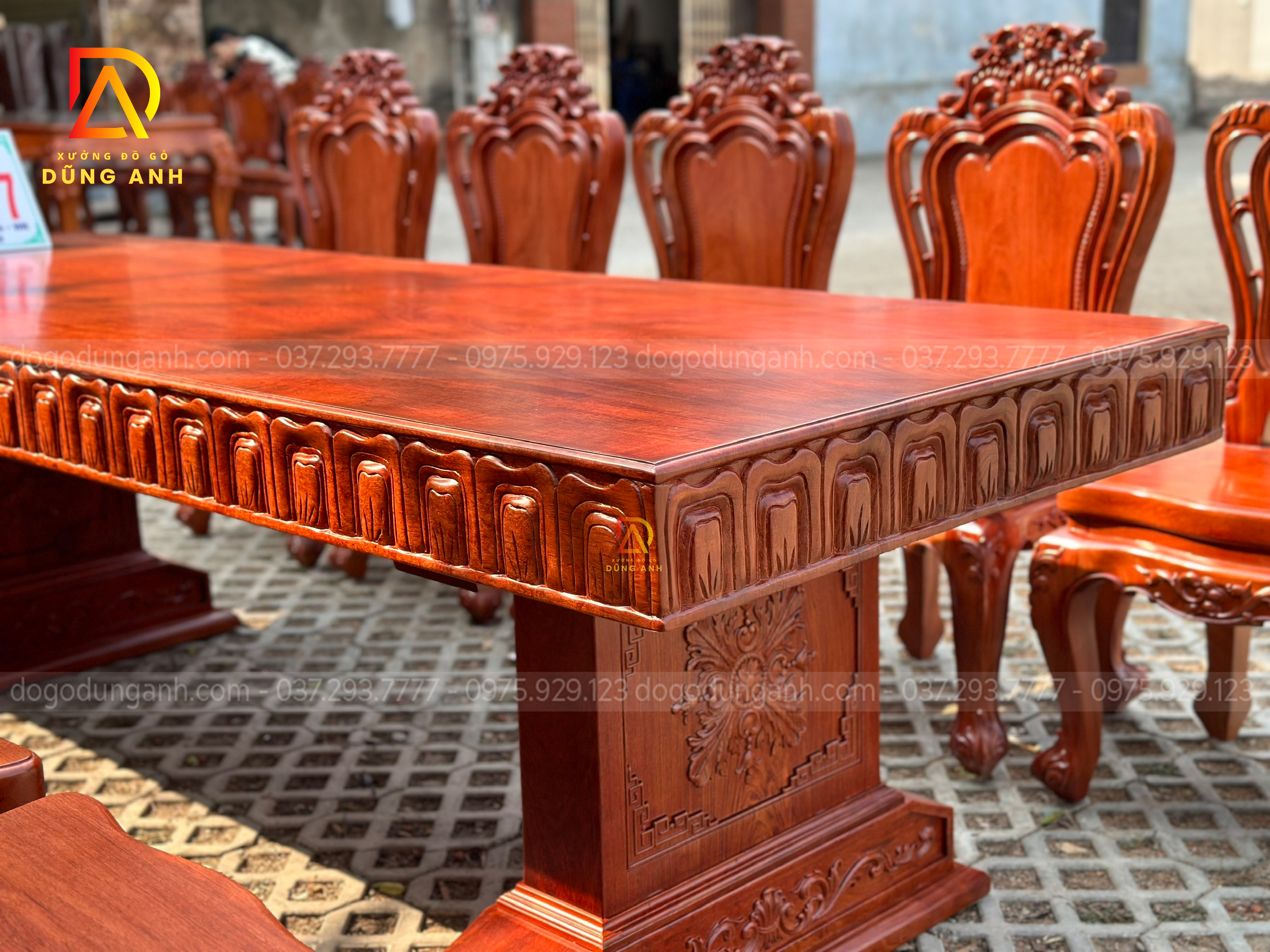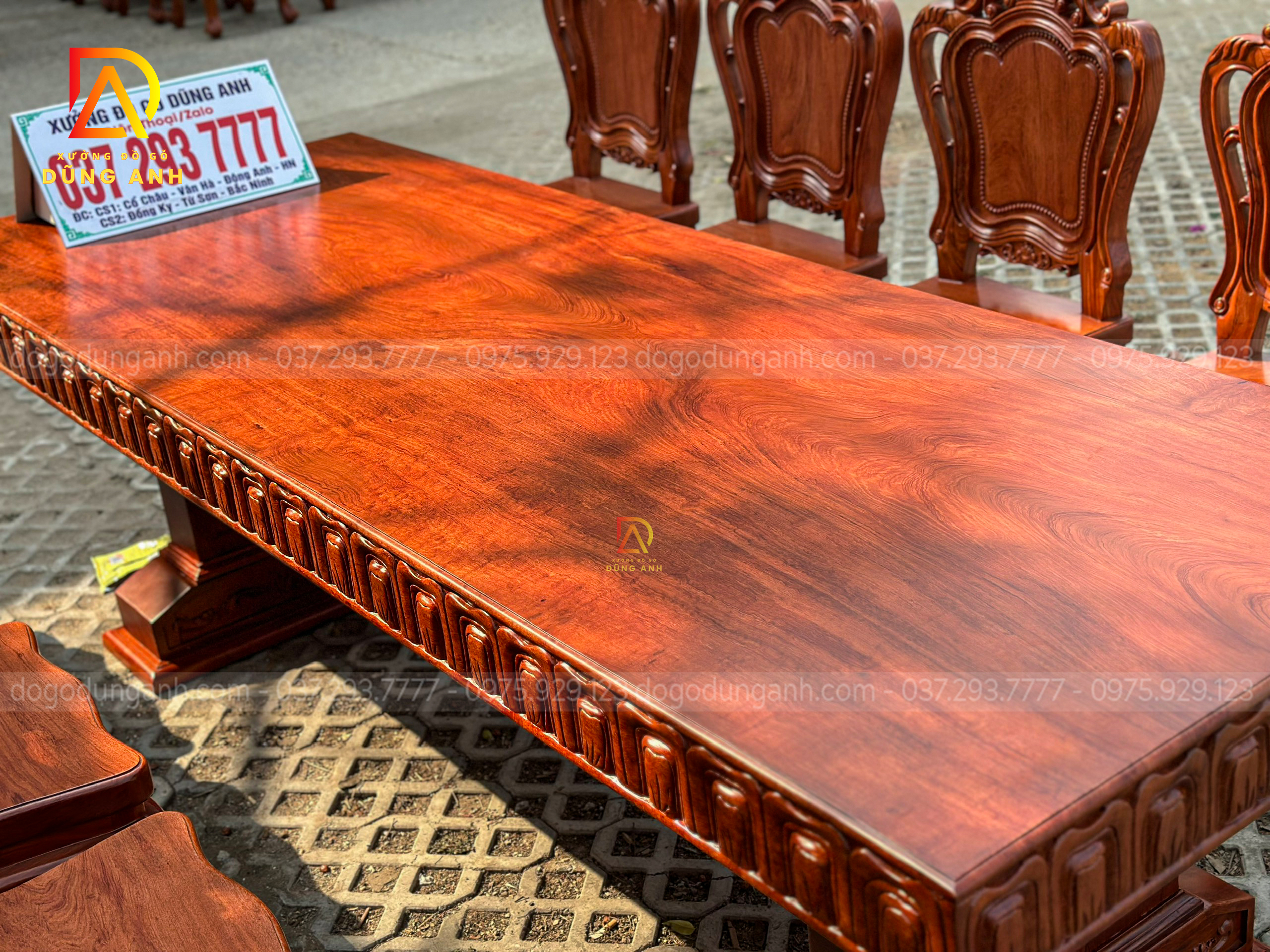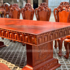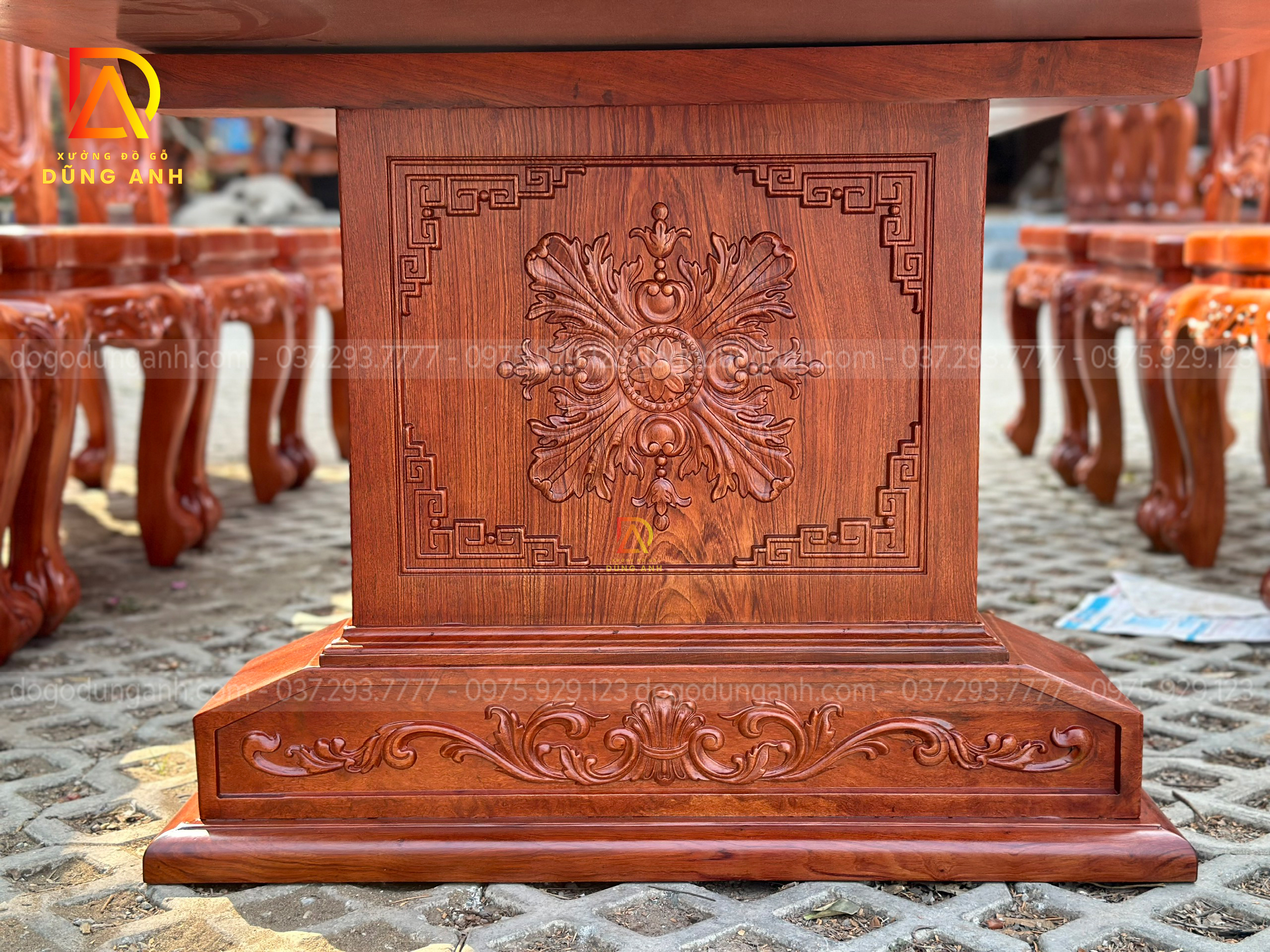 Điểm đặc biệt của bộ sản phẩm này là chiếc bàn nguyên khối gỗ Hương Đá. Với thiết kế nguyên khối, bàn không chỉ giữ nguyên vẹn vẻ đẹp tự nhiên của gỗ mà còn mang lại sự chắc chắn và bền bỉ. Mặt bàn được gia công tỉ mỉ, đảm bảo độ bóng mượt, giúp không gian thêm phần sang trọng. Bàn nguyên khối gỗ Hương Đá không chỉ là nơi để gia đình quây quần bên nhau mà còn là tác phẩm nghệ thuật, thể hiện sự tinh tế và đẳng cấp của gia chủ.