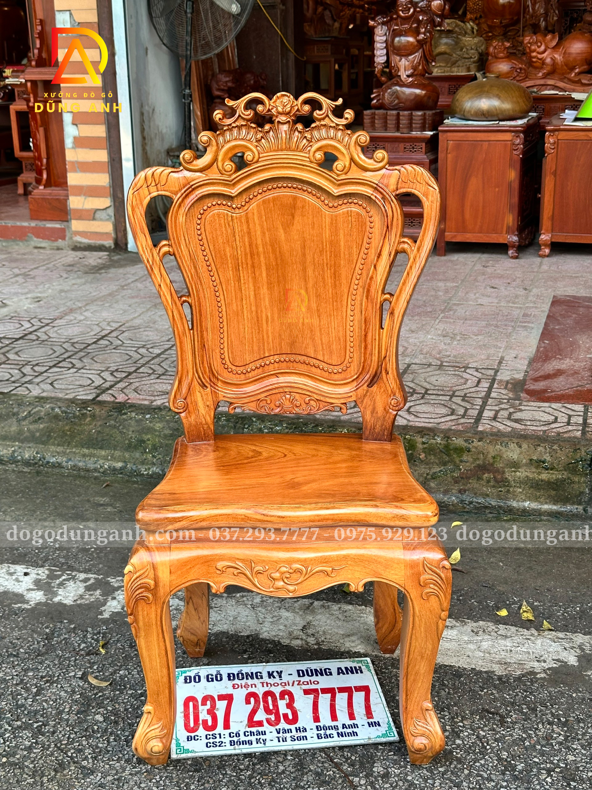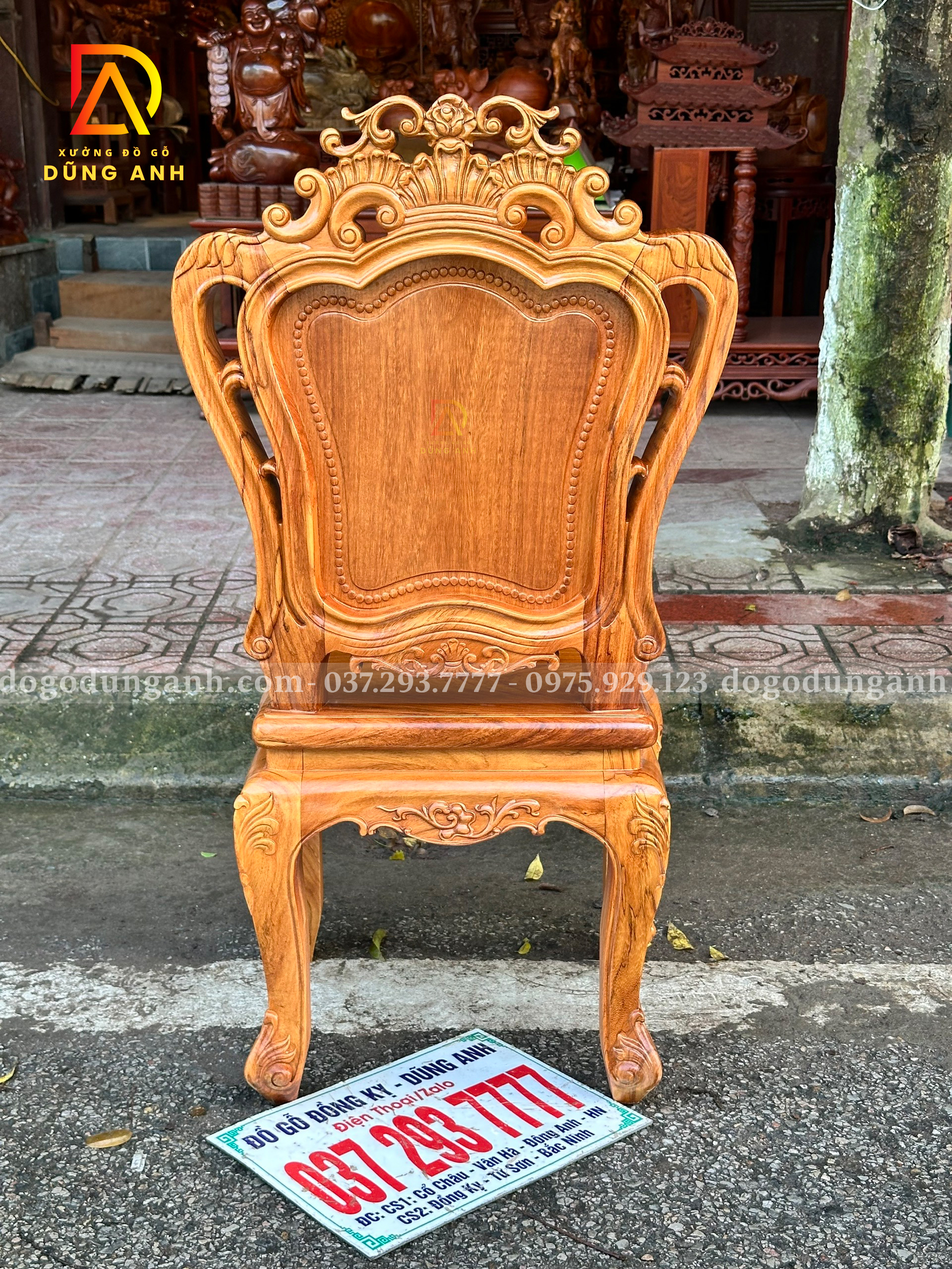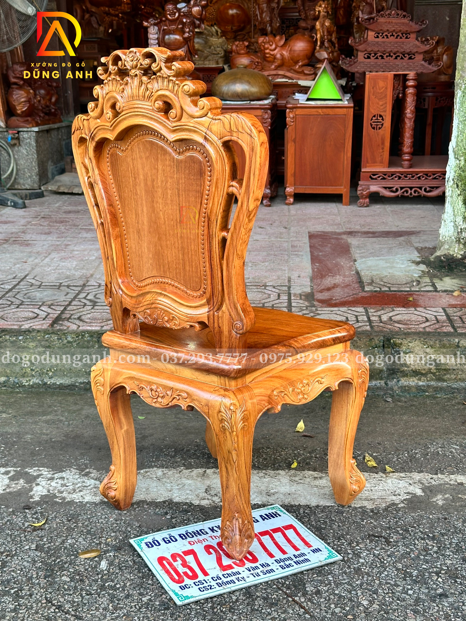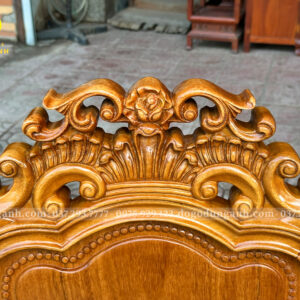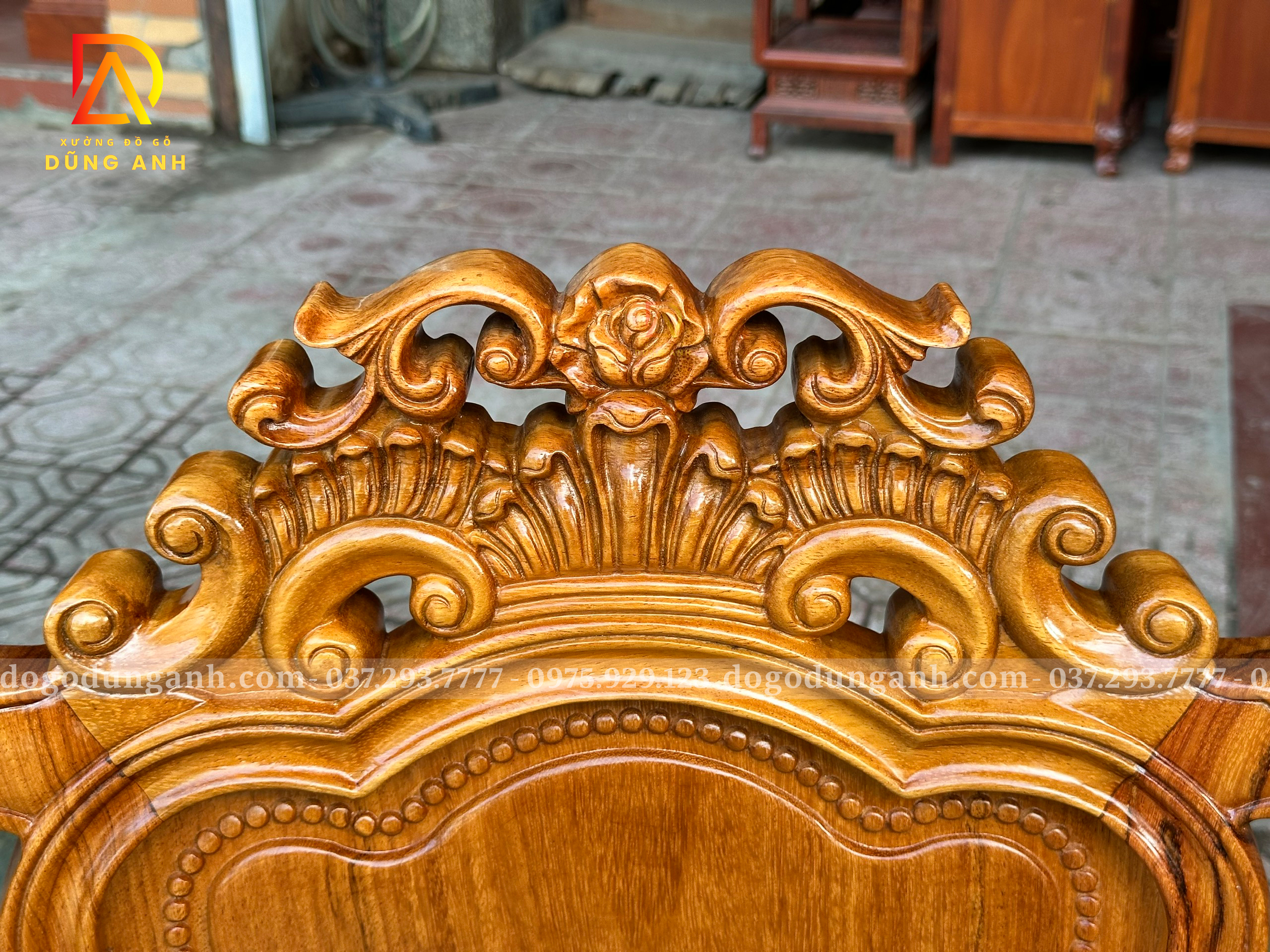 Ghế Louis Hoàng Gia nổi bật với phần lưng uốn lượn, chương ghế chạm trổ tinh tế và vai cong mềm mại. Mỗi chi tiết đều được hoàn thiện tỉ mỉ, thể hiện sự khéo léo của bàn tay người thợ
