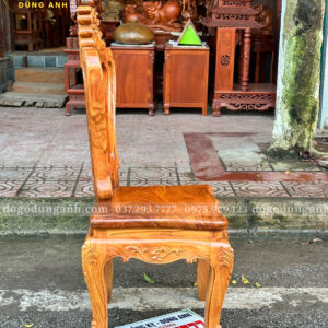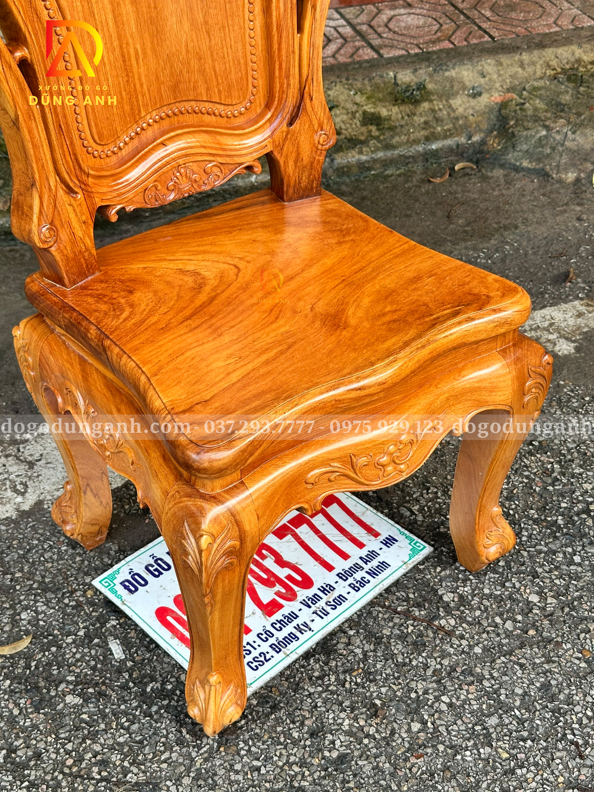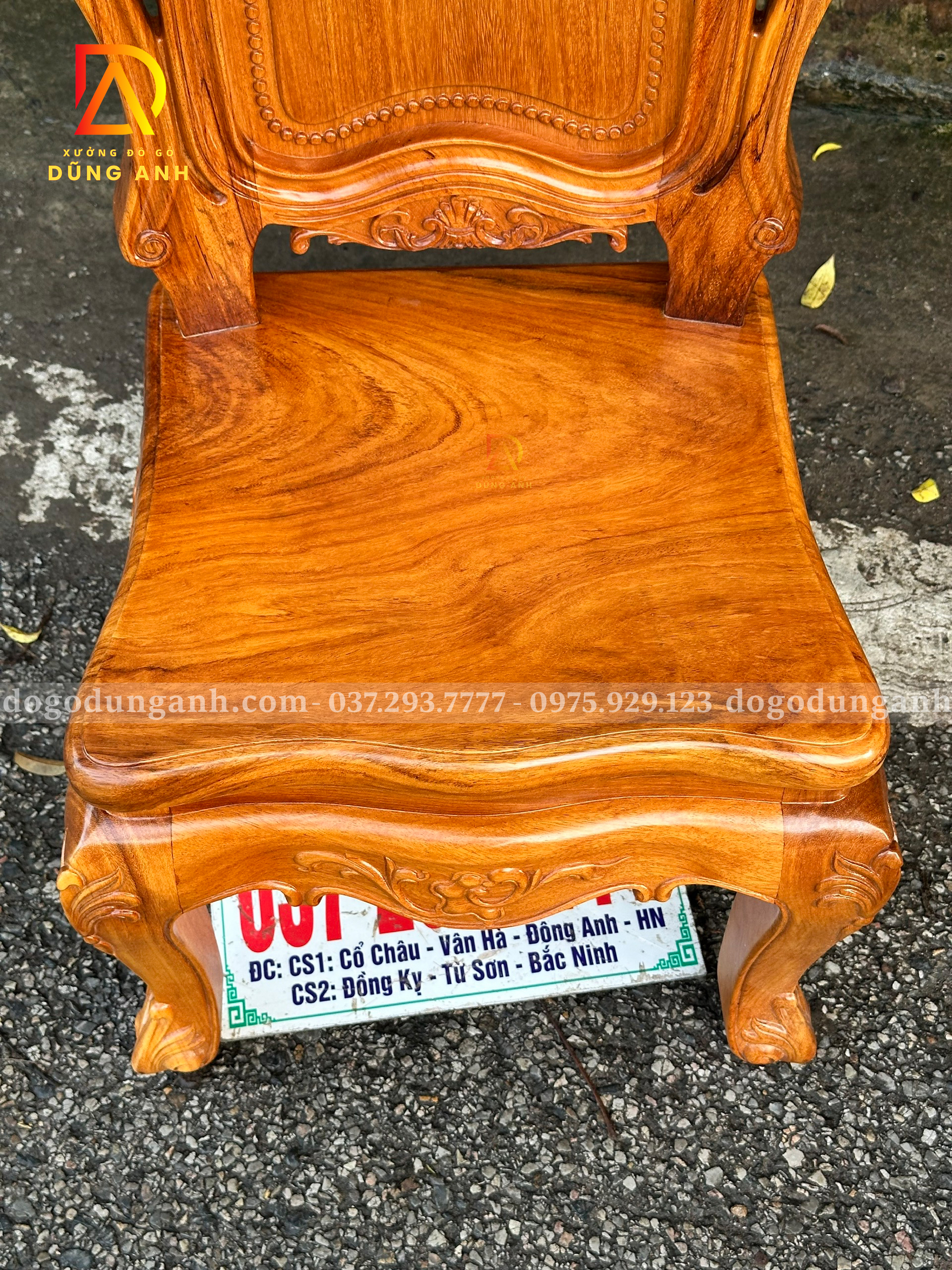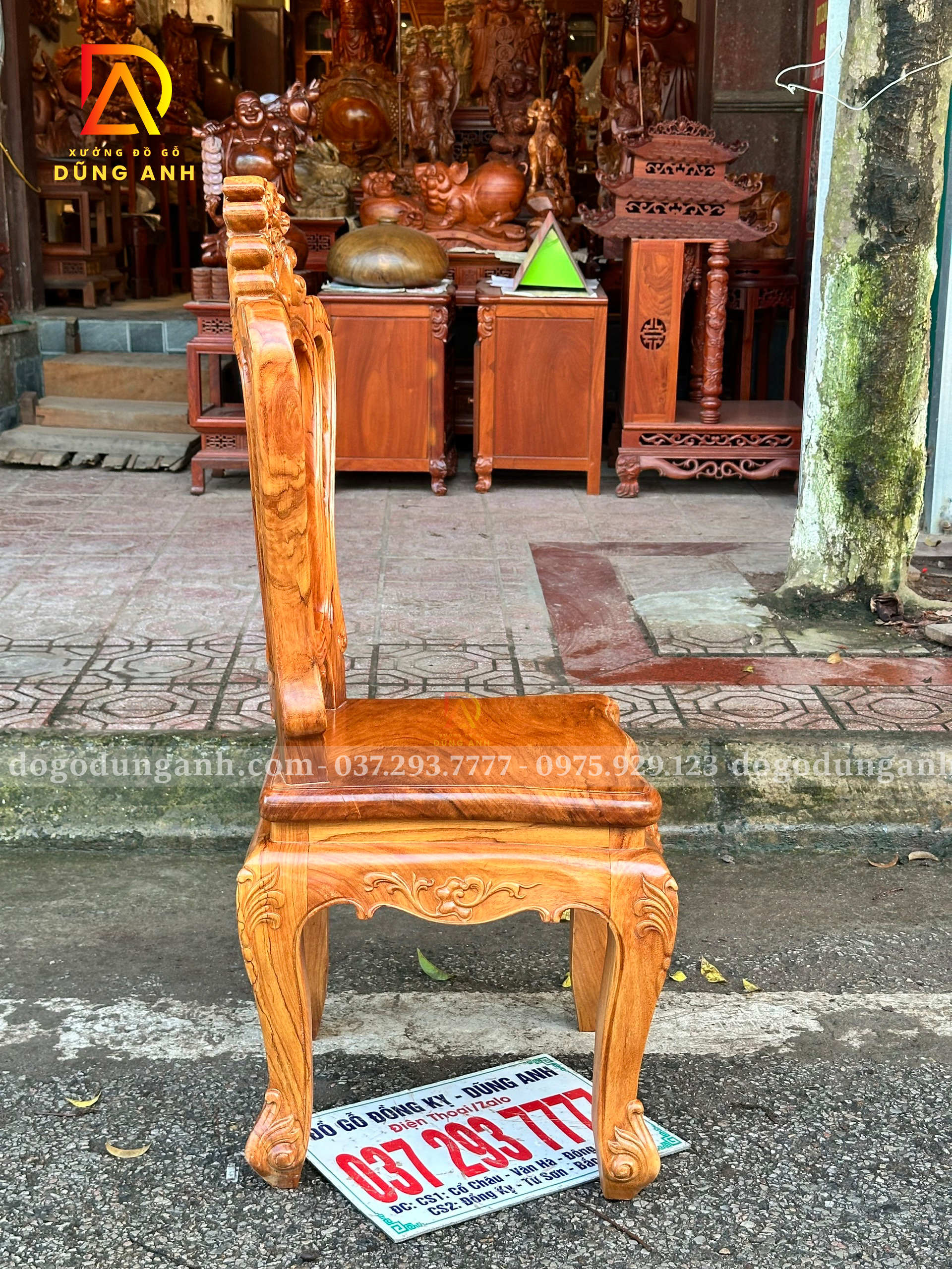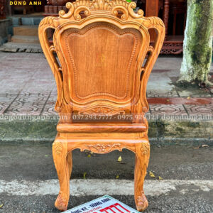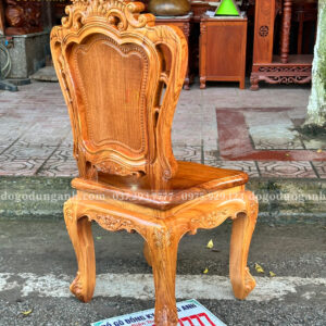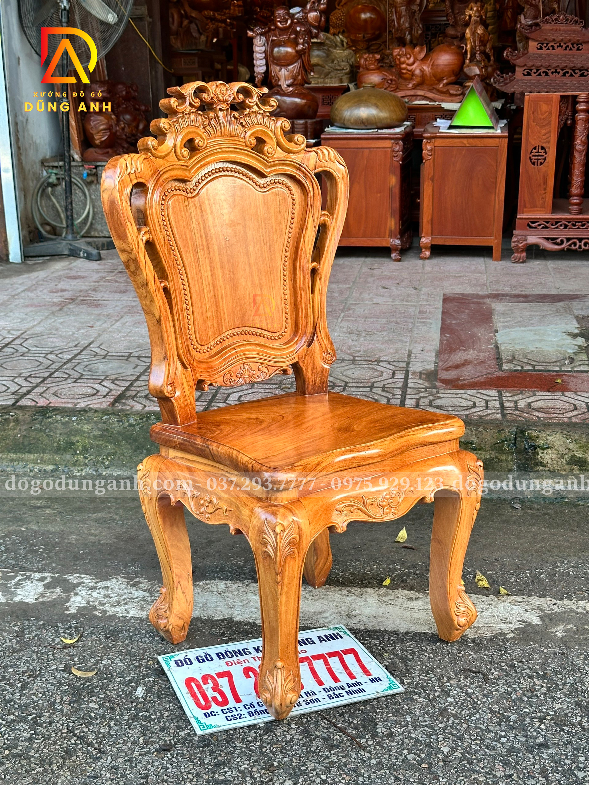 Ghế Louis Hoàng Gia nổi bật với phần lưng uốn lượn, chương ghế chạm trổ tinh tế và vai cong mềm mại. Mỗi chi tiết đều được hoàn thiện tỉ mỉ, thể hiện sự khéo léo của bàn tay người thợ