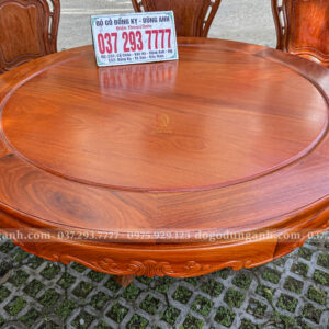 Bàn tròn gõ đỏ: mặt bàn rộng, vân gỗ rõ ràng, độ bền cao. Bàn được chạm khắc họa tiết cổ điển viền quanh, vừa tạo điểm nhấn thẩm mỹ vừa tôn lên giá trị sử dụng.