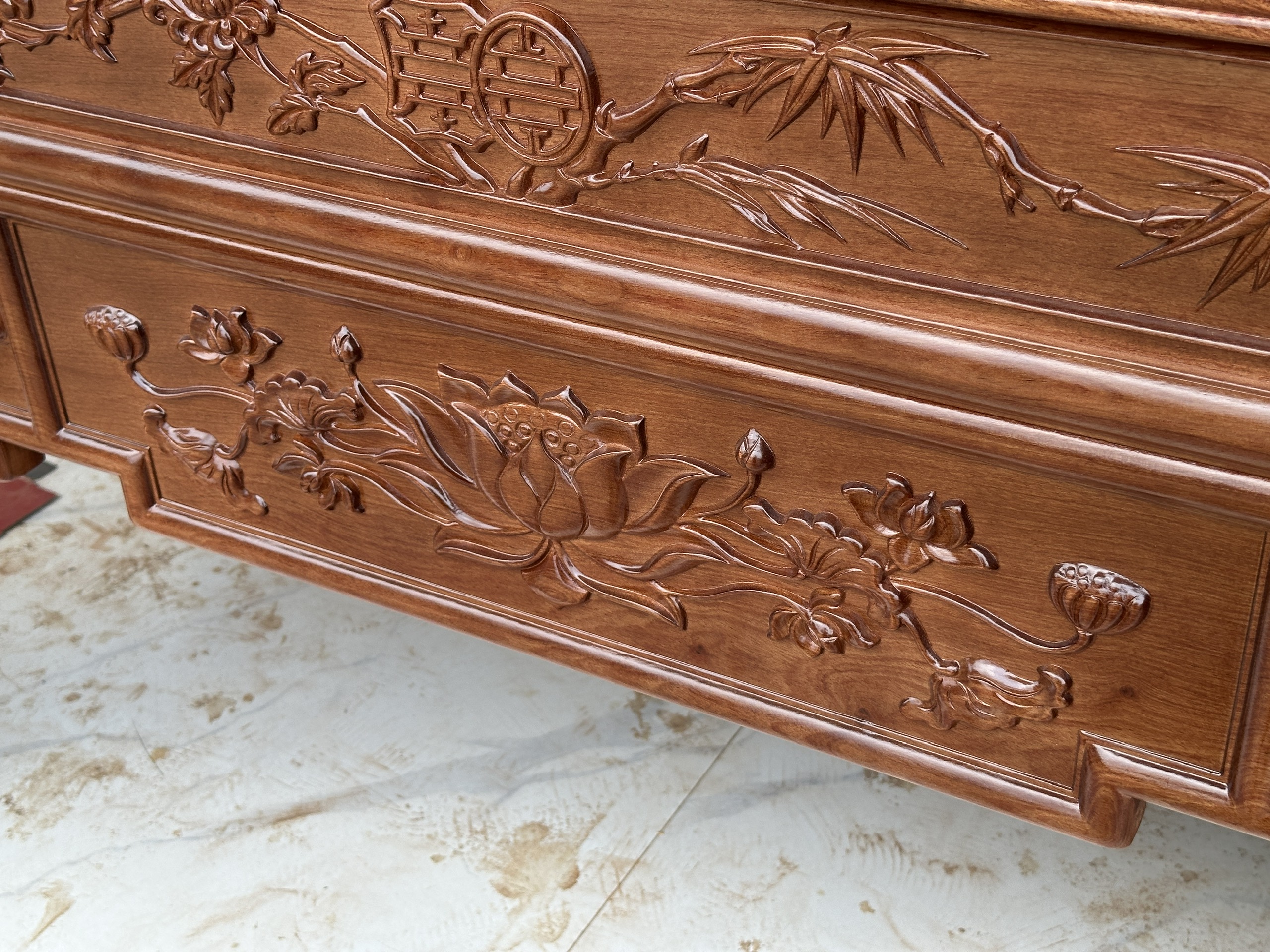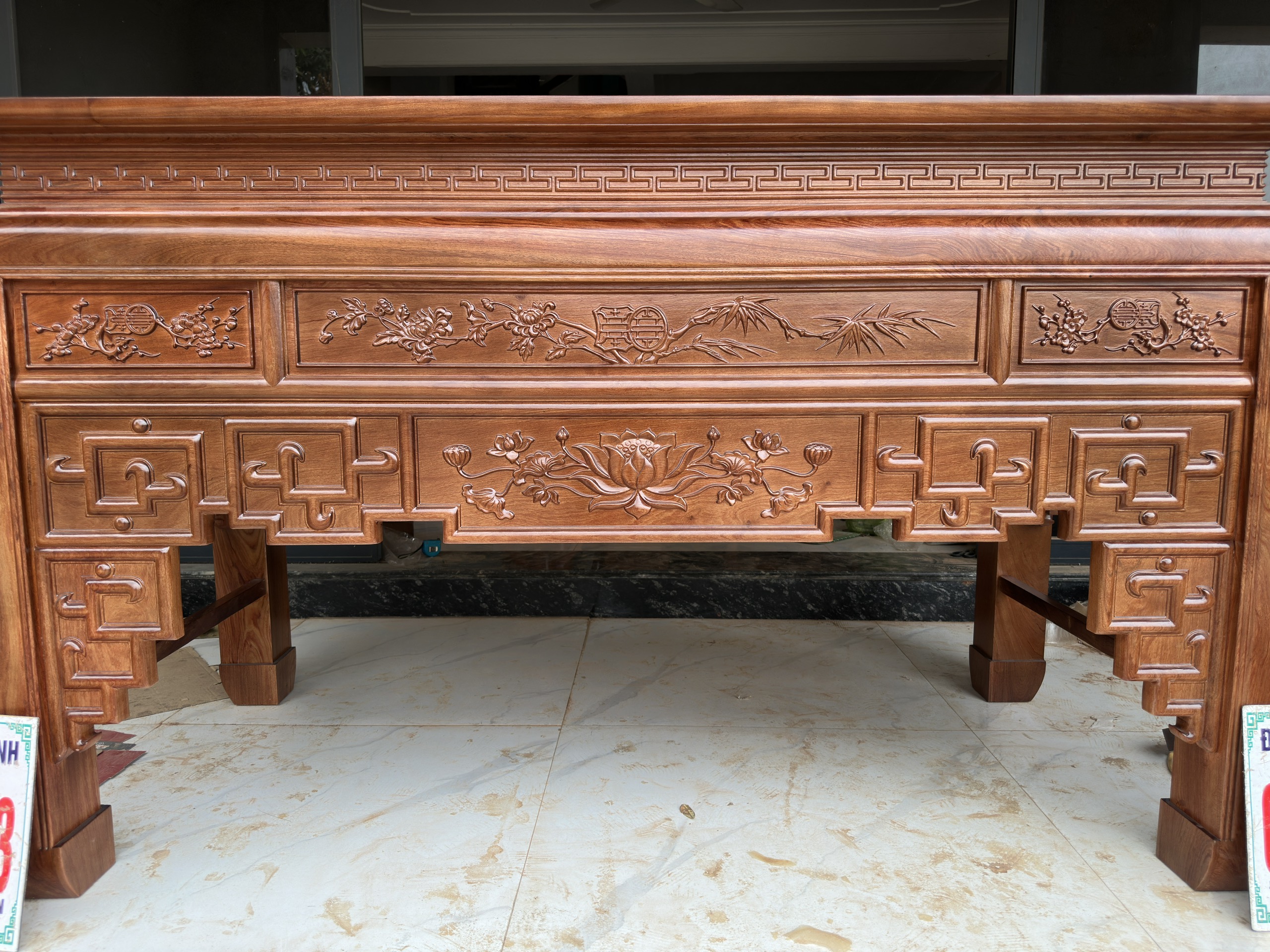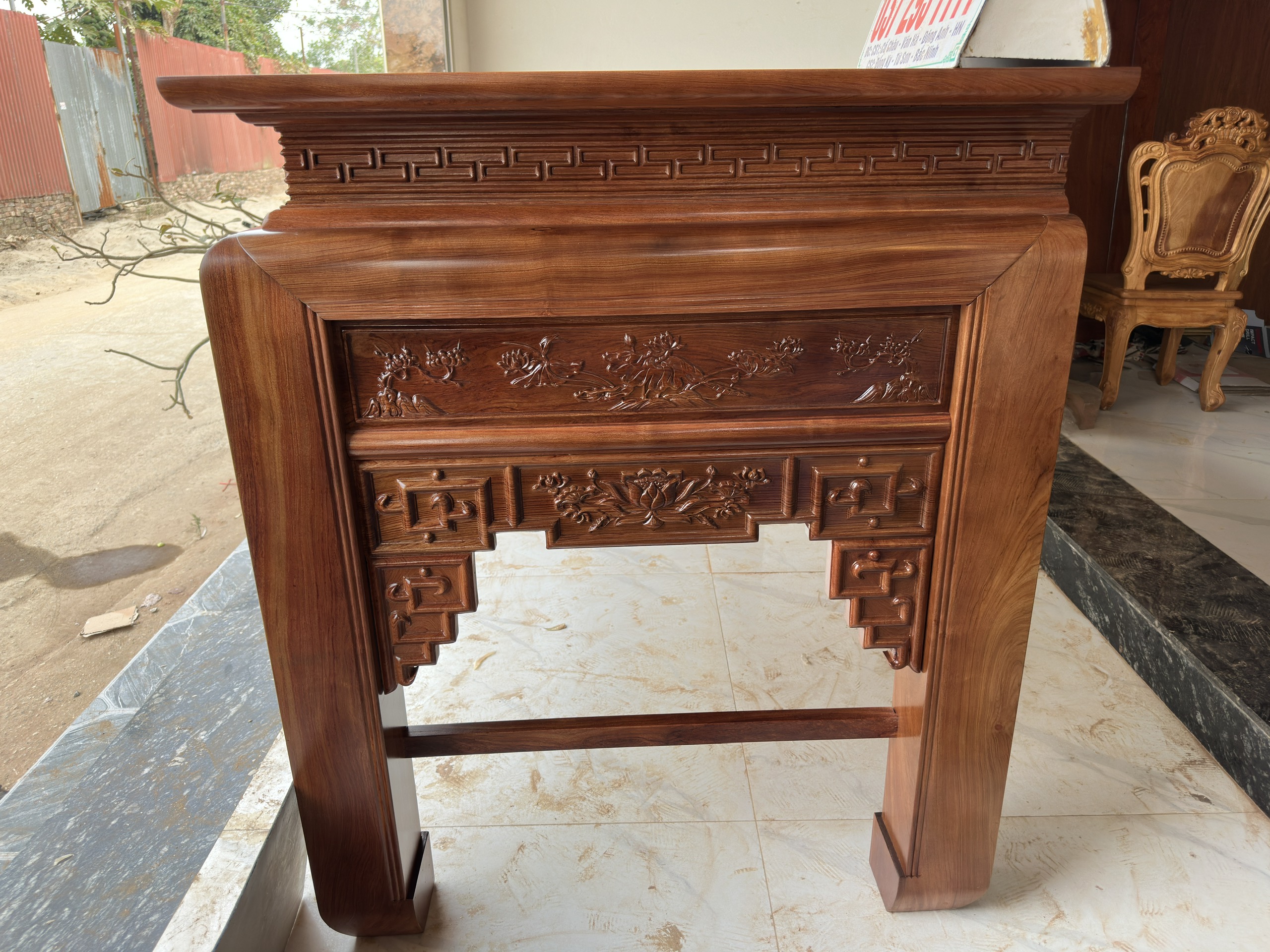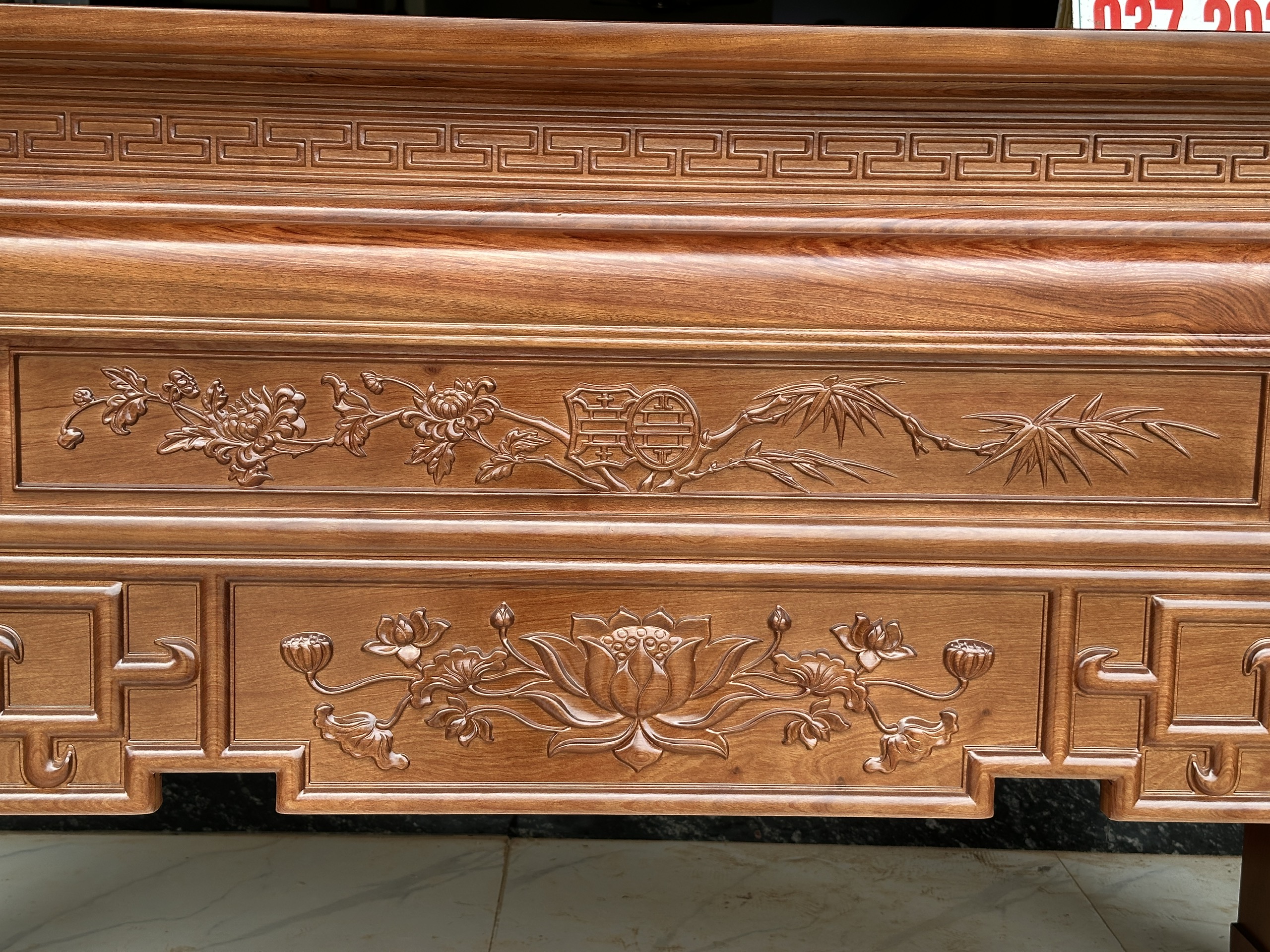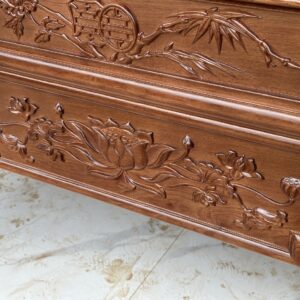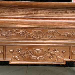 Mặt tiền được trạm trổ kênh bong sắc nét, bố cục hài hòa với đường nét đơn giản mà tinh tế. Điểm nhấn nổi bật là bông hoa sen chạm khắc chính diện, tạo cảm giác trang nhã, thanh cao và mang đậm giá trị thẩm mỹ truyền thống.