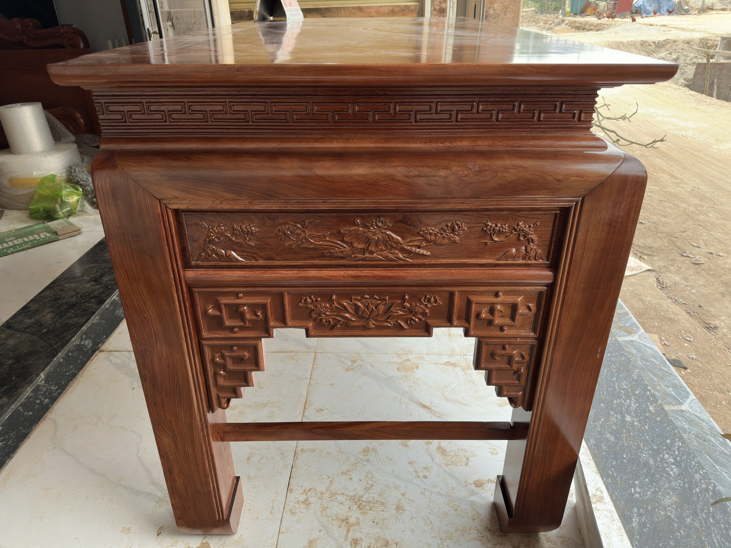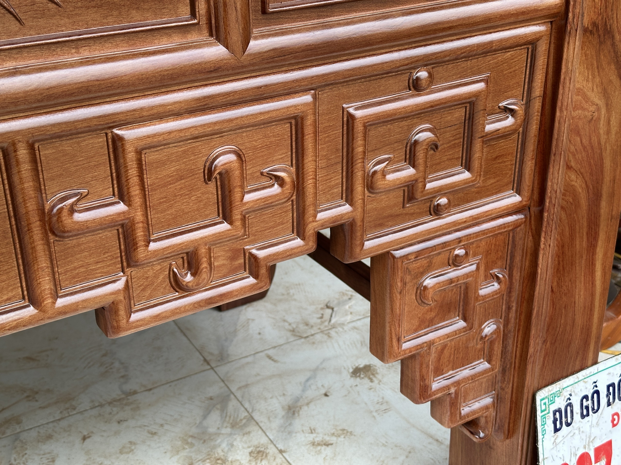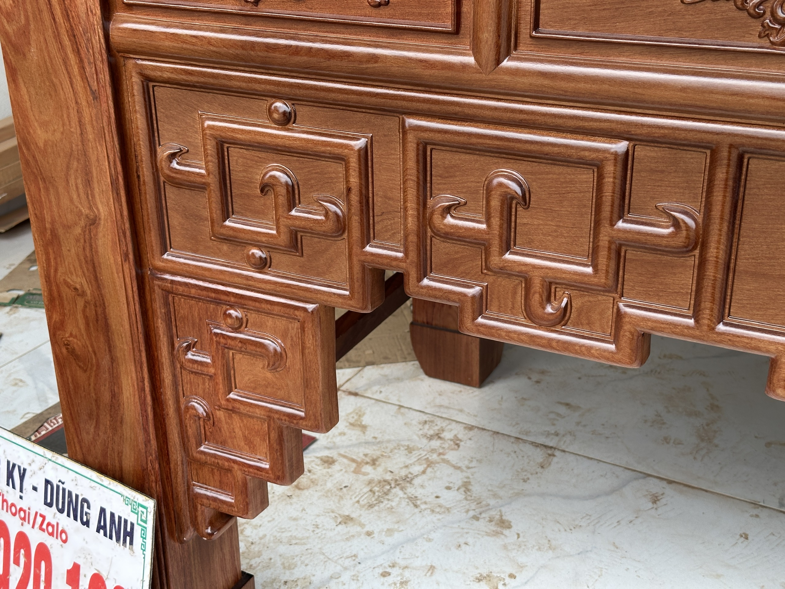 Khung bàn thờ chắc chắn: Gia công tinh tế, kết cấu dày dặn giúp bàn thờ luôn vững chắc, bền đẹp khi sử dụng lâu dài.