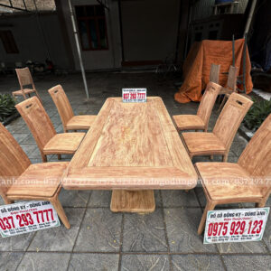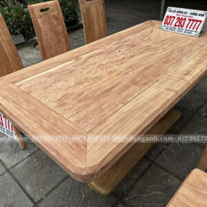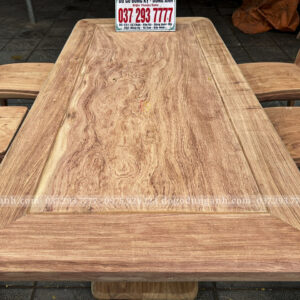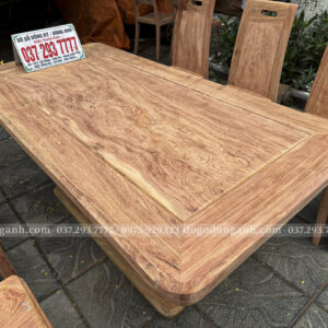 Điểm nổi bật không thể không nhắc đến chính là chất liệu gỗ Hương Đá cao cấp. Loại gỗ này không chỉ có màu sắc tự nhiên đẹp mắt, với những đường vân gỗ rõ nét, mà còn có mùi hương nhẹ nhàng dễ chịu. Gỗ Hương Đá nổi bật với đặc tính bền vững, ít bị cong vênh và nứt nẻ, giúp các sản phẩm nội thất có tuổi thọ lâu dài. Việc sử dụng gỗ Hương Đá nguyên khối cho bàn ăn không chỉ mang lại vẻ đẹp sang trọng mà còn thể hiện sự tinh tế, đẳng cấp của người sở hữu.