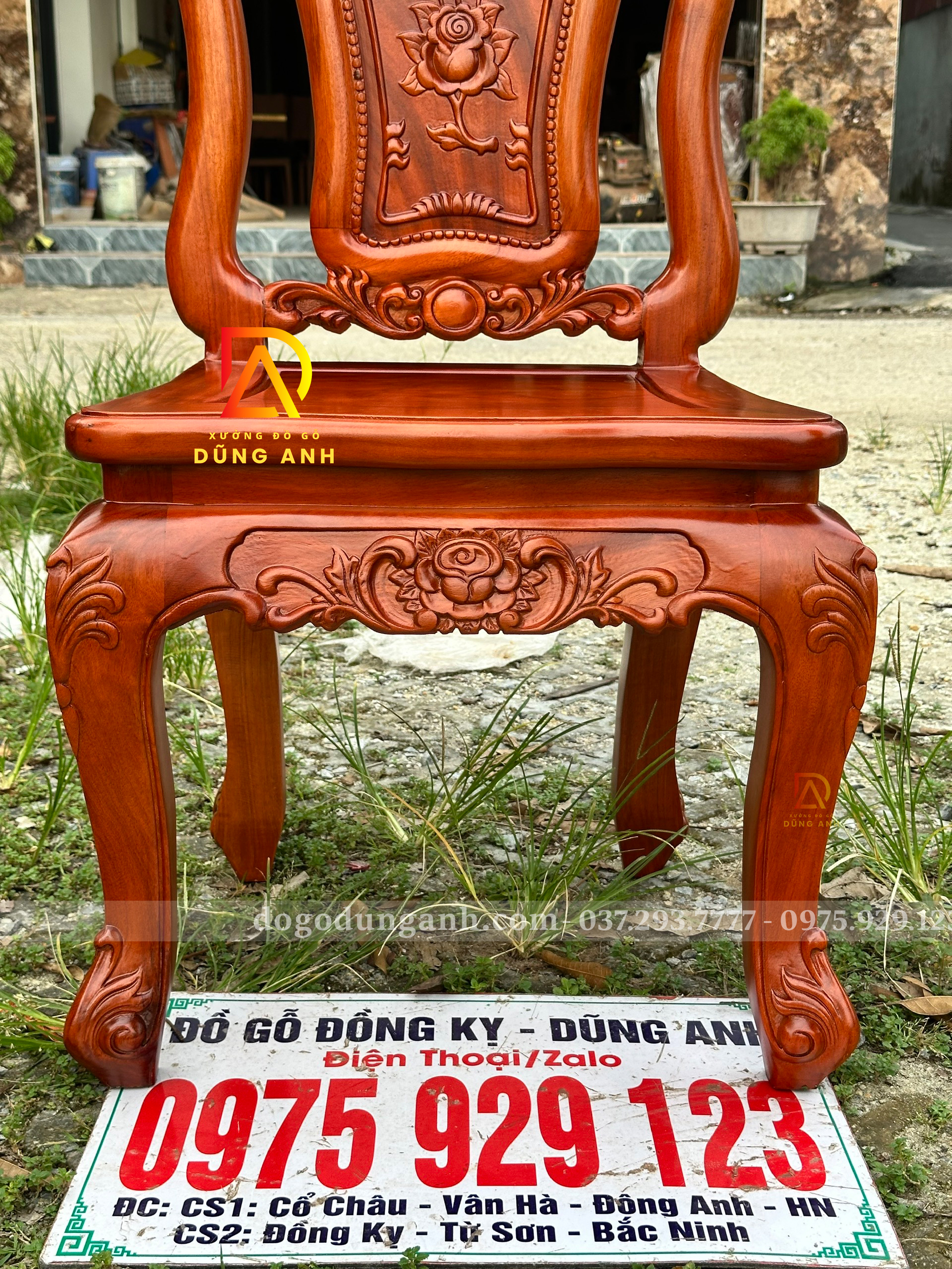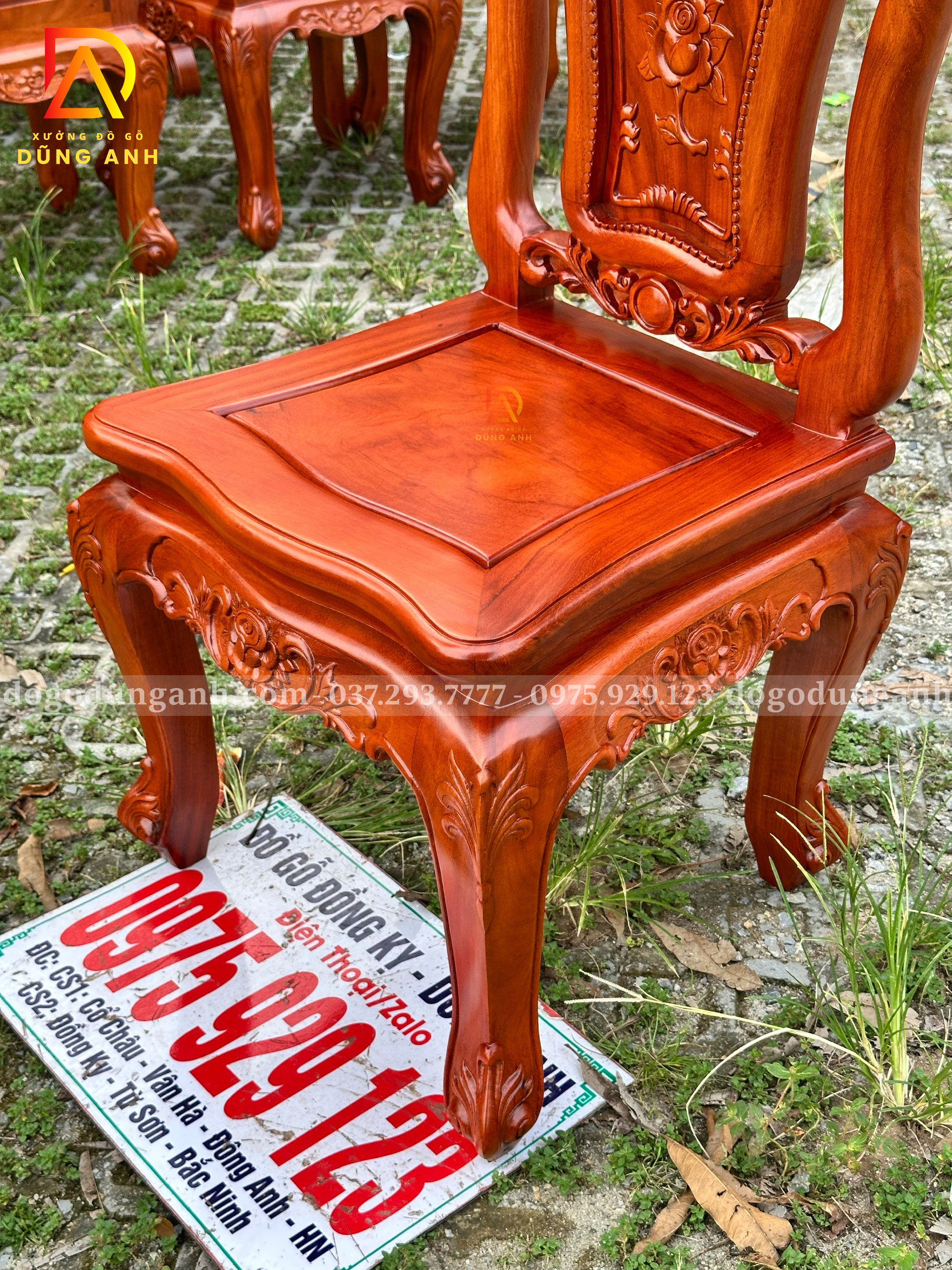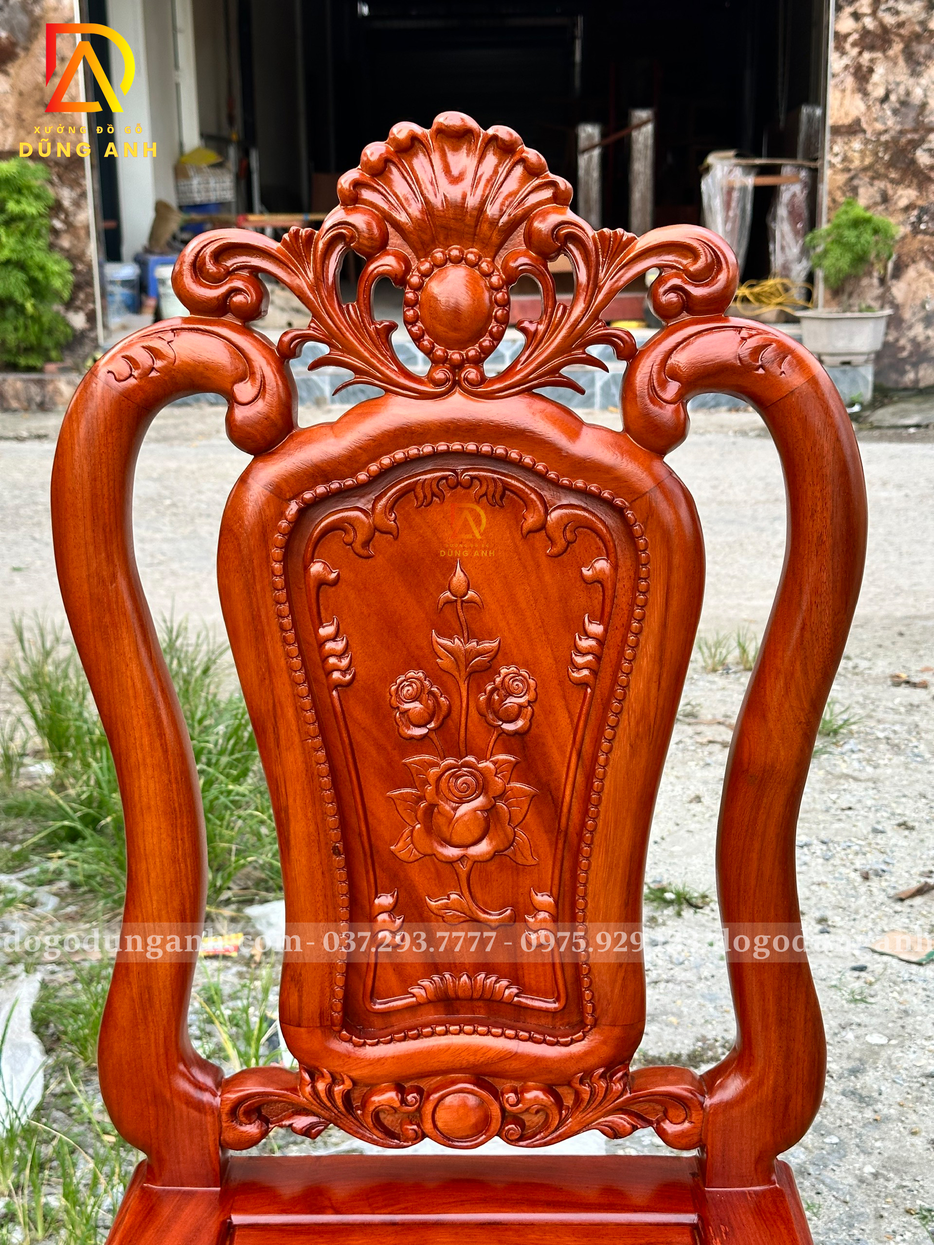 Bộ bàn ghế Louis 6 ghế hoa hồng kết hợp bàn Chữ Nhật gỗ Gõ Đỏ tự nhiên 100% chinh phục mọi ánh nhìn nhờ kiểu dáng hoàng gia sang trọng, hoa văn chạm tinh xảo và chất liệu gỗ quý cực bền. Thiết kế tối ưu cho nhà phố, căn hộ, biệt thự – vừa tiết kiệm diện tích, vừa nâng tầm giá trị không gian sống