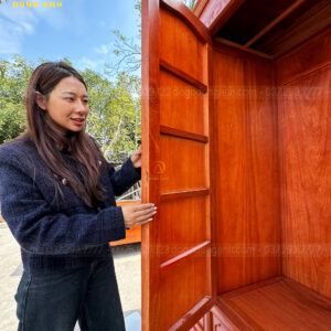 Mặt sau của tủ cùng được thiết kế từ chất liệu gỗ Gõ Đỏ như mặt trước đảm bảo không pha gỗ tạp và được thiết kế khung tranh ván liền được gia cố nhiều thang ngang chịu lực để đảm bảo độ chắc chắn, bền bỉ lâu dài cho sản phẩm.