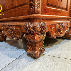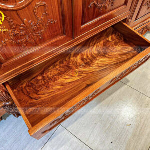 Mặt sau của tủ cùng được thiết kế từ chất liệu gỗ Gõ Hương Đá như mặt trước đảm bảo không pha gỗ tạp và được thiết kế khung tranh ván liền được gia cố nhiều thang ngang chịu lực để đảm bảo độ chắc chắn, bền bỉ lâu dài cho sản phẩm.