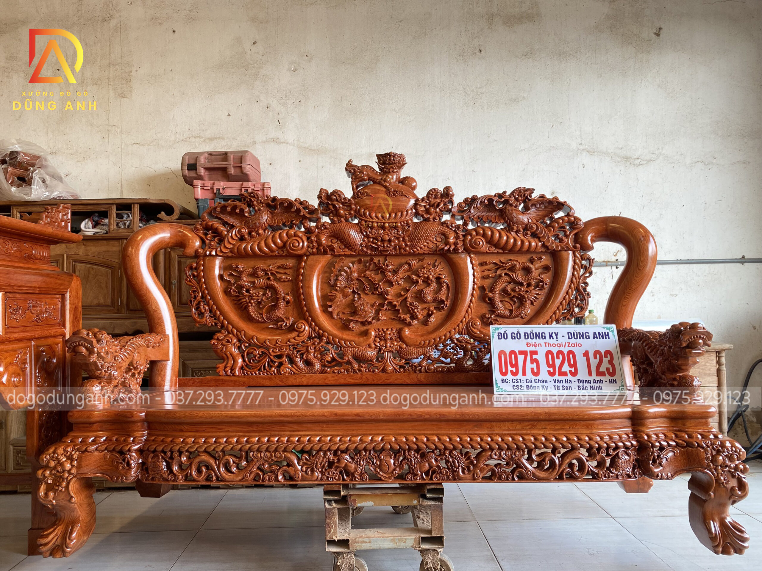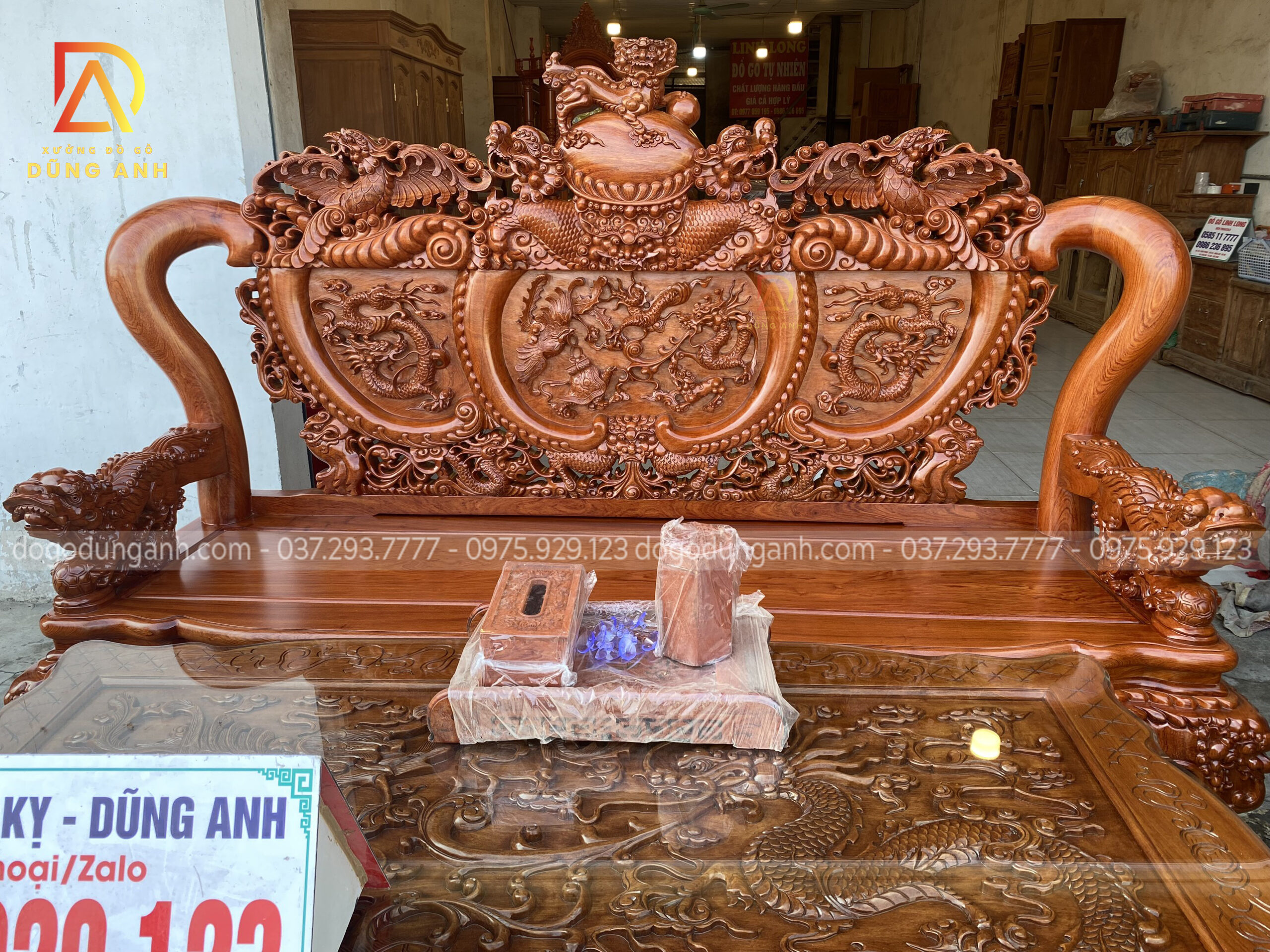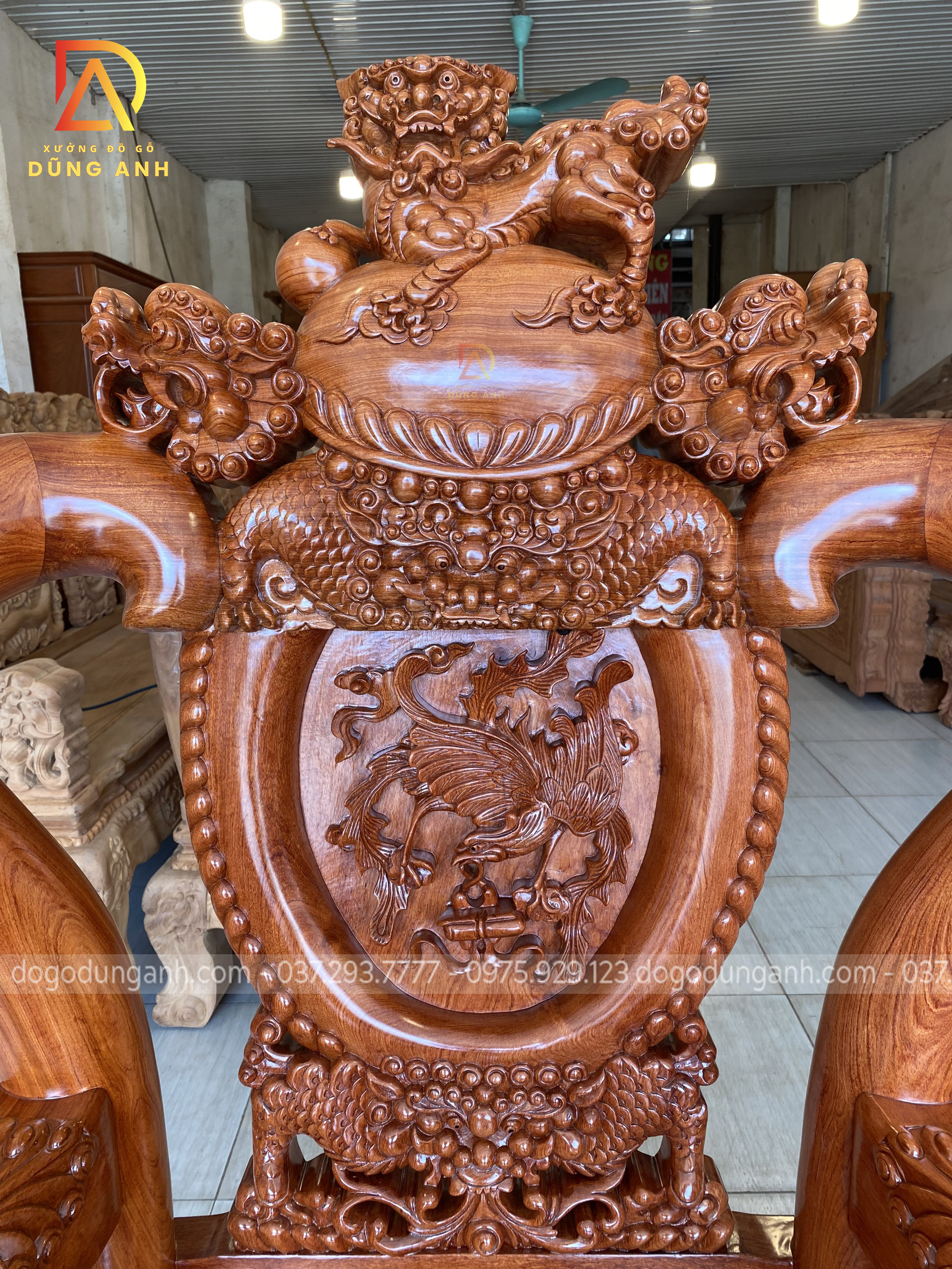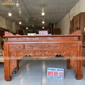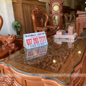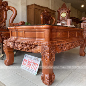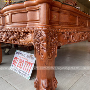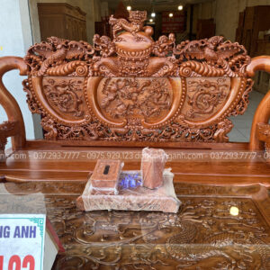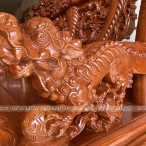 - Với 1 bản tựa dày 7 cm thì phải nó là nhìn rất là dày , phần tựa được đục trạm hóa tiết ” Tứ Linh Hội Tụ ” , những đường nét đục trạm đã được làm rất là sâu cho nên quý khách hàng có thể thấy những chi tiết vô cùng sắc nét .