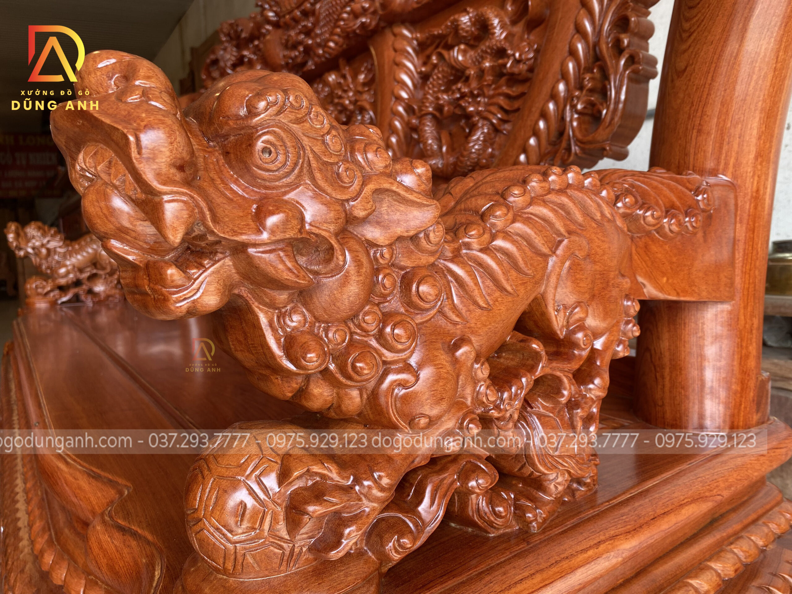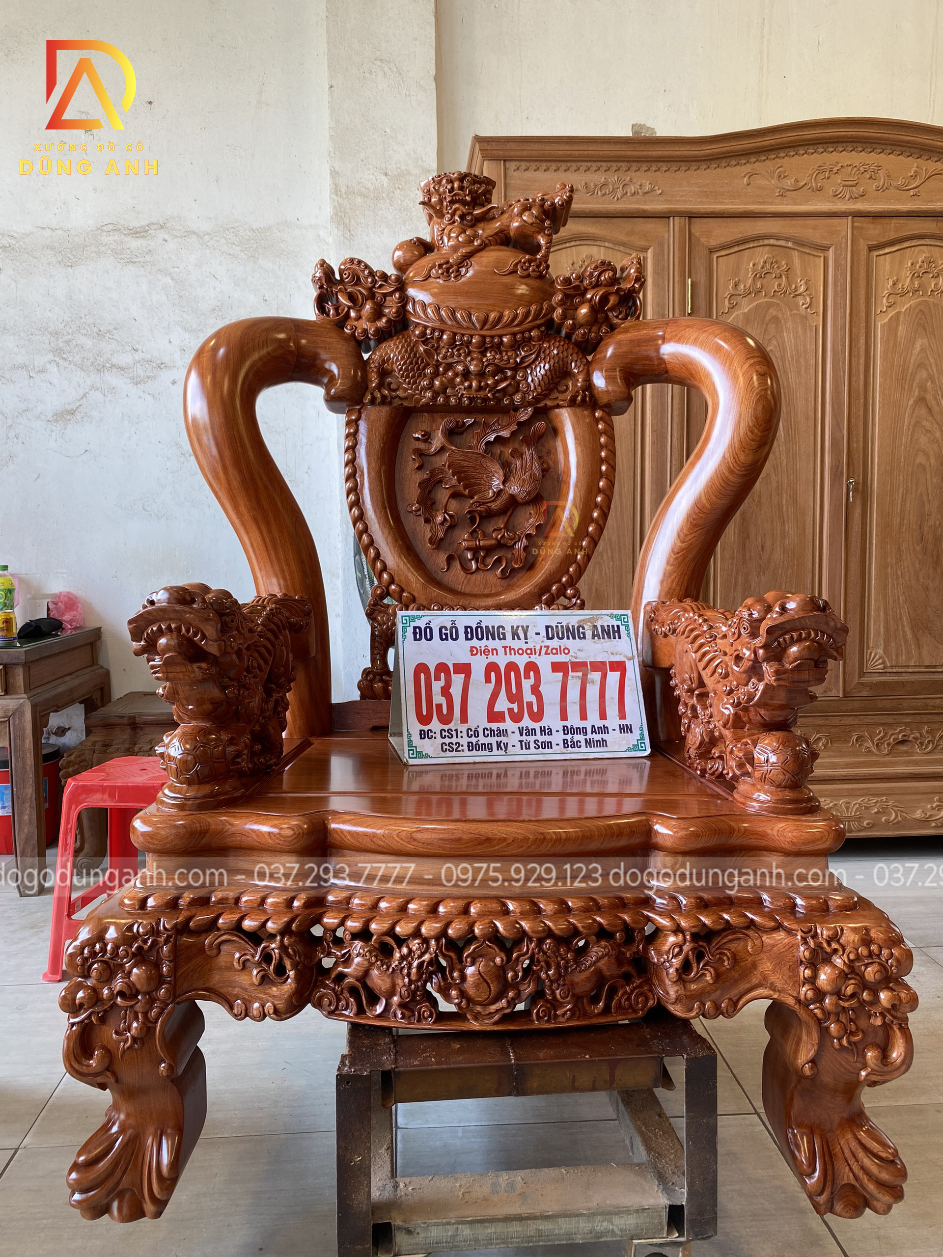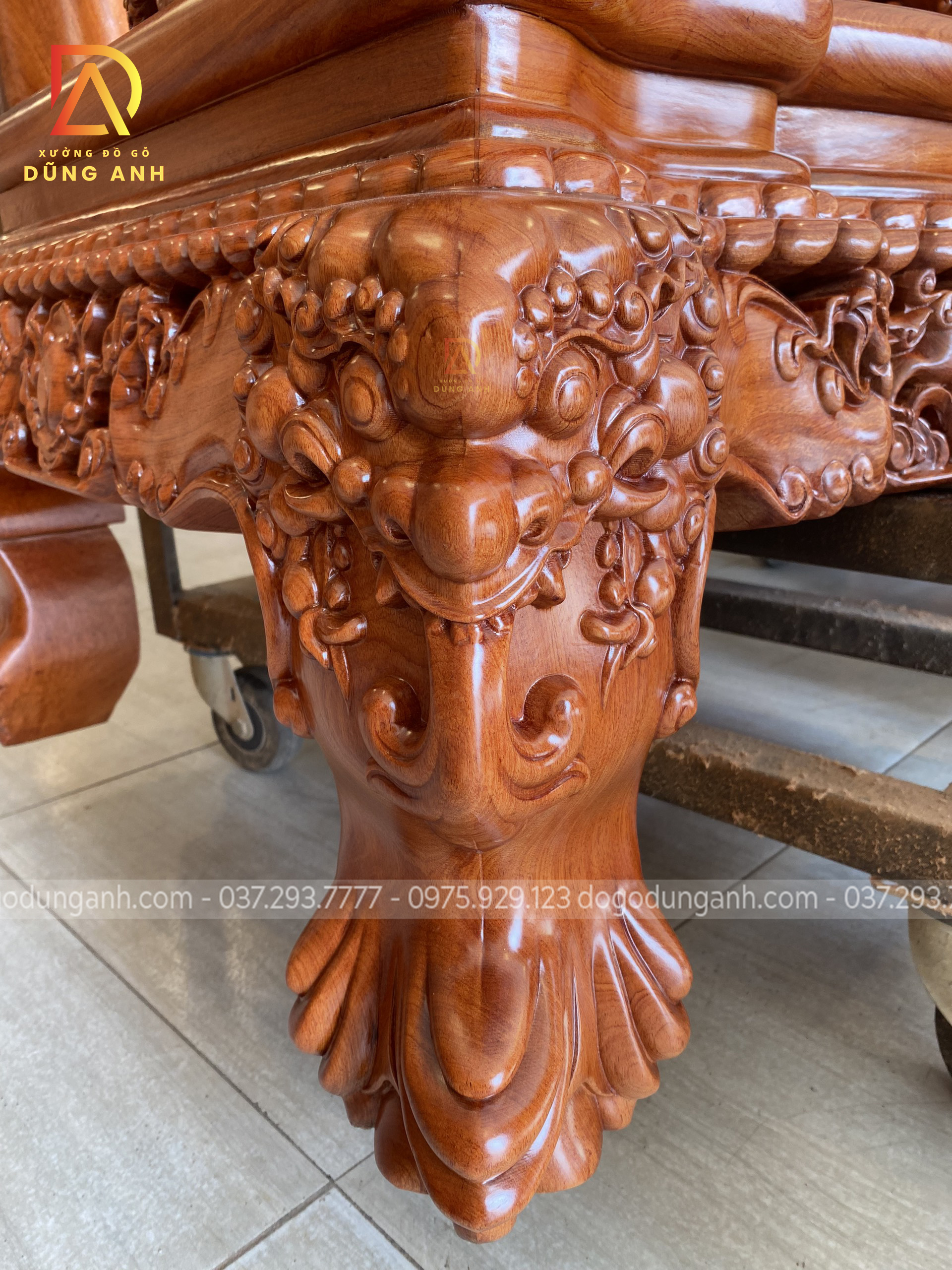 - Phần tay được đục trạm tỉ mỉ đến từng chi tiết hình tượng con Nghê ôm cầu , `1 biểu tượng chiêu tài hút lộc cho gia chủ