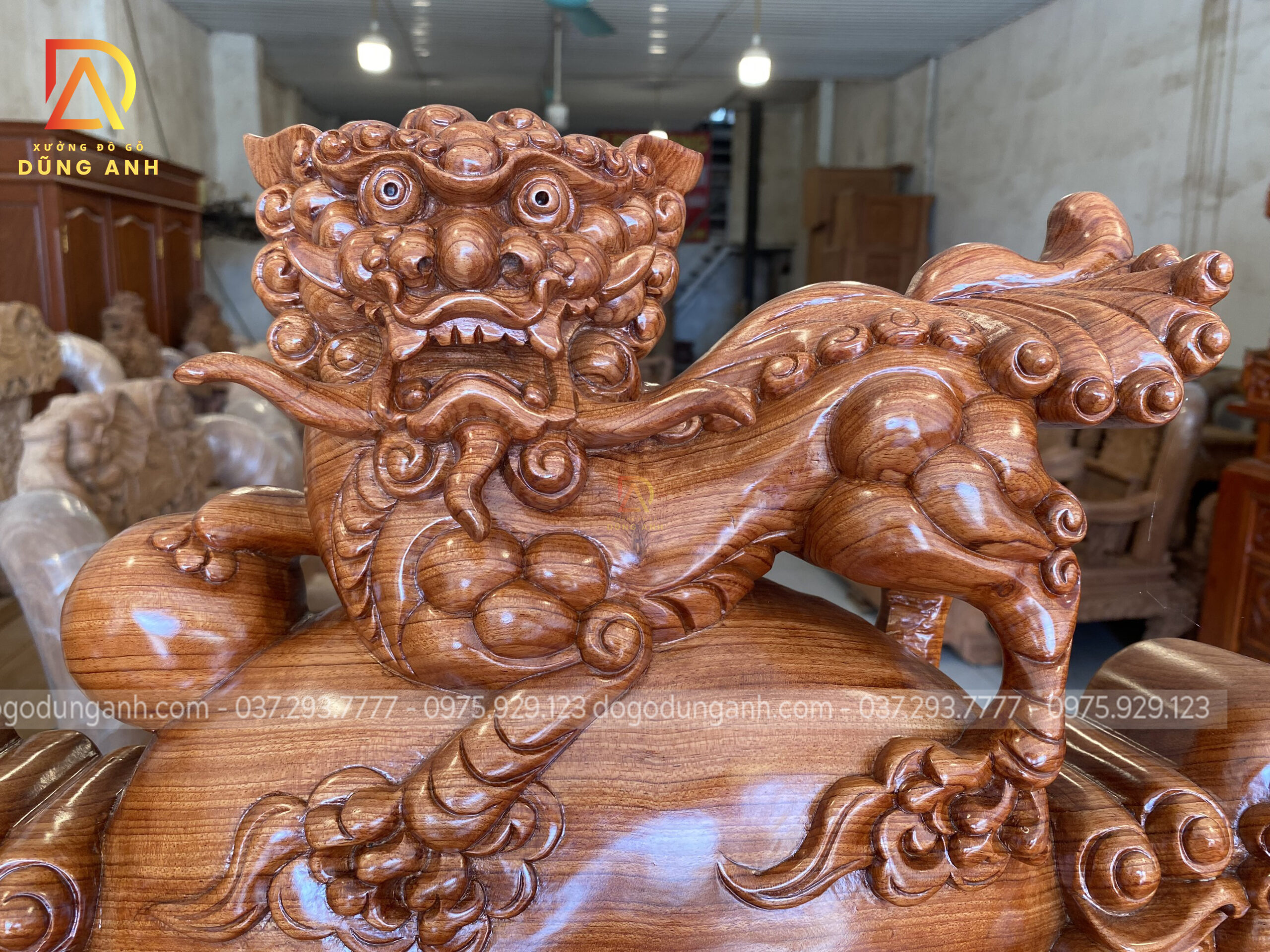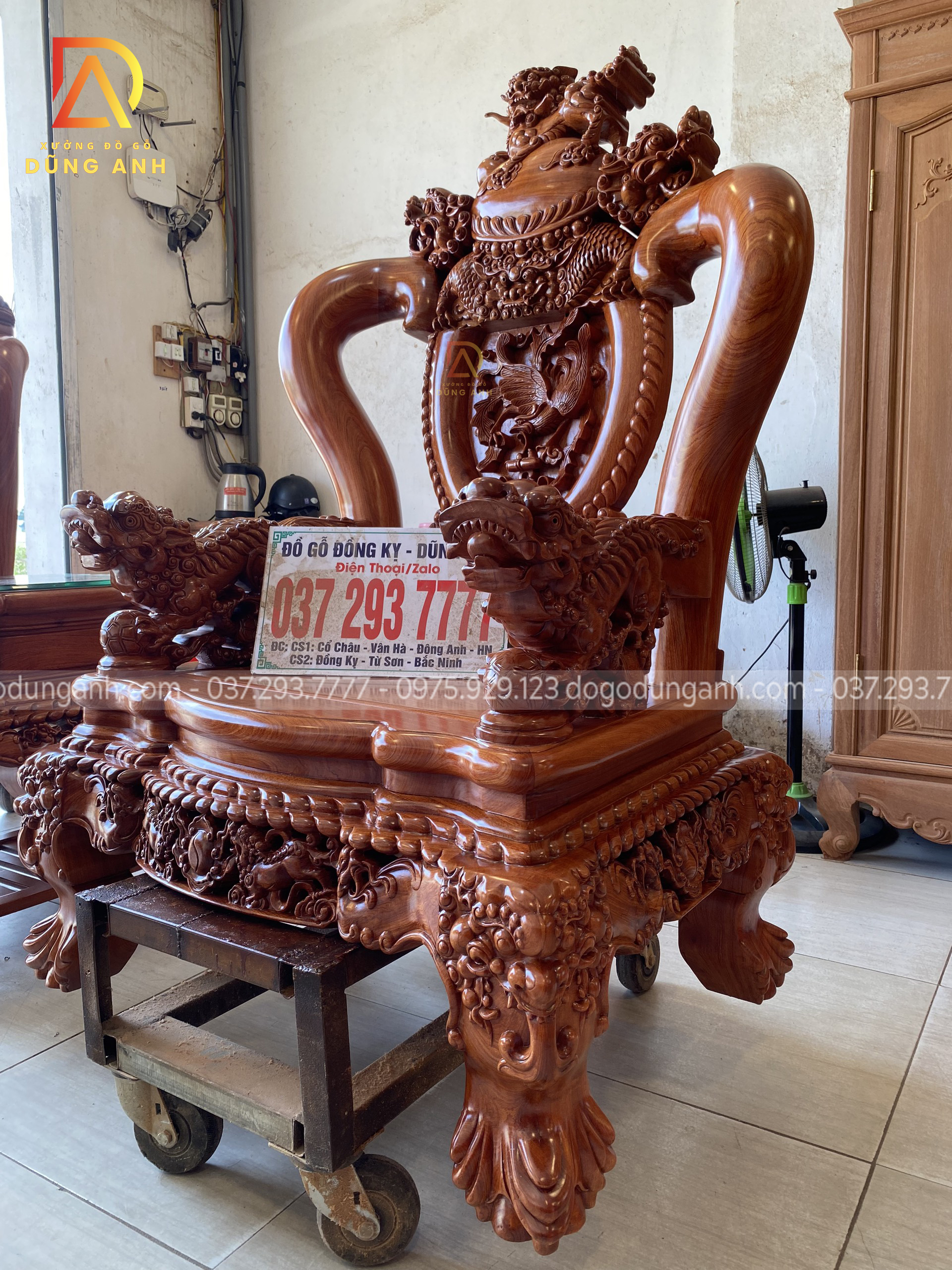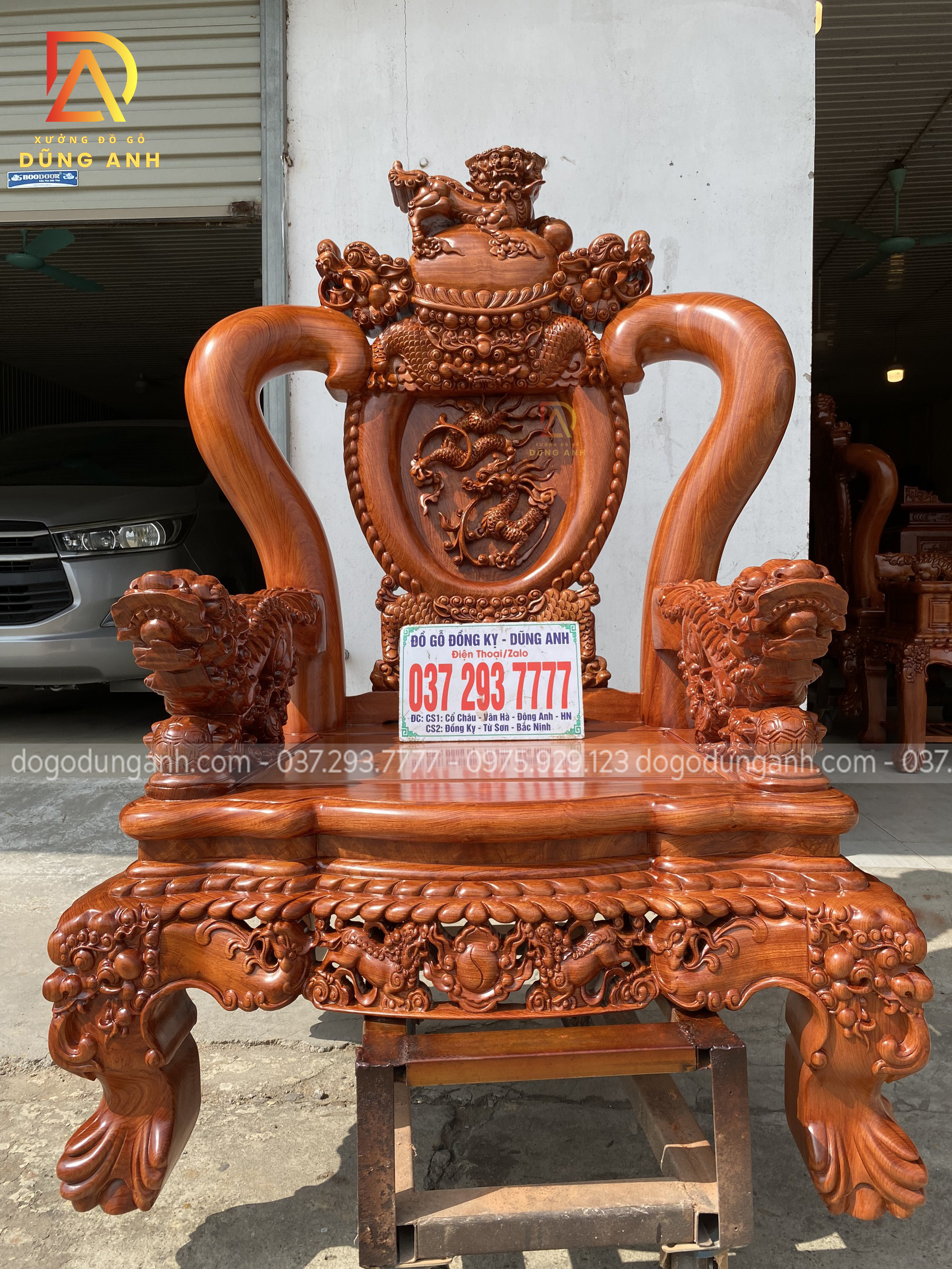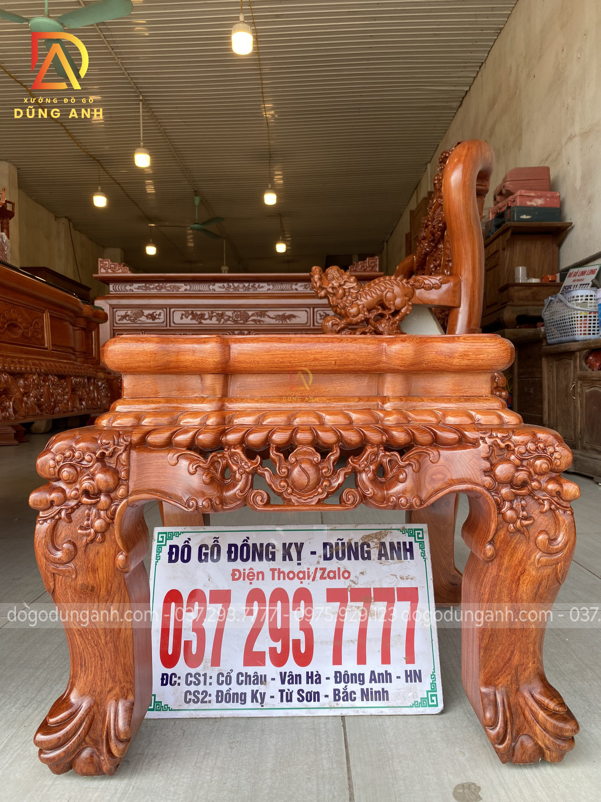 - Phần tay được đục trạm tỉ mỉ đến từng chi tiết hình tượng con Nghê ôm cầu , `1 biểu tượng chiêu tài hút lộc cho gia chủ