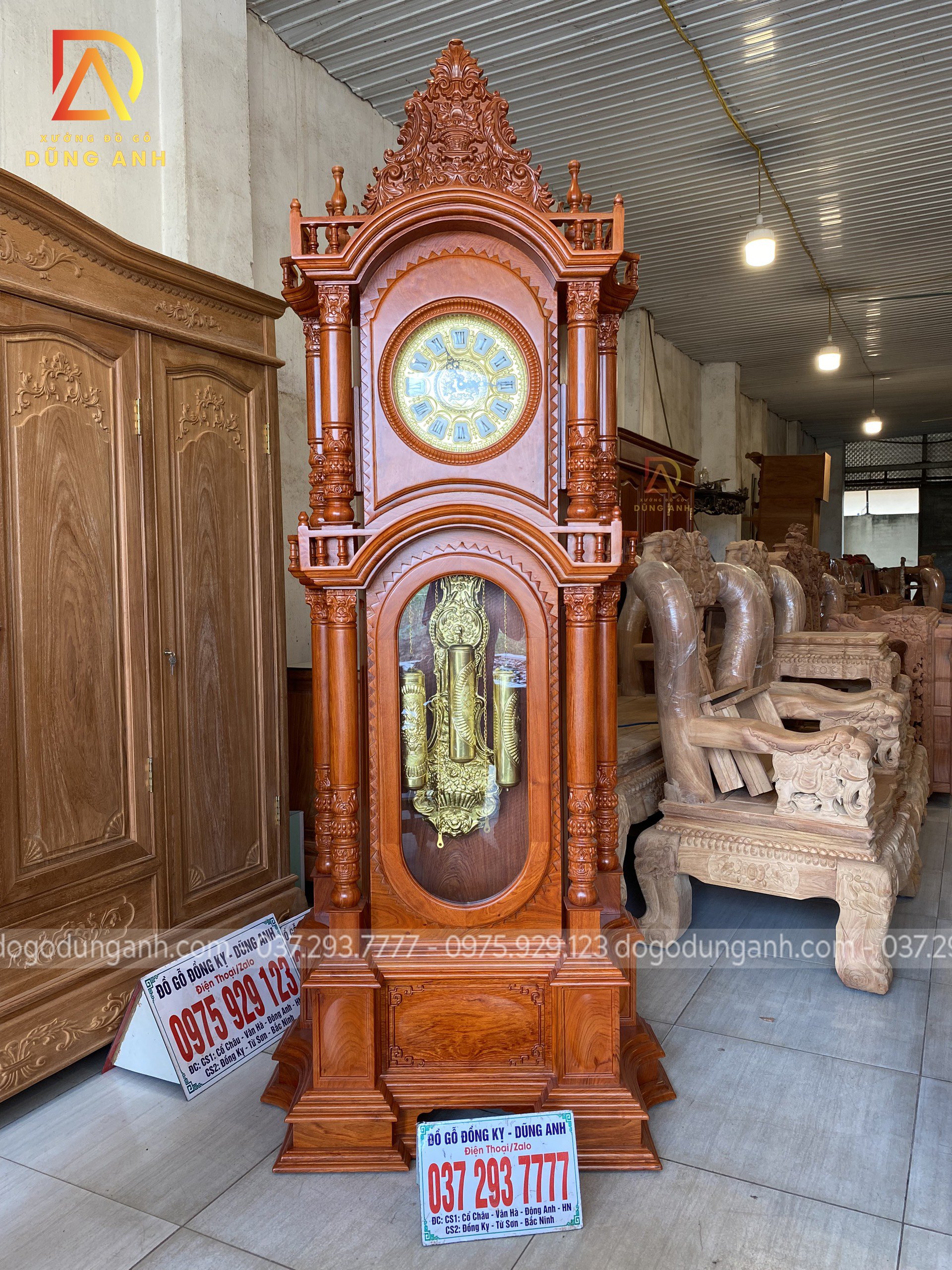 - Sản phẩm cuối cùng chính là cây đồng hồ đứng , cây đồng hồ này có chiều cao là 230 cm , kích thước là 83×40 cm và đồng chất liệu là gỗ Hương Đá